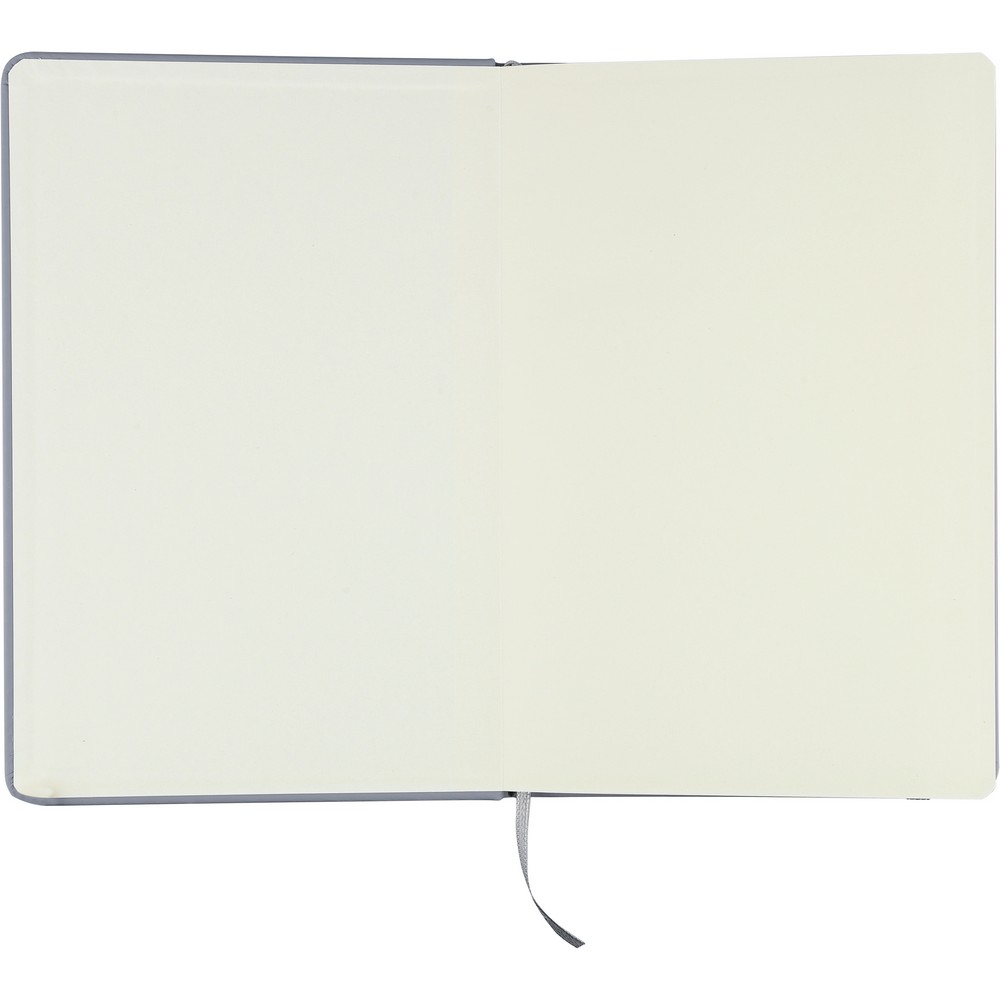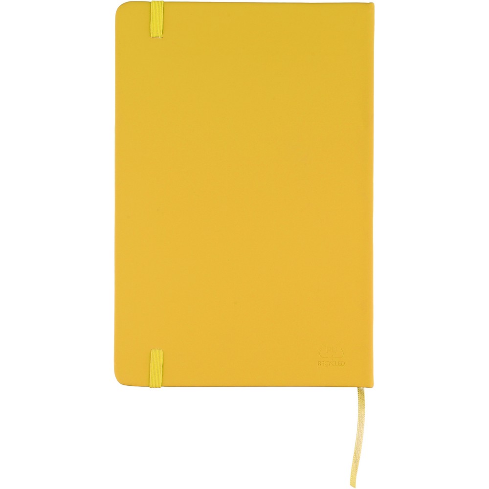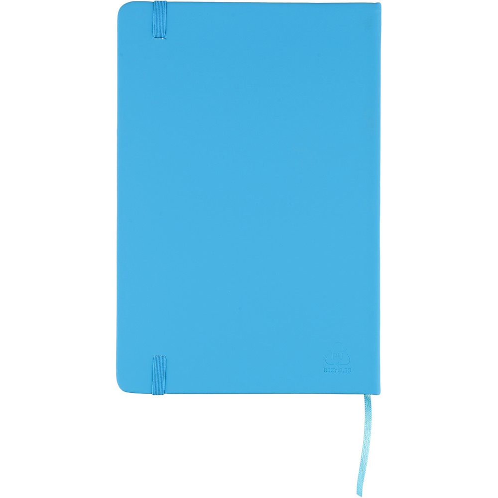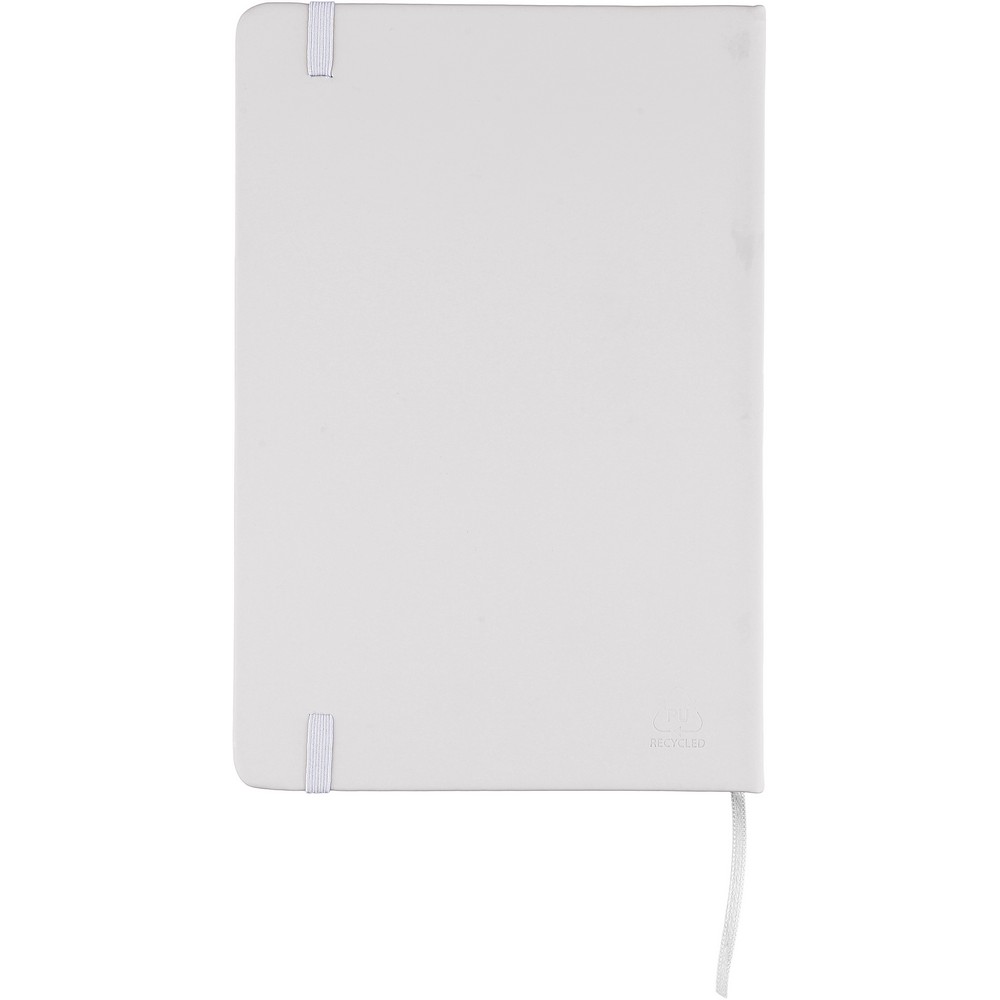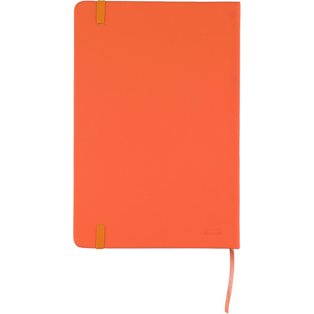 Notatnik ok. A5 RPET, z twardą okładką wykonaną z RPET PU, zawierający 80 stron w linie (70 g/m²), tasiemka zakładkowa umożliwia wygodne zaznaczanie ostatniej strony lub ważniejszych notatek, dodatkowe zamknięcie w postaci kolorowej elastycznej opaski, ikona recyklingu na tylnej stronie