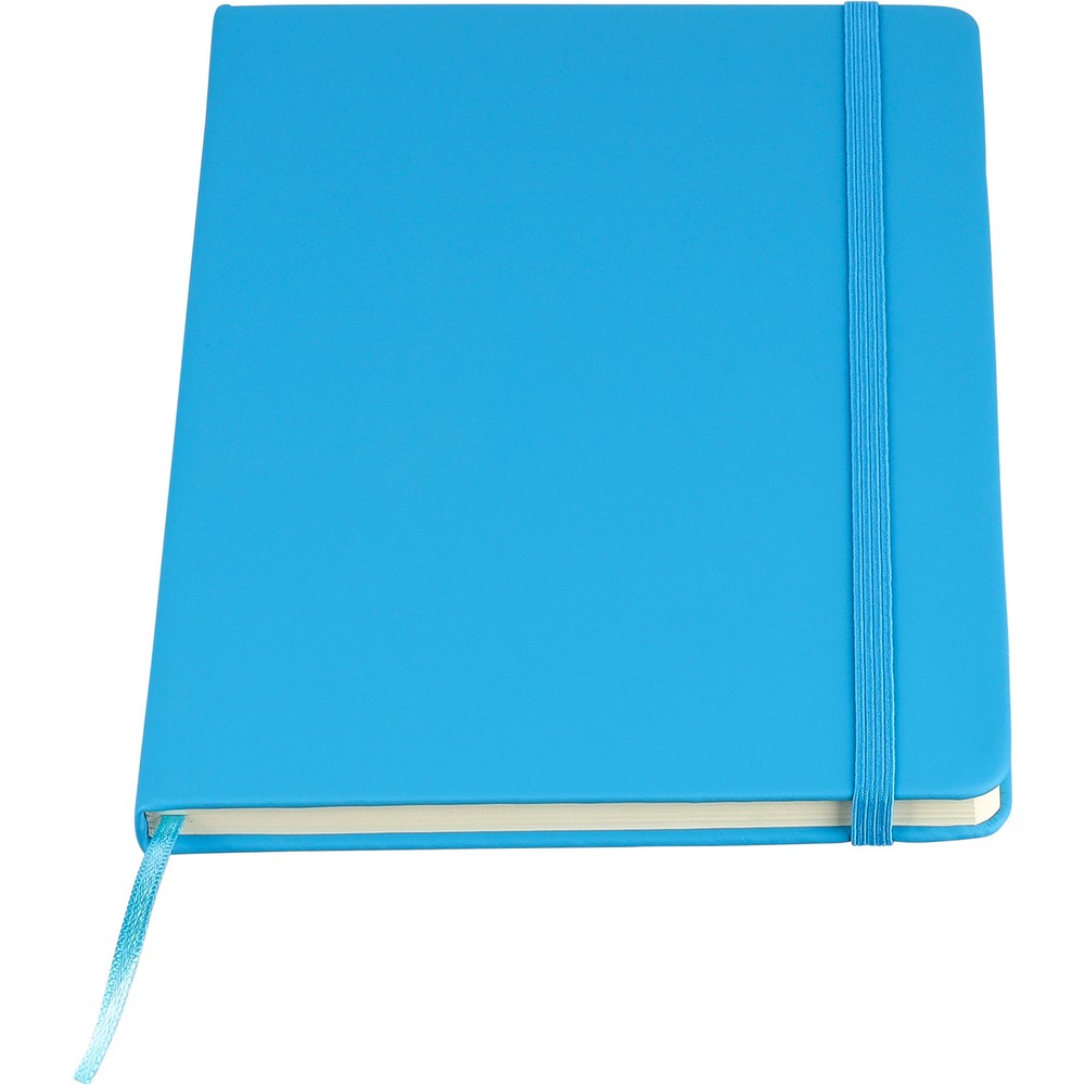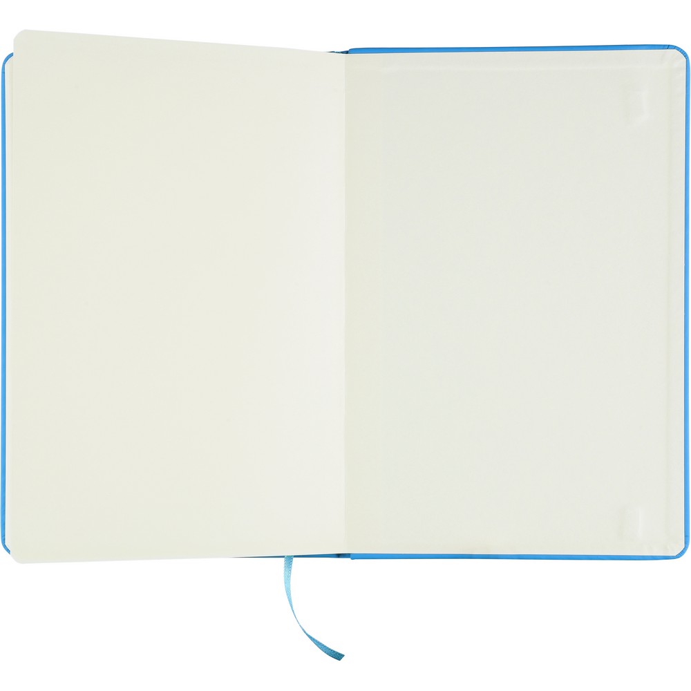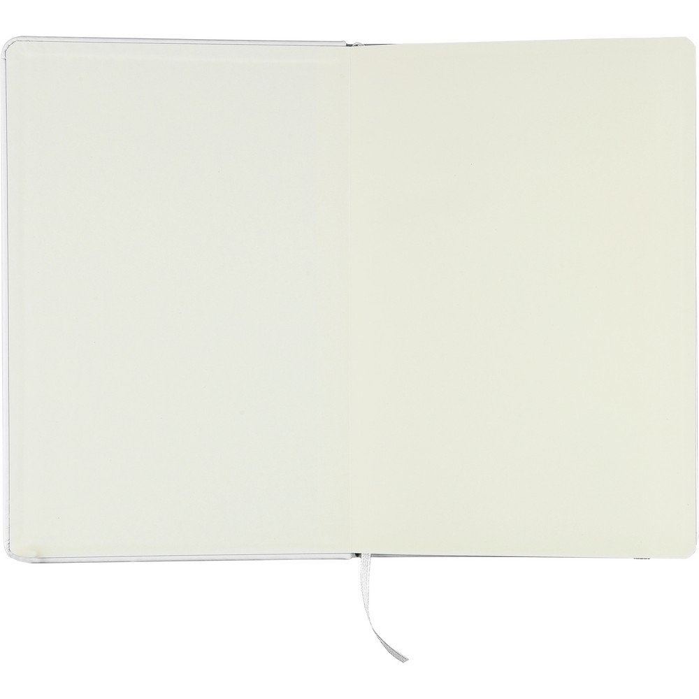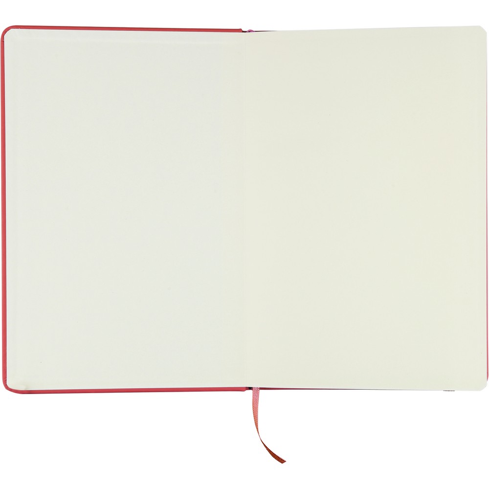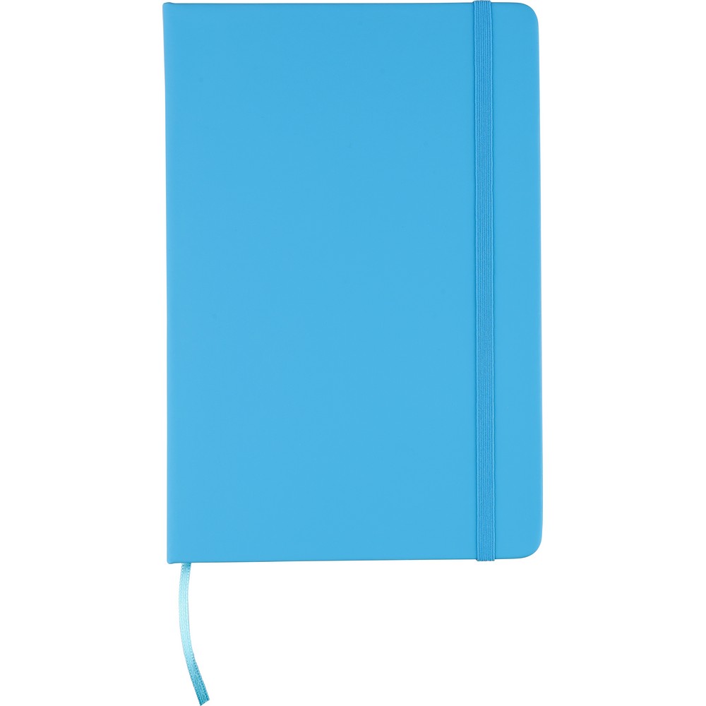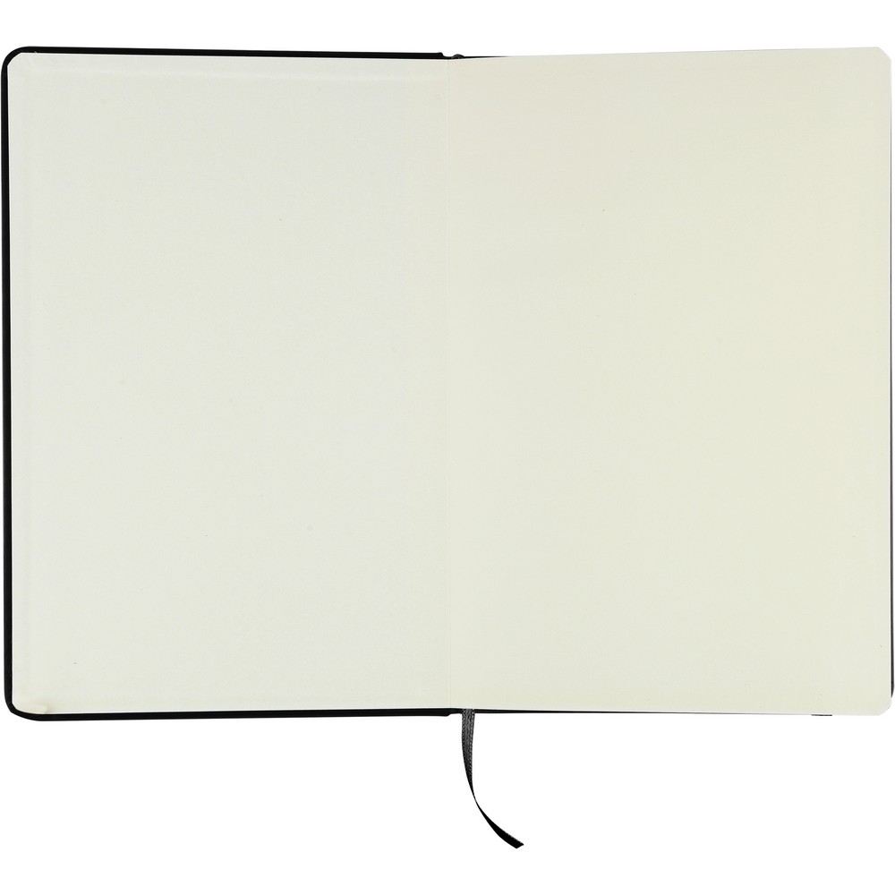Notatnik ok. A5 RPET, z twardą okładką wykonaną z RPET PU, zawierający 80 stron w linie (70 g/m²), tasiemka zakładkowa umożliwia wygodne zaznaczanie ostatniej strony lub ważniejszych notatek, dodatkowe zamknięcie w postaci kolorowej elastycznej opaski, ikona recyklingu na tylnej stronie