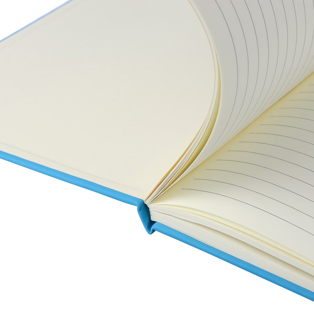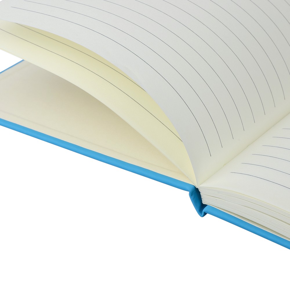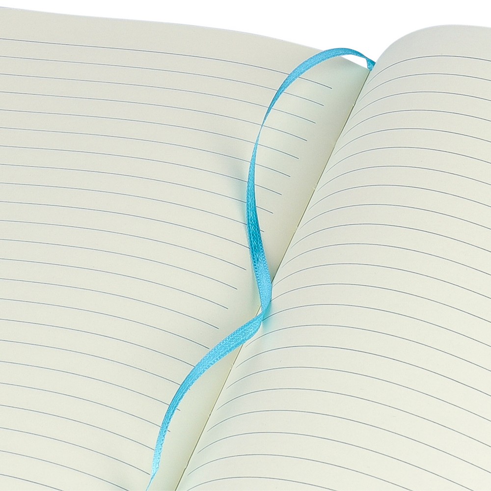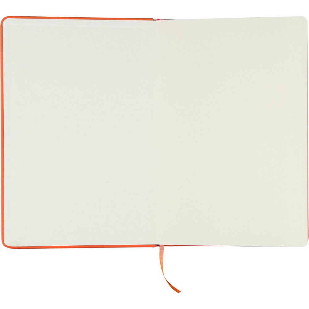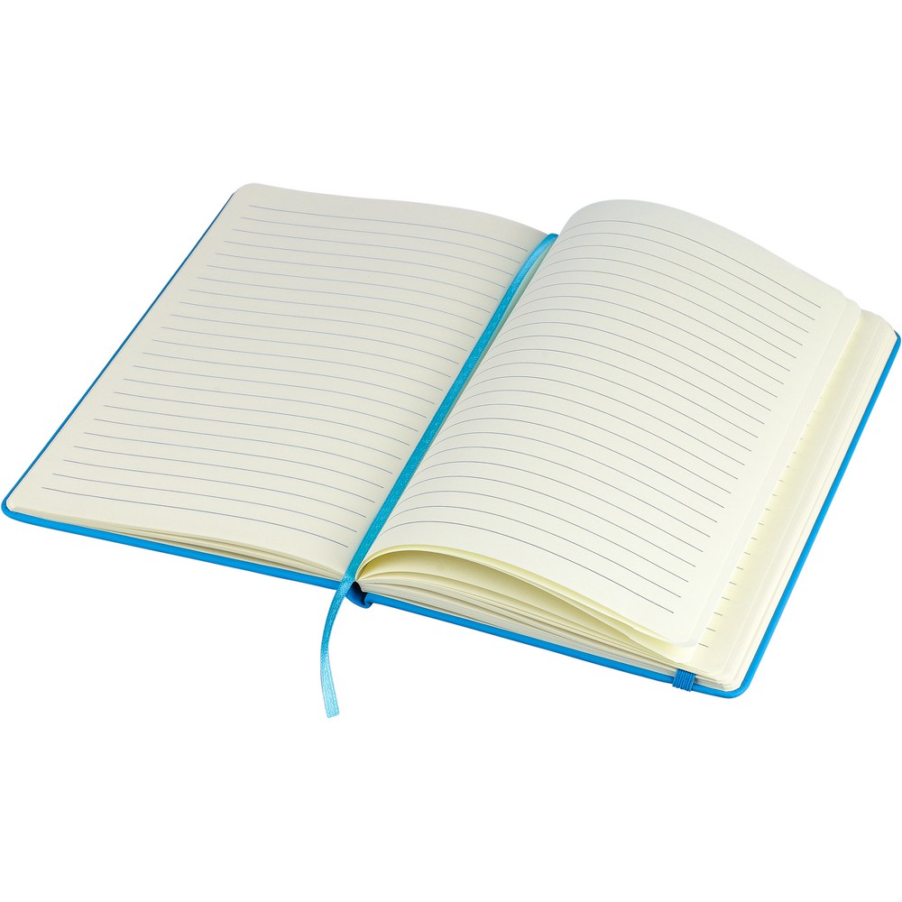 Notatnik ok. A5 RPET, z twardą okładką wykonaną z RPET PU, zawierający 80 stron w linie (70 g/m²), tasiemka zakładkowa umożliwia wygodne zaznaczanie ostatniej strony lub ważniejszych notatek, dodatkowe zamknięcie w postaci kolorowej elastycznej opaski, ikona recyklingu na tylnej stronie