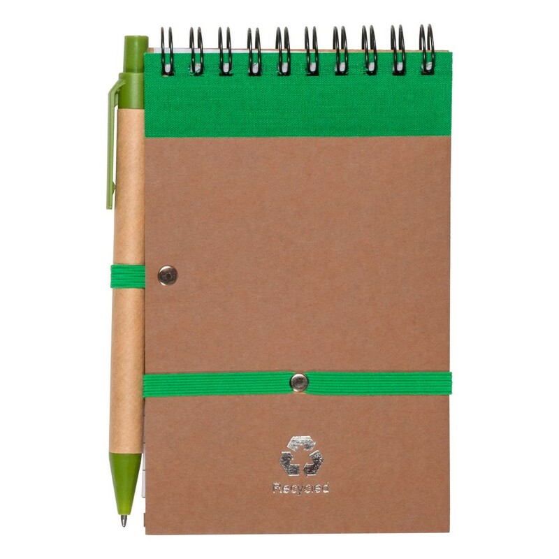 Notatnik reporterski w kieszonkowym formacie ok. A6, posiada 70 kartek w linie (140 stron) i spiralne bindowanie, dodatkowe zamknięcie w postaci dopasowanej kolorystycznie elastycznej opaski, w komplecie znajduje się długopis z kolorowymi elementami, wkład w niebieskim kolorze, produkt wykonany między innymi z kartonu