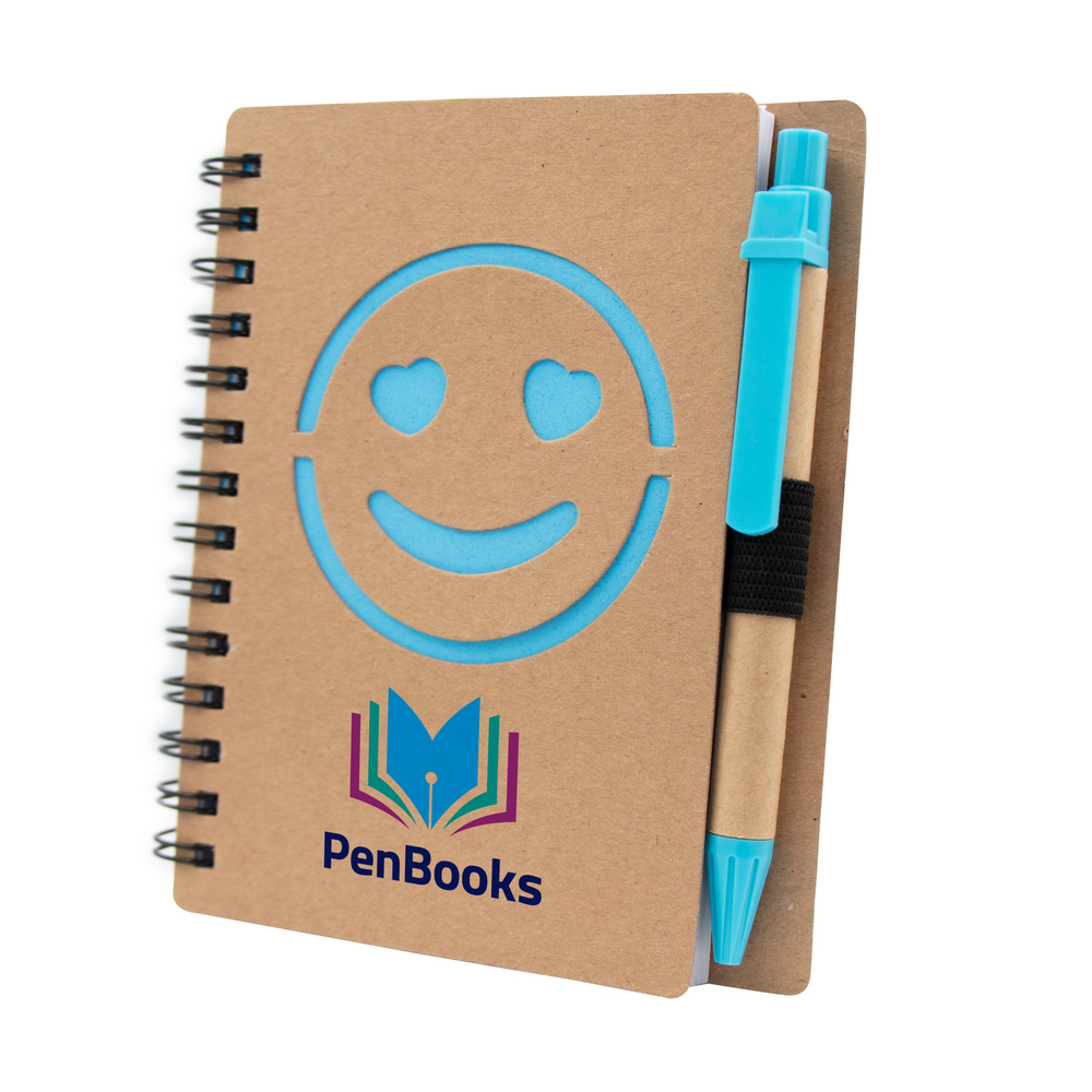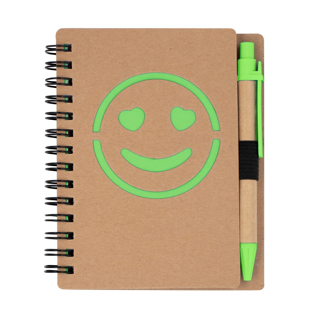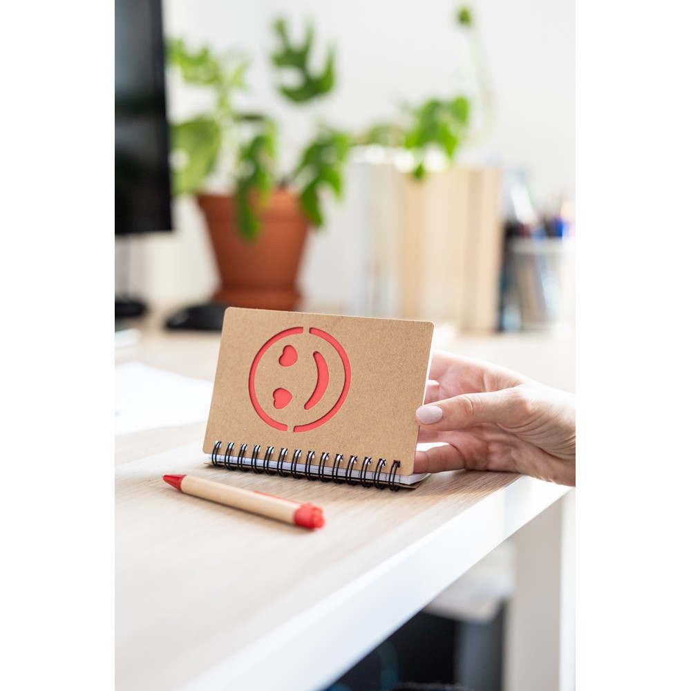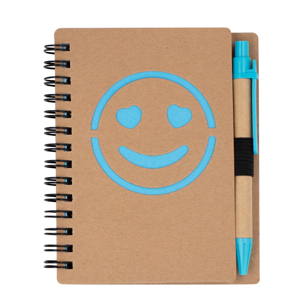 Notatnik „uśmiechnięta buzia” w formacie ok. B7, posiada 60 kartek w linie (120 stron) i spiralne bindowanie, w komplecie znajduje się długopis z kolorowymi elementami i wkładem w niebieskim kolorze, produkt wykonany z papieru i plastiku