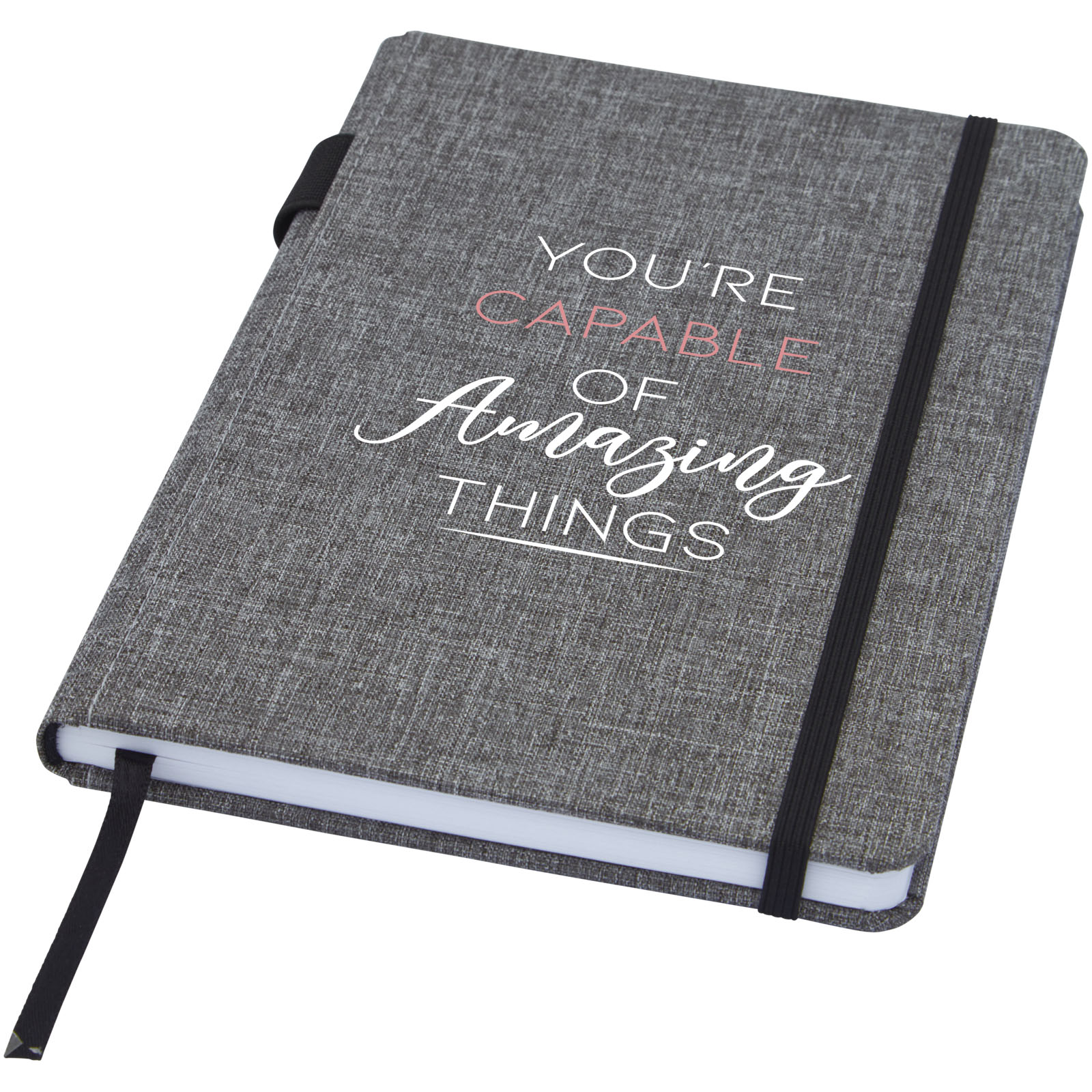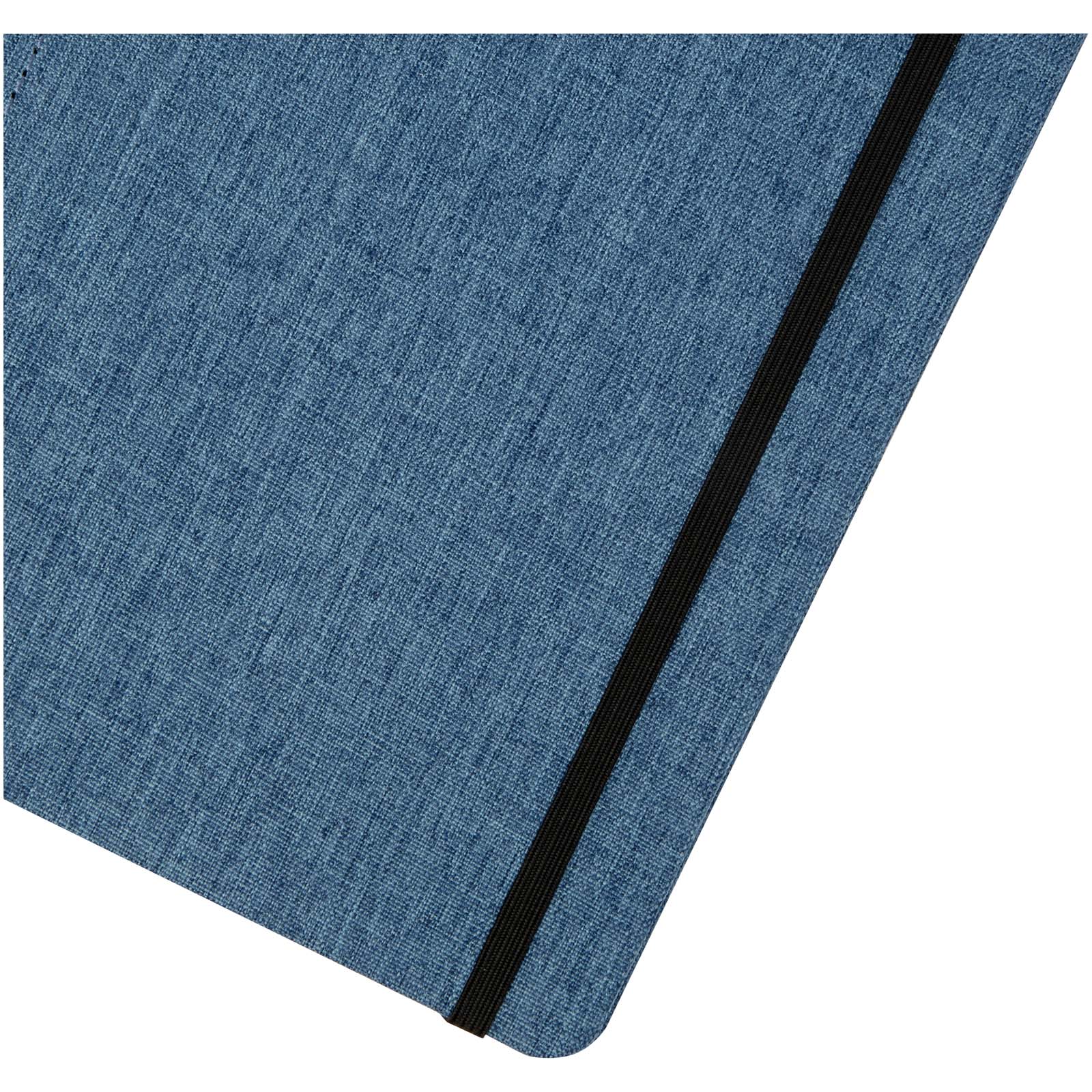 Notatnik w formacie A5 z okładką wykonaną z materiału RPET. Posiada 96 arkuszy w linie o gramaturze 70 g/m² z papieru z recyclingu, pętelkę na pióro i wstążkę. Pakowany w kartonowe opakowanie.