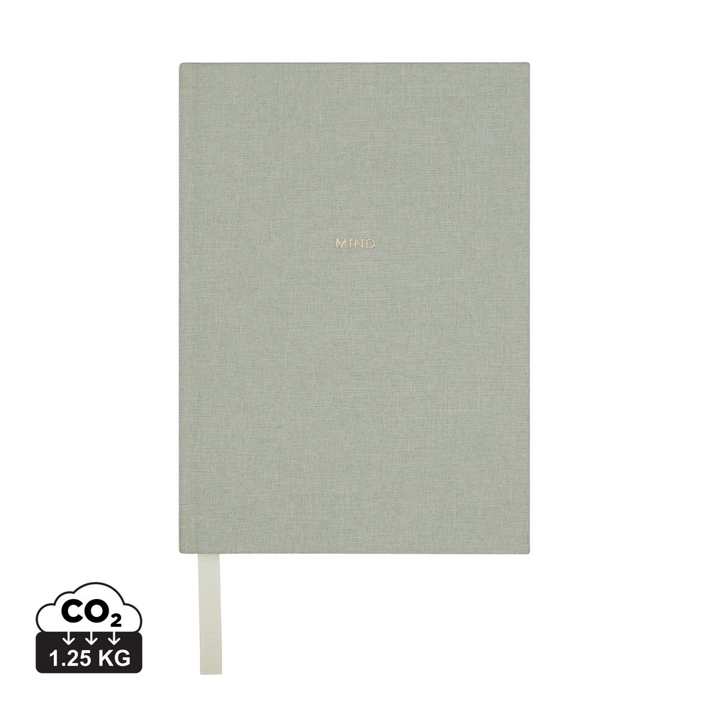 Notatnik A5, miękka okładka, tasiemka zakładkowa, wykonany z materiałów z recyklingu, notatnik zawiera podpowiedzi oraz pytania dotyczące minionego dnia oraz refleksji, pomaga porządkować myśli, całkowita zawartość materiałów z recyklingu obliczona w oparciu o wagę całkowitą przedmiotu: 73%