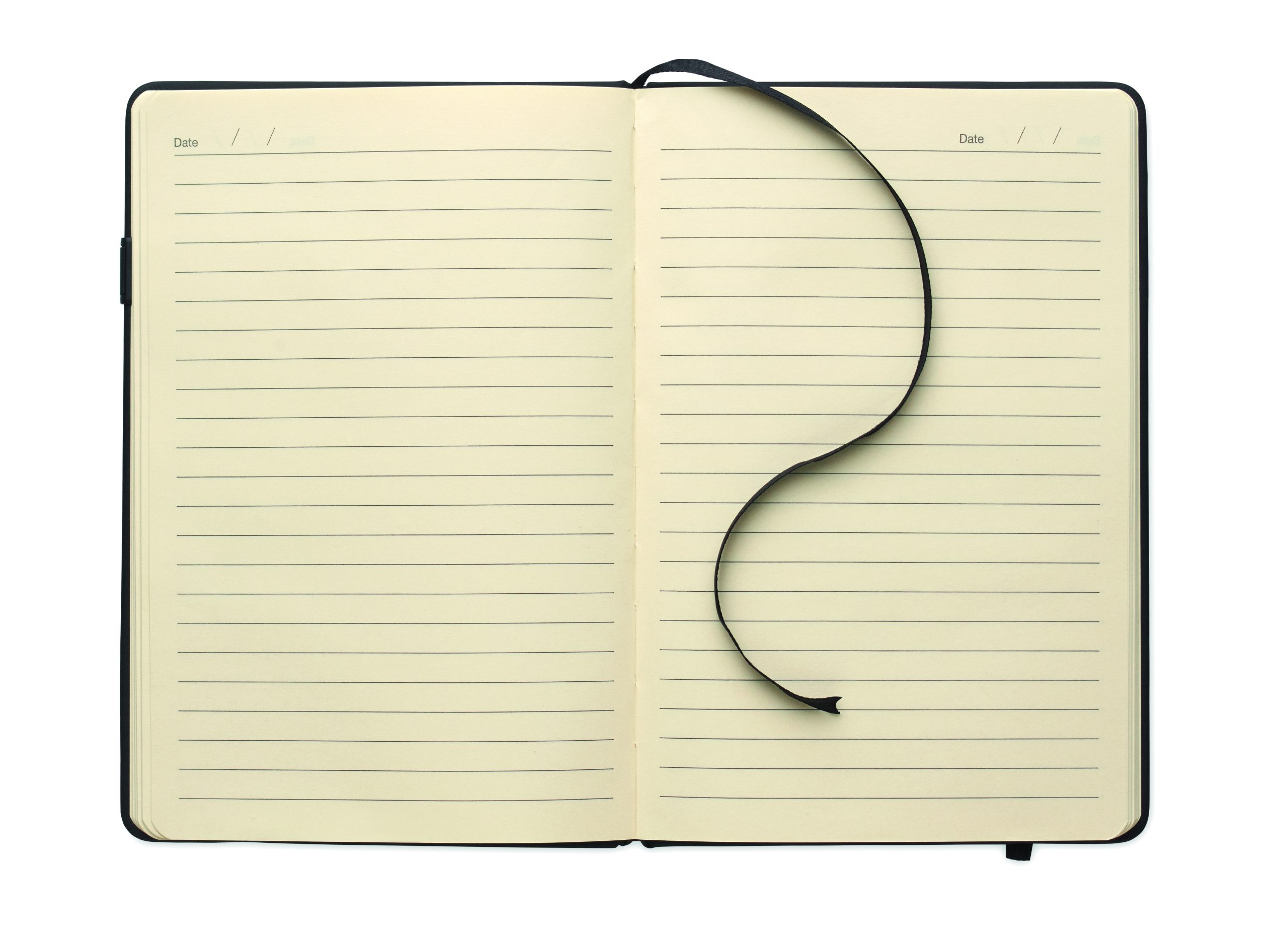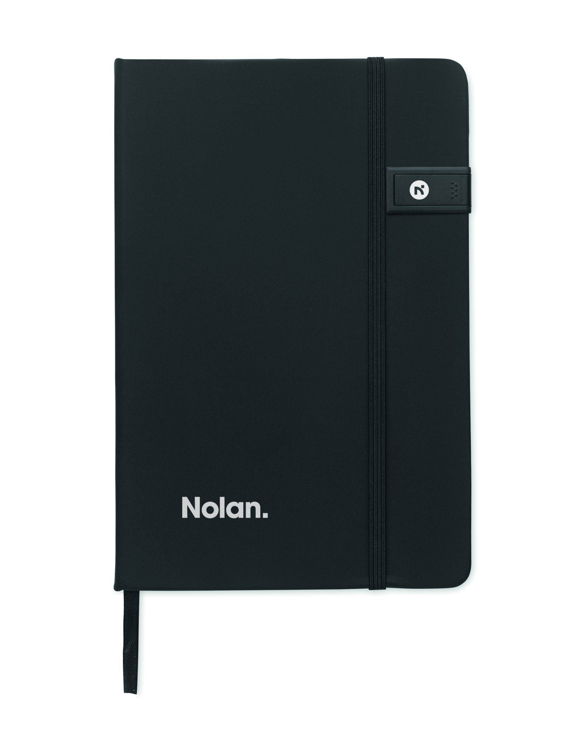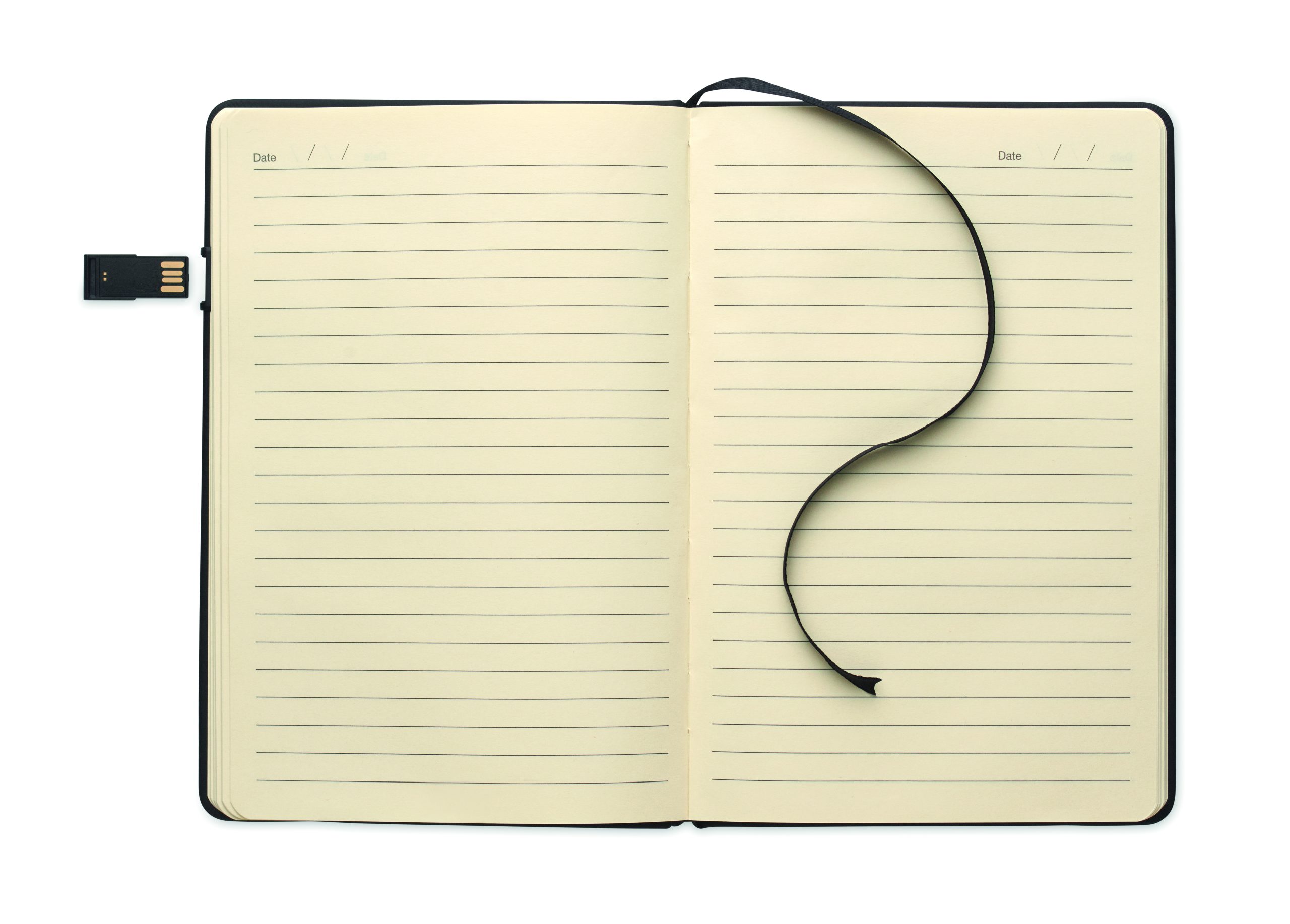 Notes A5 w twardej oprawie, wykonany w 58% z poliestru pochodzącego z recyklingu i w 42% z poliuretanu, z wbudowaną pamięcią USB 16 GB. Oprawiony w etui. 160 stron w linie z papieru z recyklingu (80 arkuszy). Dopasowany elastyczny pasek i tasiemka do oznaczania stron. FSC®-certified | FSC MIX CREDIT, P7.1, FSC-C213206