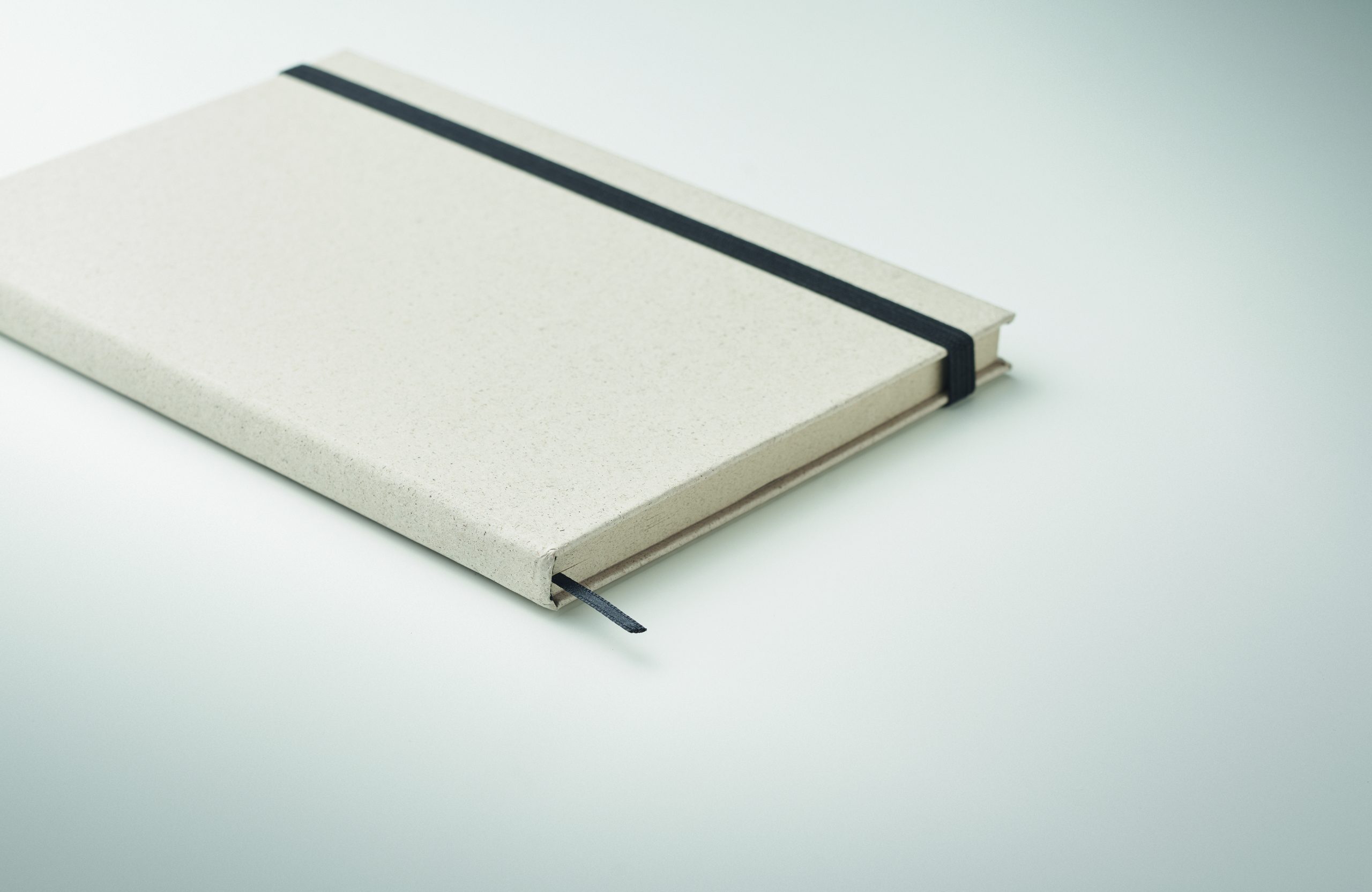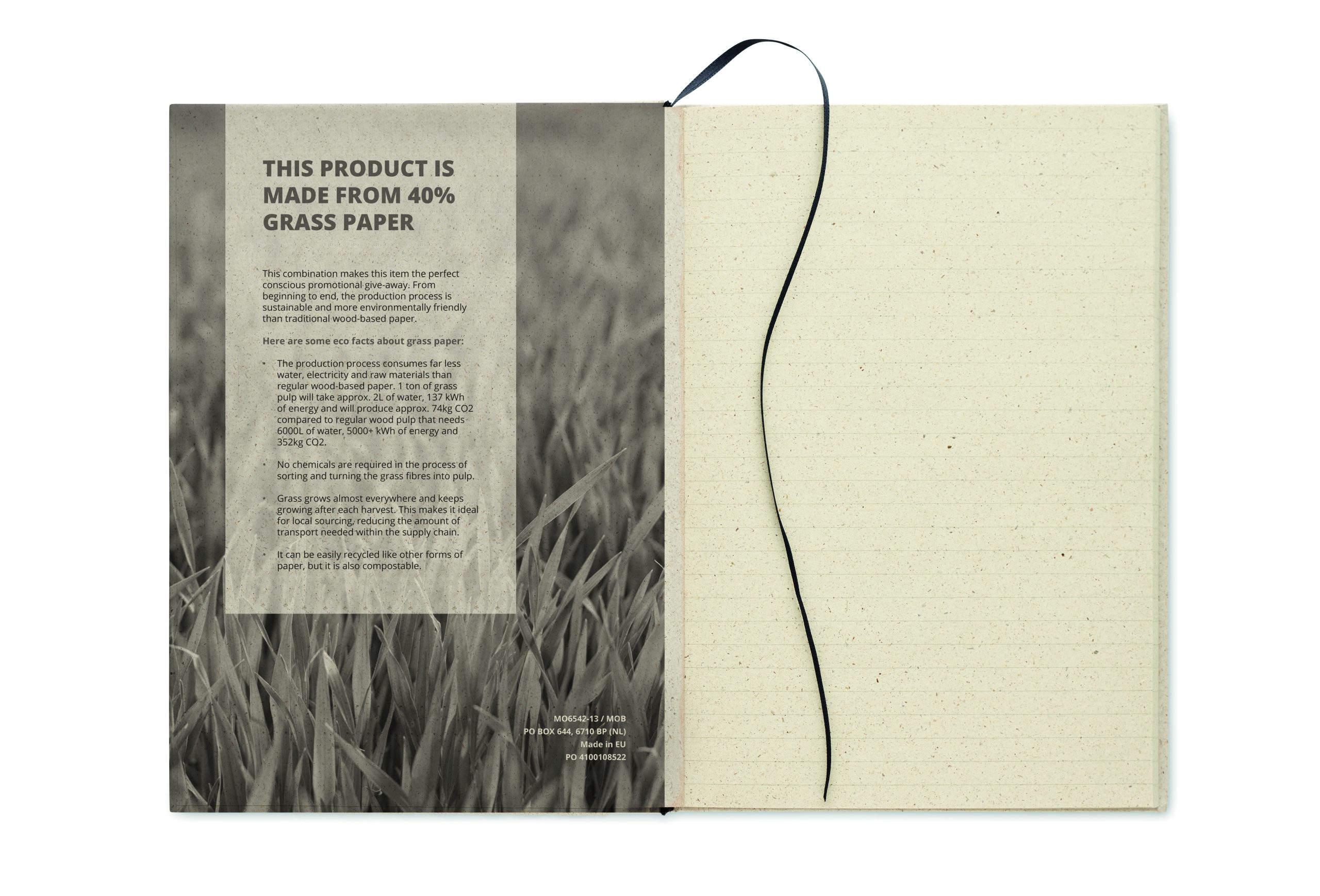 Notatnik A5 z 80 kartkami w linie z papieru z włókien trawy i kartonową okładką. Idealny na spotkania w biurze lub zajęcia w szkole. Papier z trawy to doskonały i świadomy upominek promocyjny. Proces produkcji jest zrównoważony od początku do końca i bardziej przyjazny dla środowiska niż tradycyjny papier drewnopochodny. Wyprodukowano w UE.