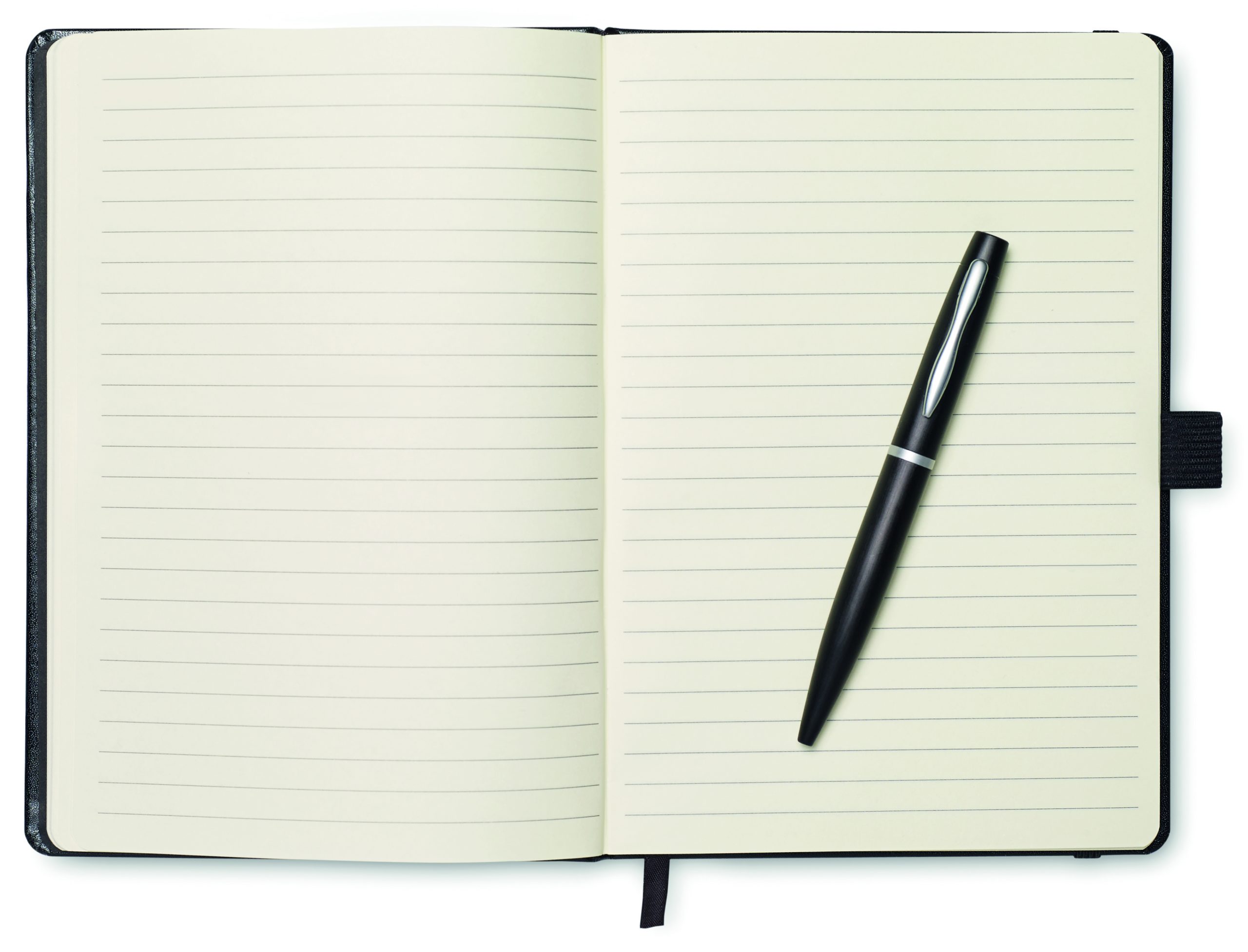 Notes A5 z długopisem. Twarda okładka z PU. 144 strony w linie (72 arkusze). Dopasowany elastyczny pasek zamykający i uchwyt na długopis. Dopasowany metalowy długopis z przyciskiem. Niebieski tusz. FSC MIX CREDIT | P7.1 | FSC-C213206