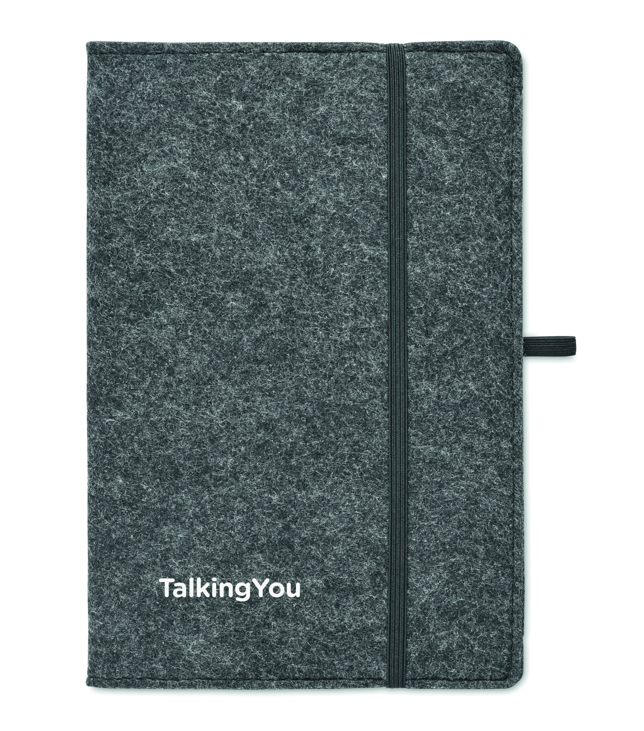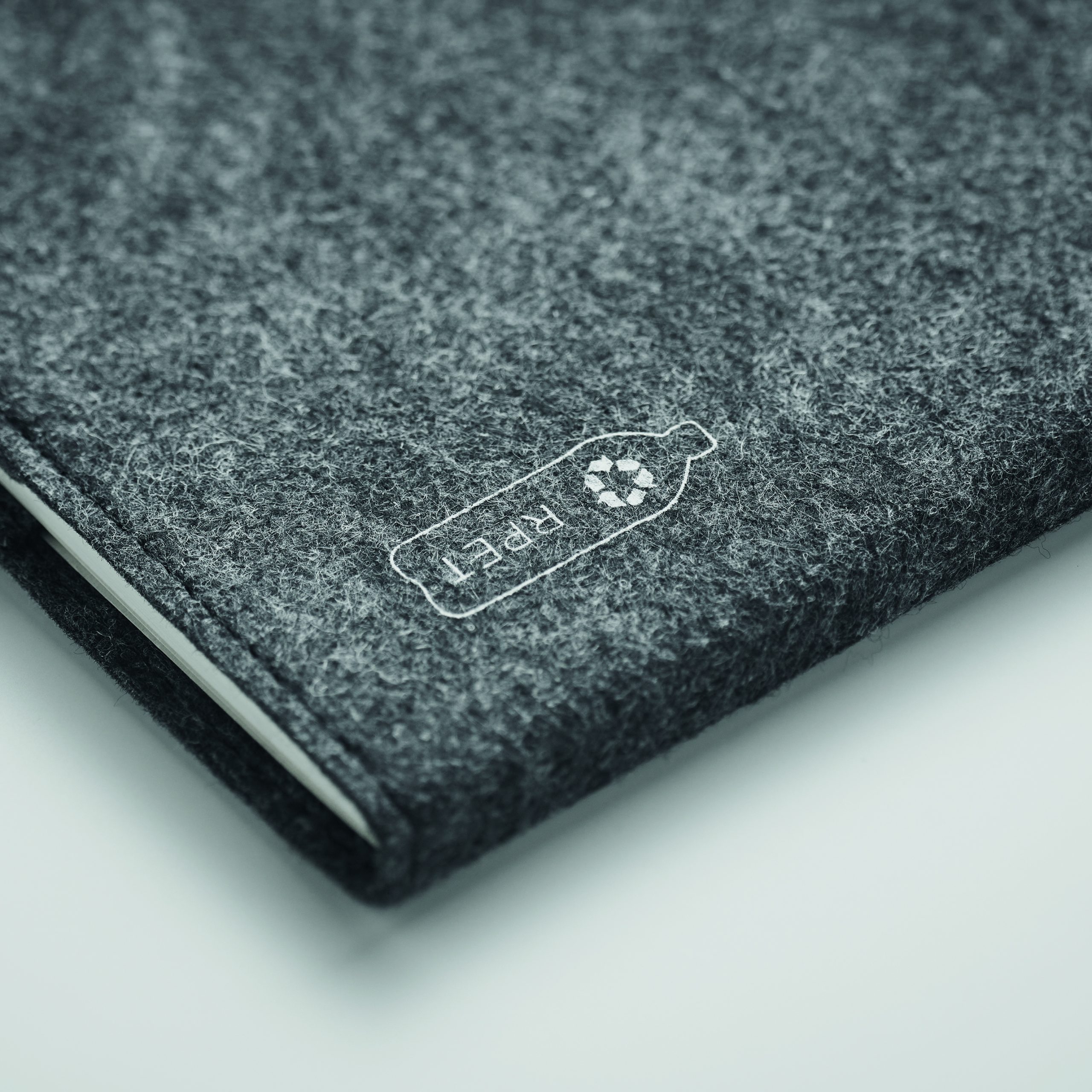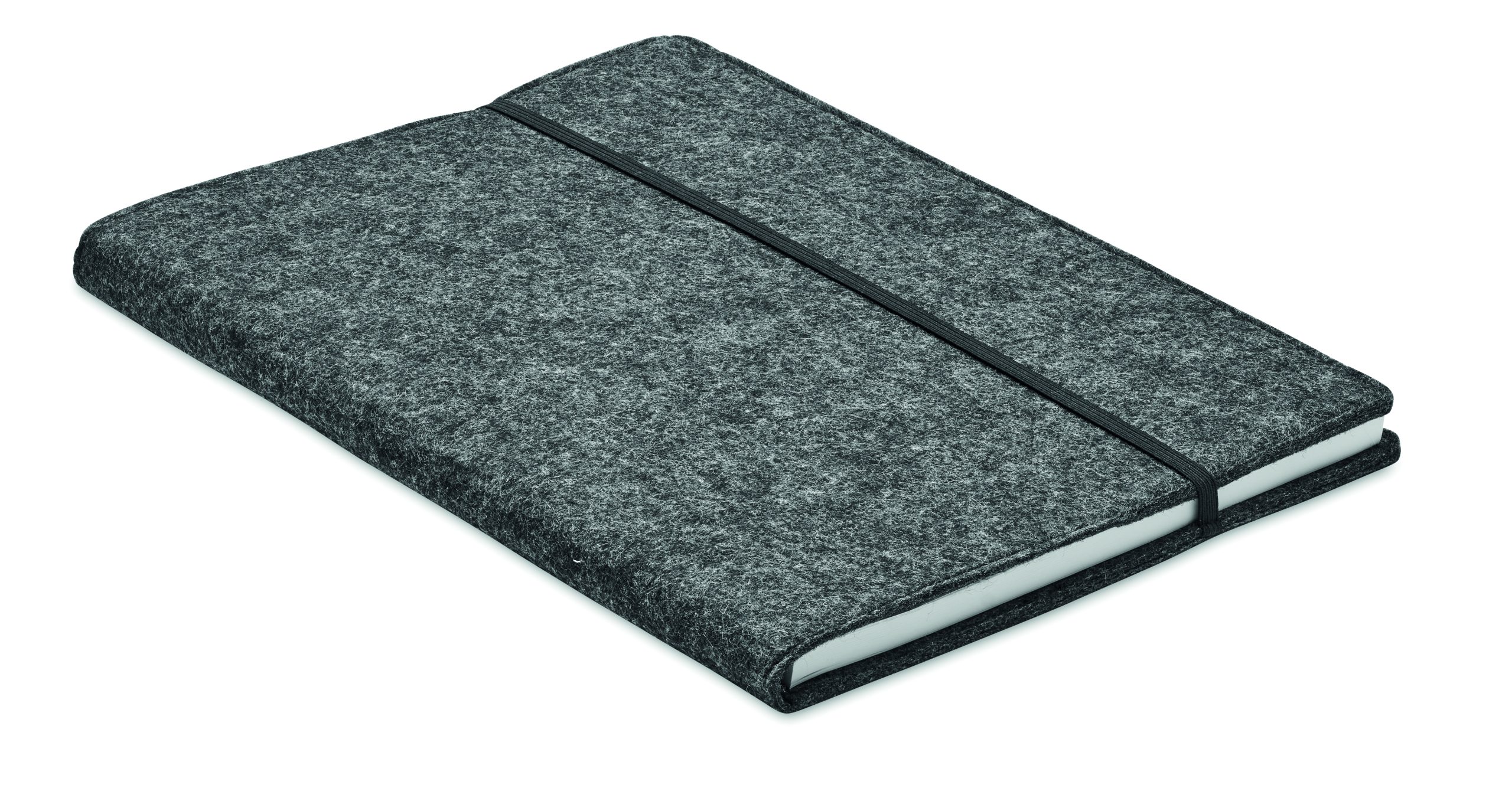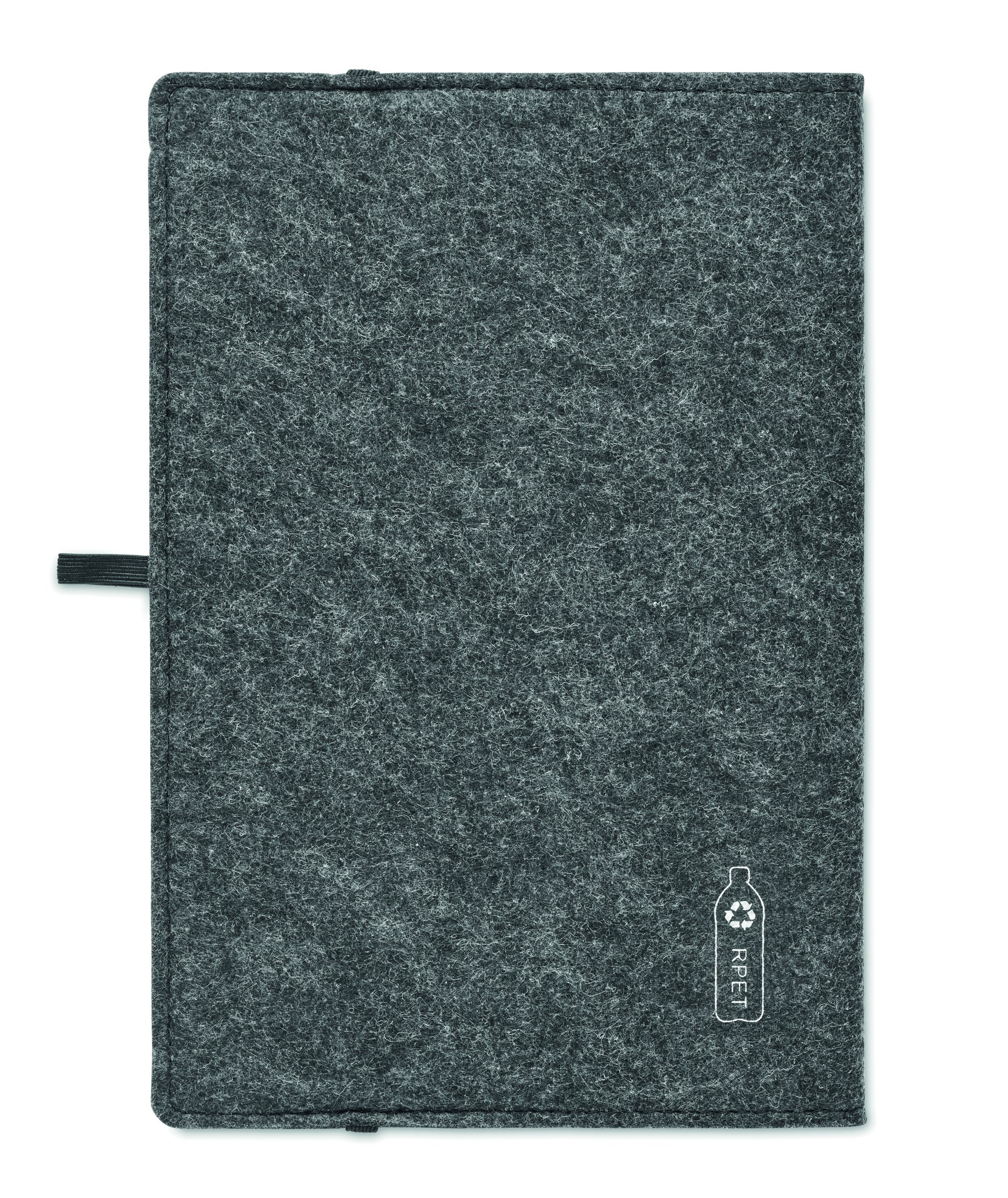 Notes A5 z filcową okładką RPET. 160 stron w linie z papieru z recyklingu (80 arkuszy / 70 gr/m²). Gumka na długopis.