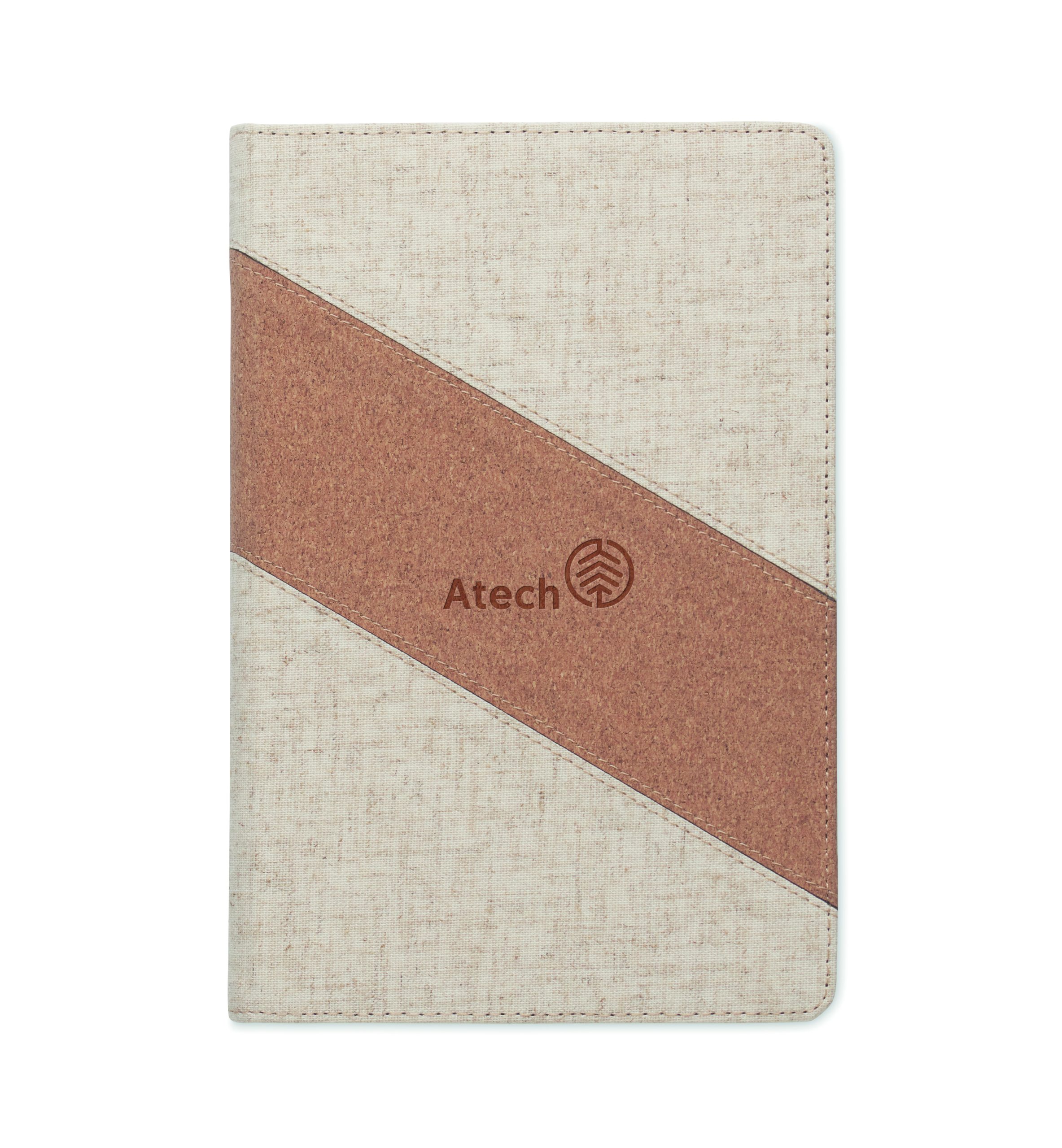 Notatnik 2 w 1. Notatnik A5 z wbudowaną ładowarką bezprzewodową 15W. Okładka z bawełny i korka, 128 kartek w linie (64 arkusze). Wstążkowa zakładka.