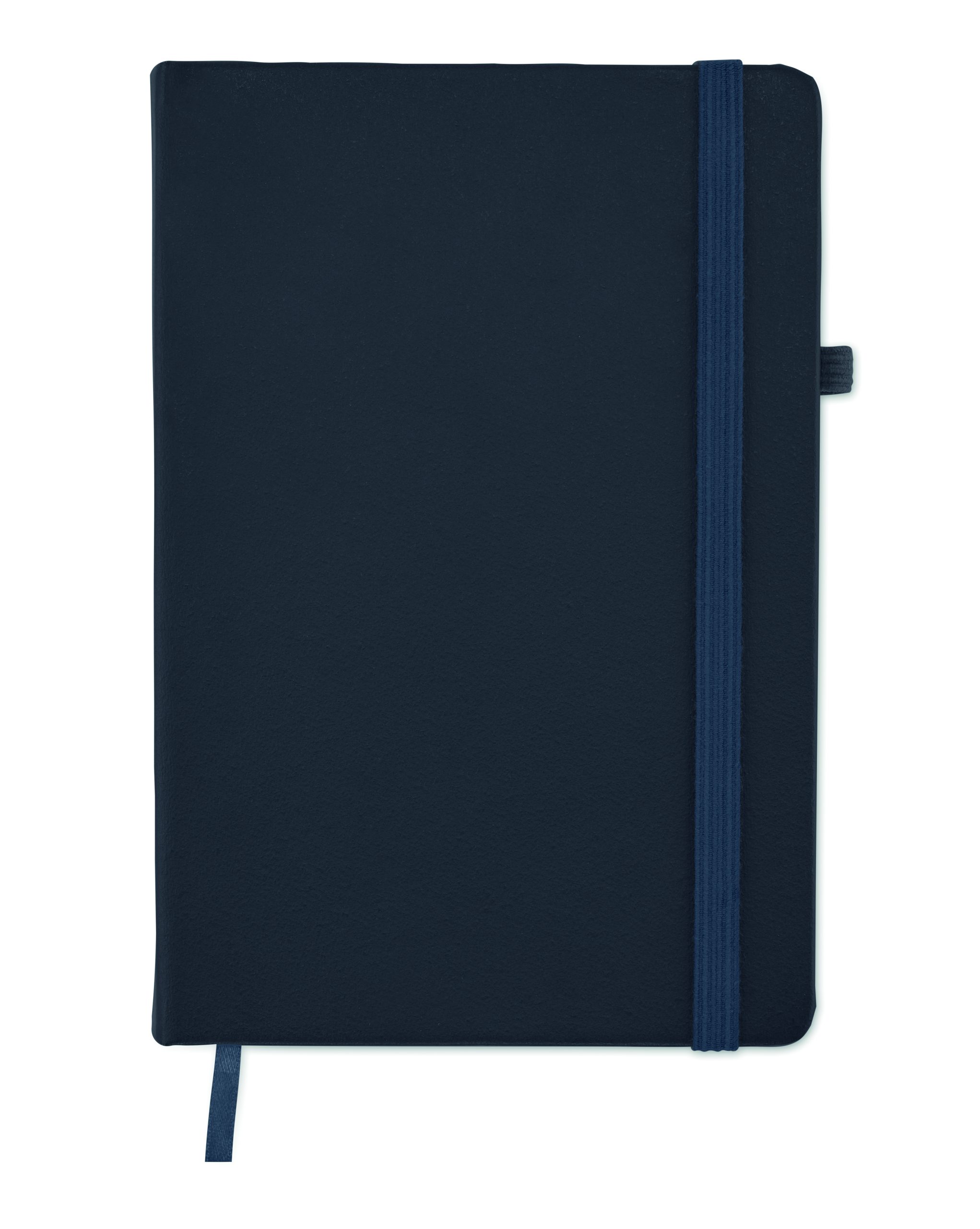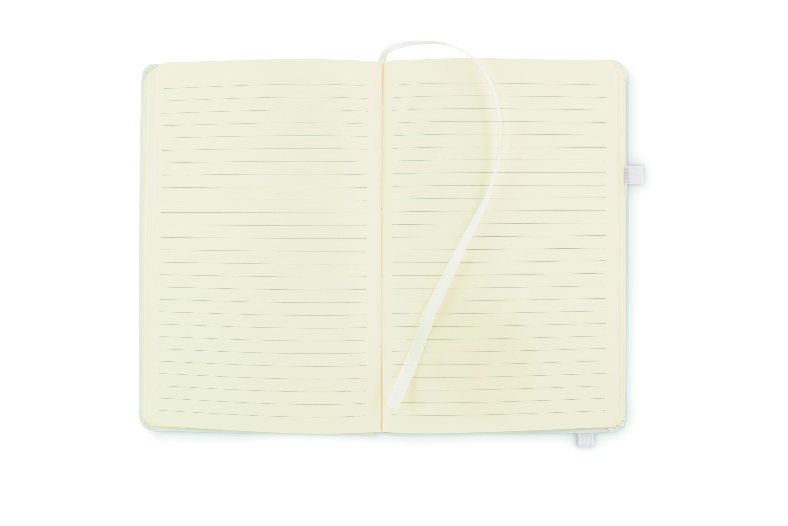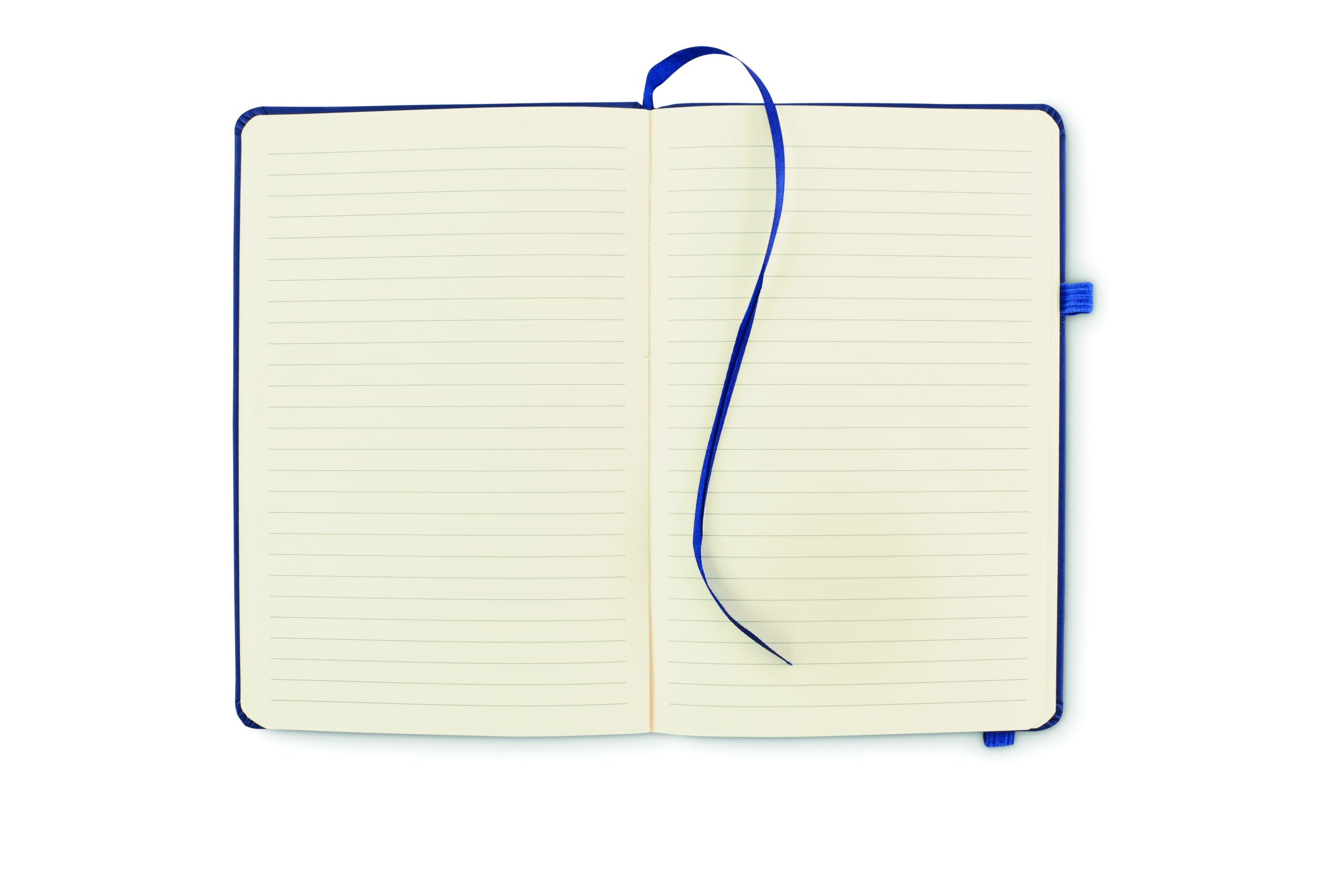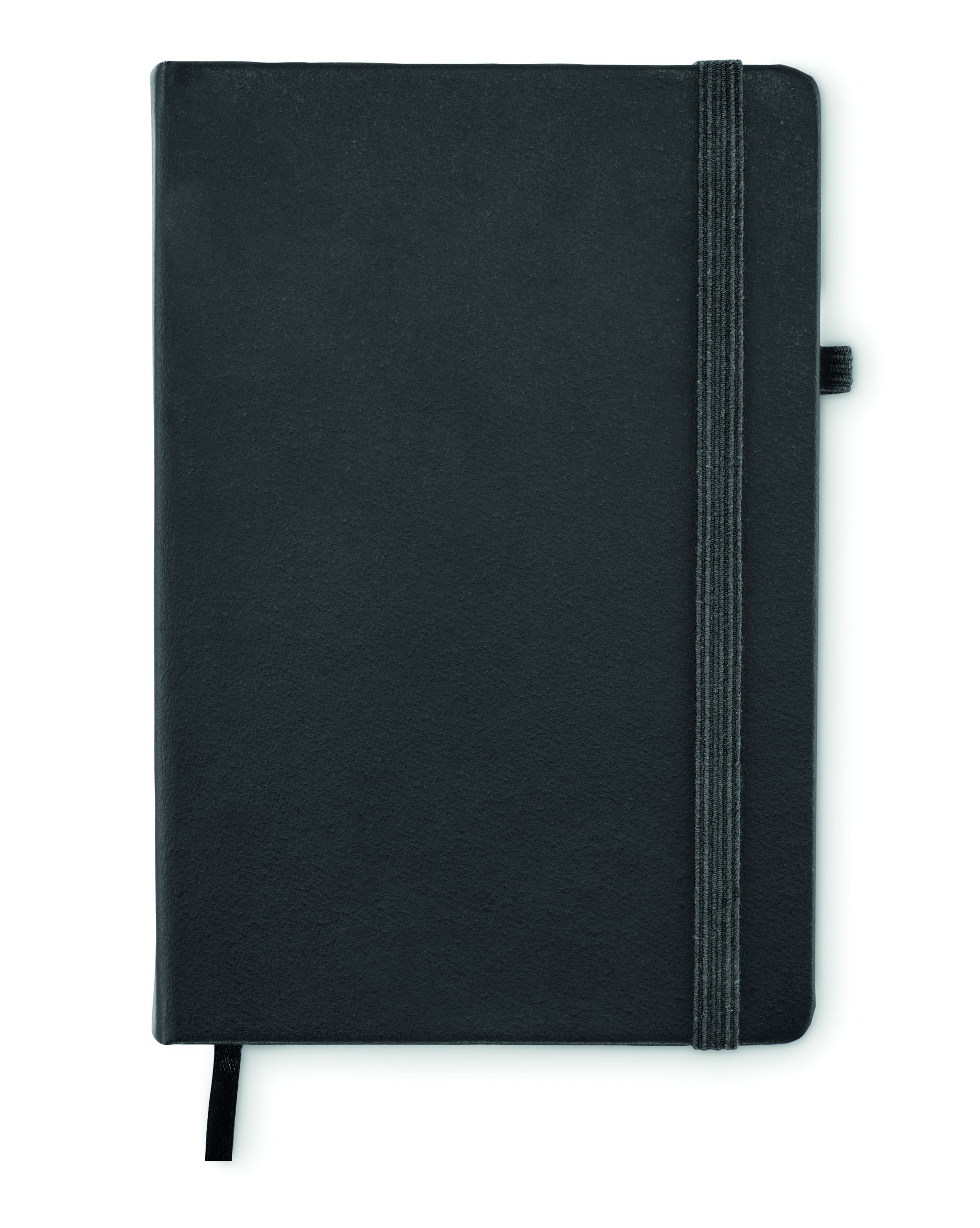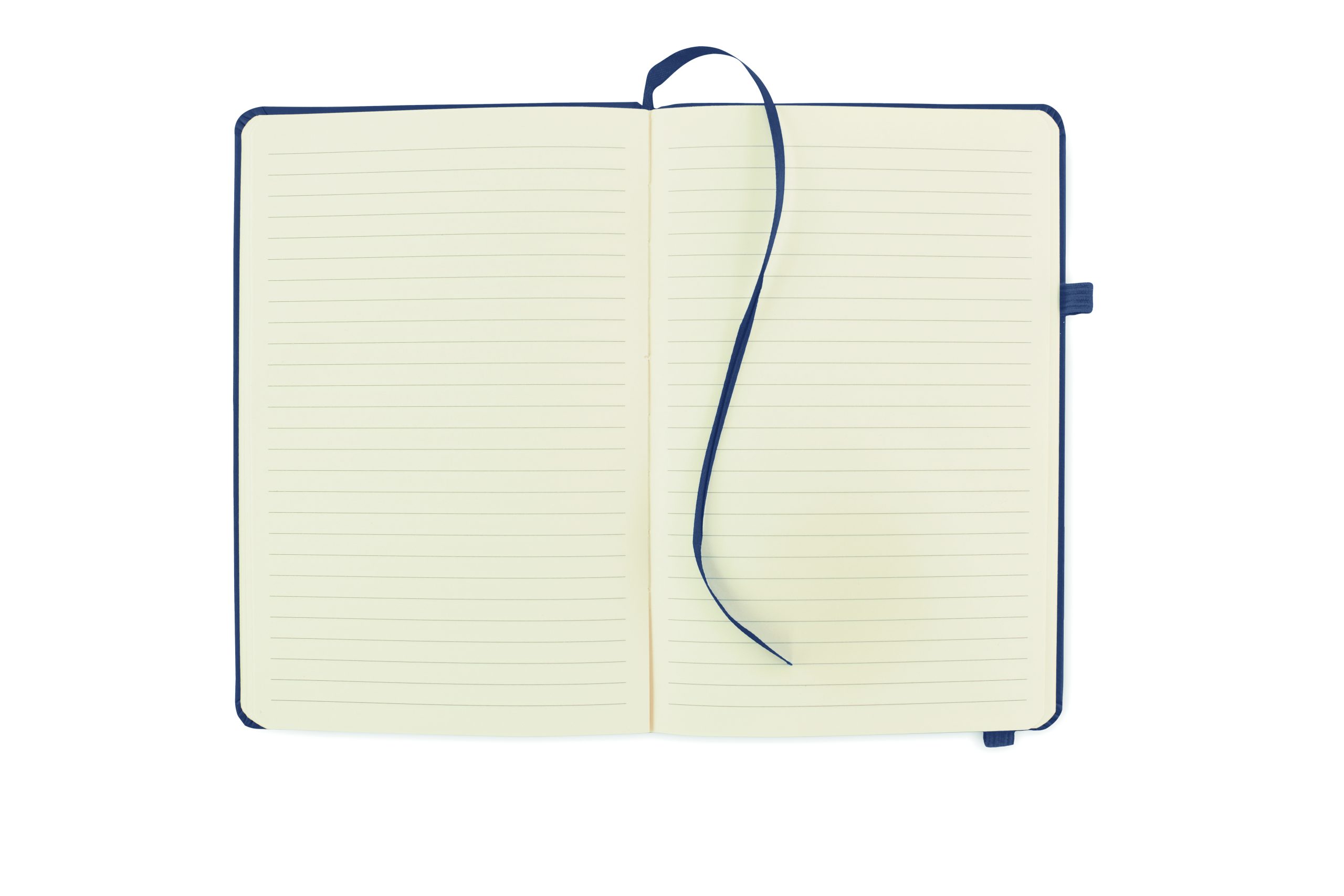 Notatnik A5 z okładką wykonaną w 70% ze skóry pochodzącej z recyklingu i w 30% z lateksowego PU. Obwoluta. 192 stron w linie na papierze z recyklingu (96 arkuszy). Dopasowany elastyczny bawełniany pasek i uchwyt na długopis.