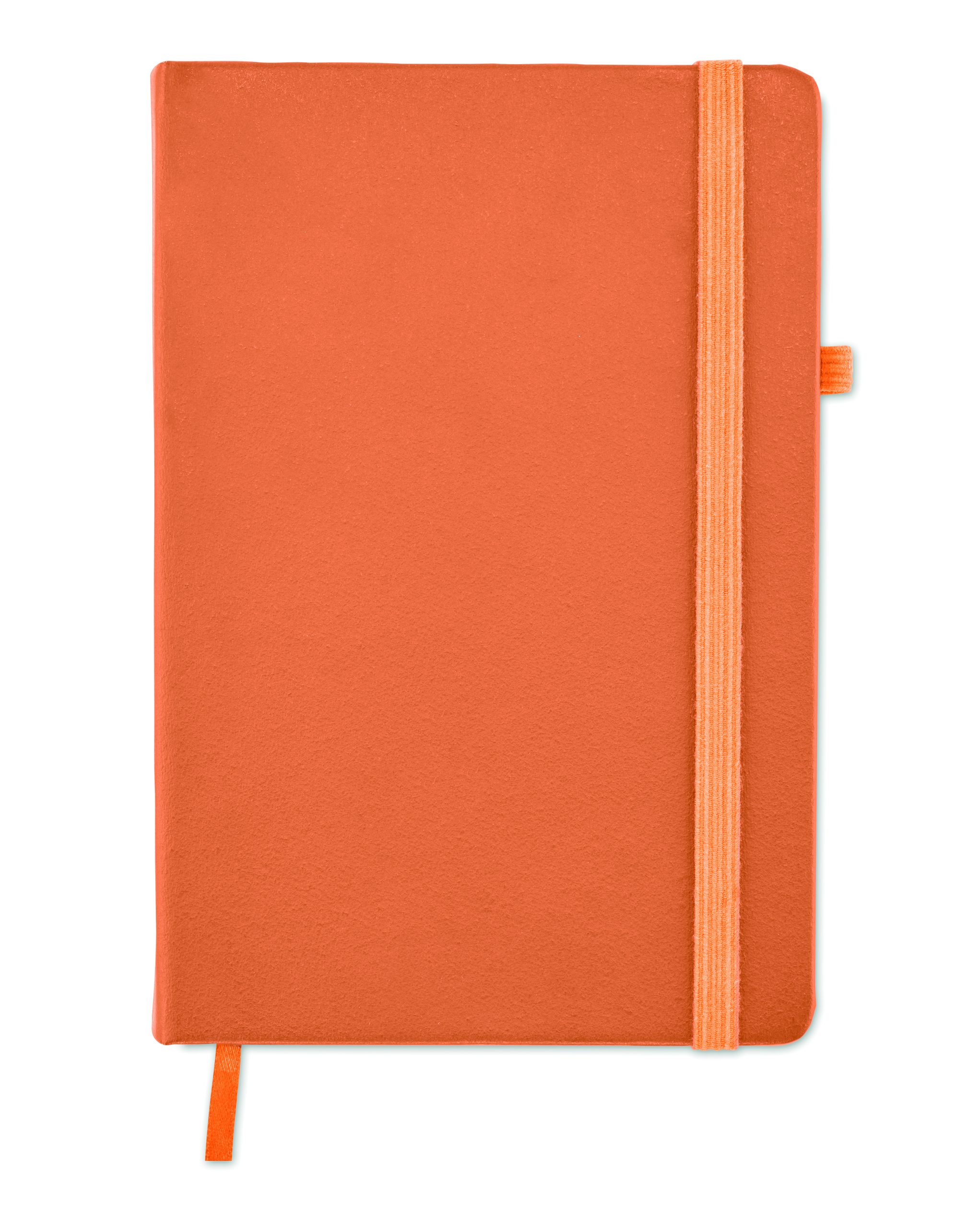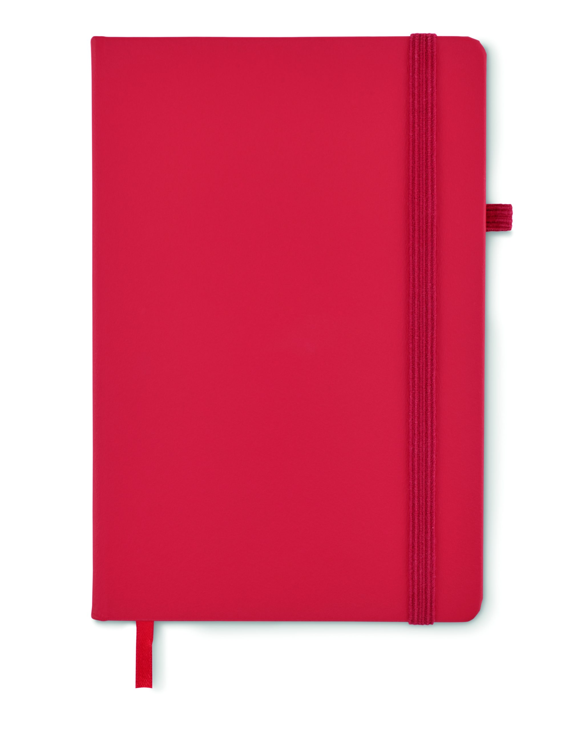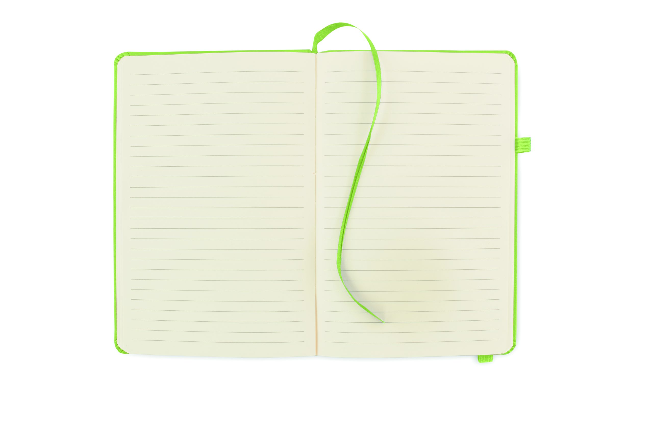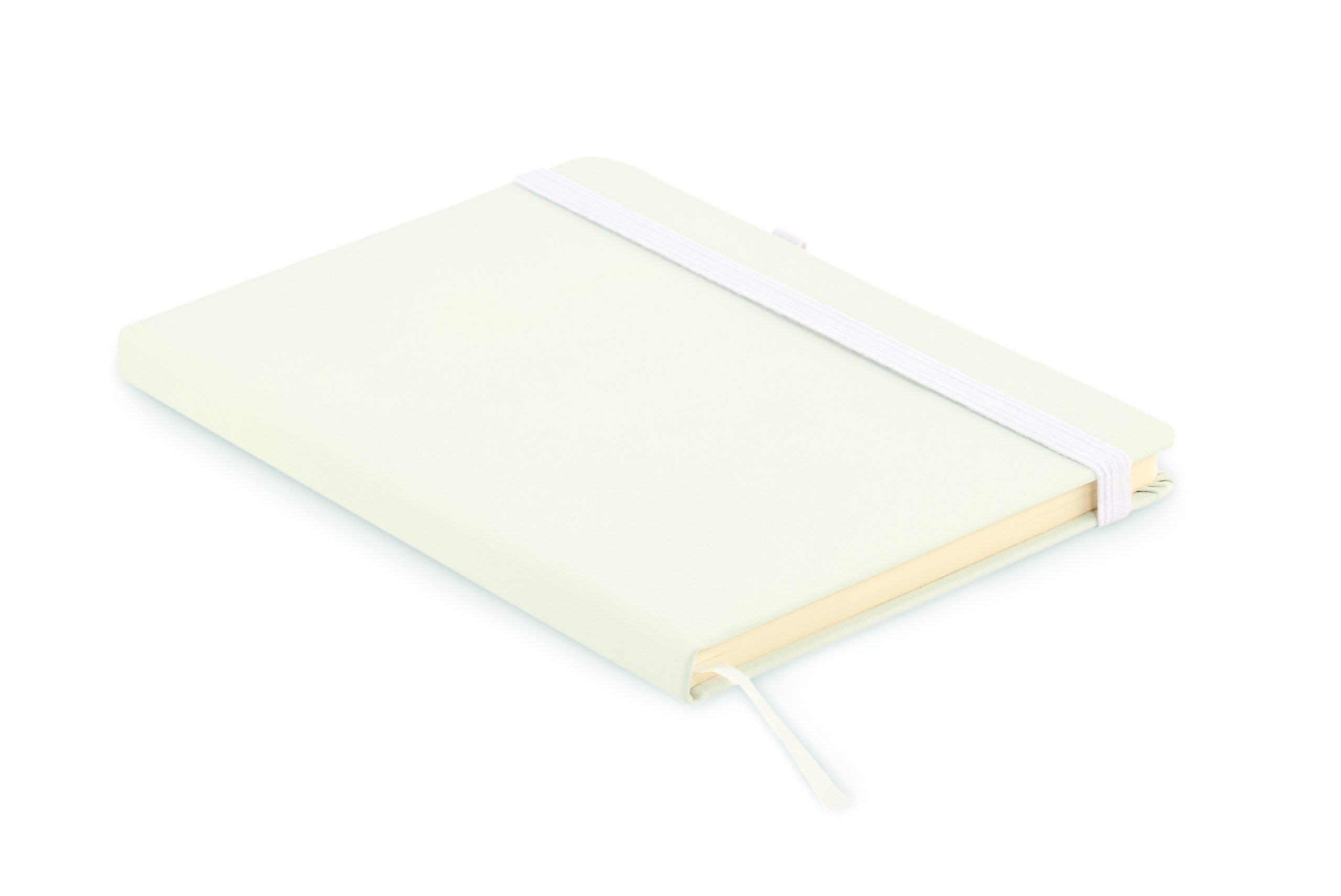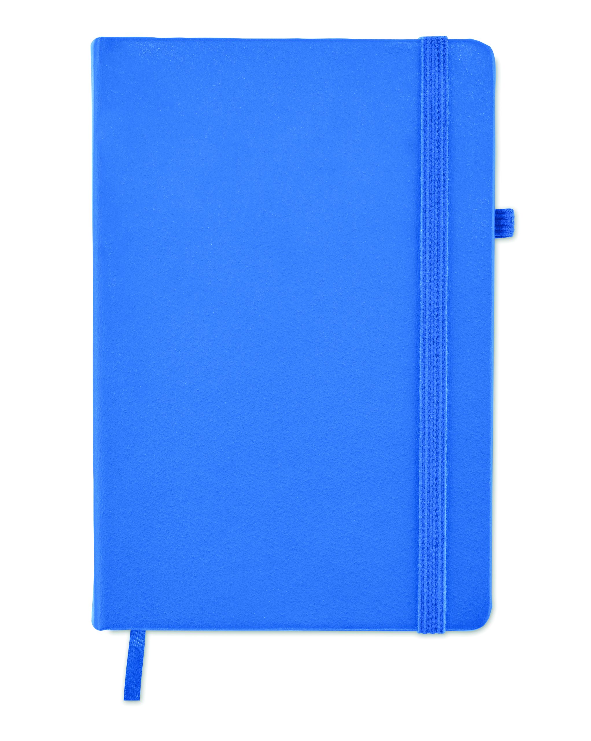 Notatnik A5 z okładką wykonaną w 70% ze skóry pochodzącej z recyklingu i w 30% z lateksowego PU. Obwoluta. 192 stron w linie na papierze z recyklingu (96 arkuszy). Dopasowany elastyczny bawełniany pasek i uchwyt na długopis.