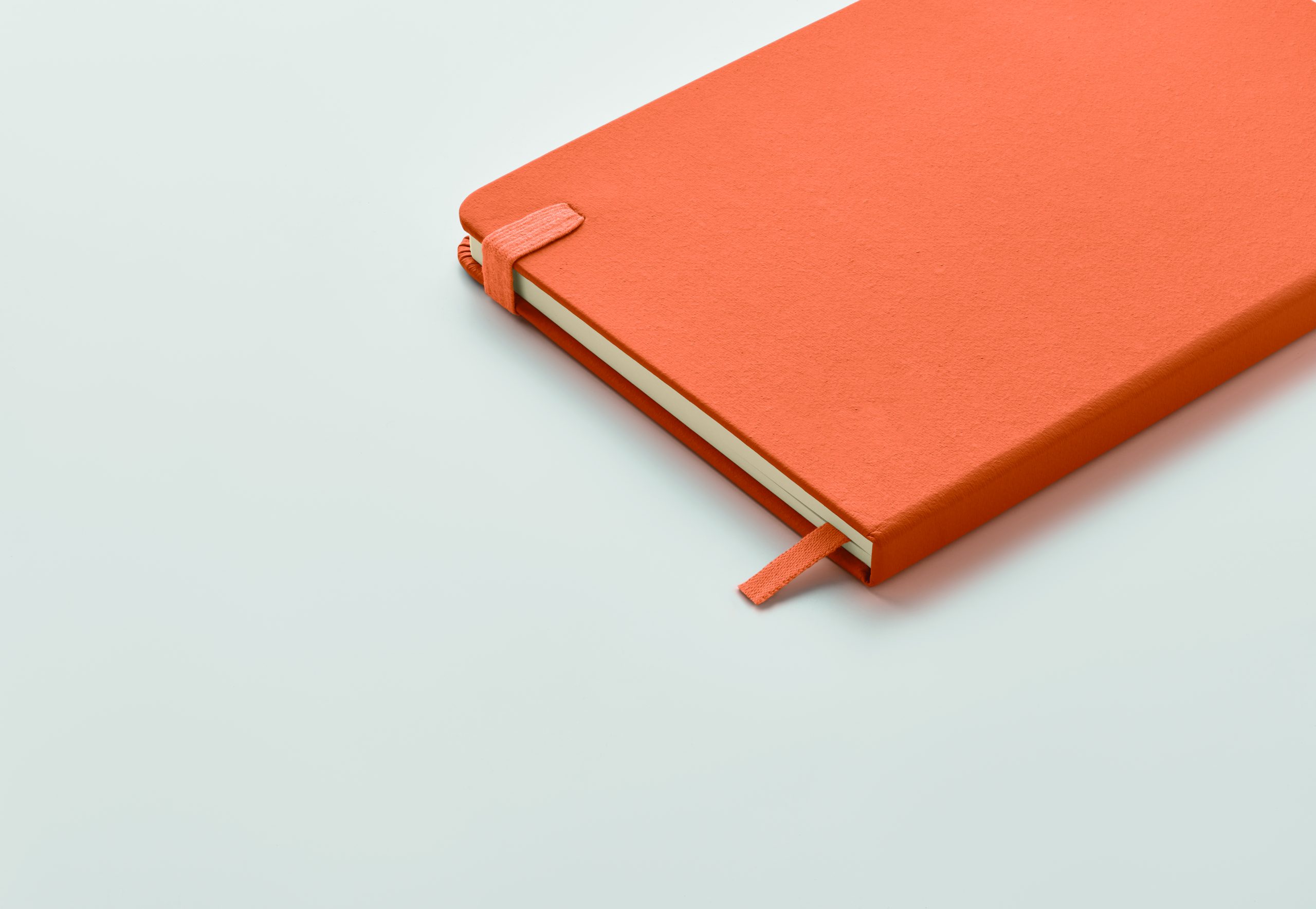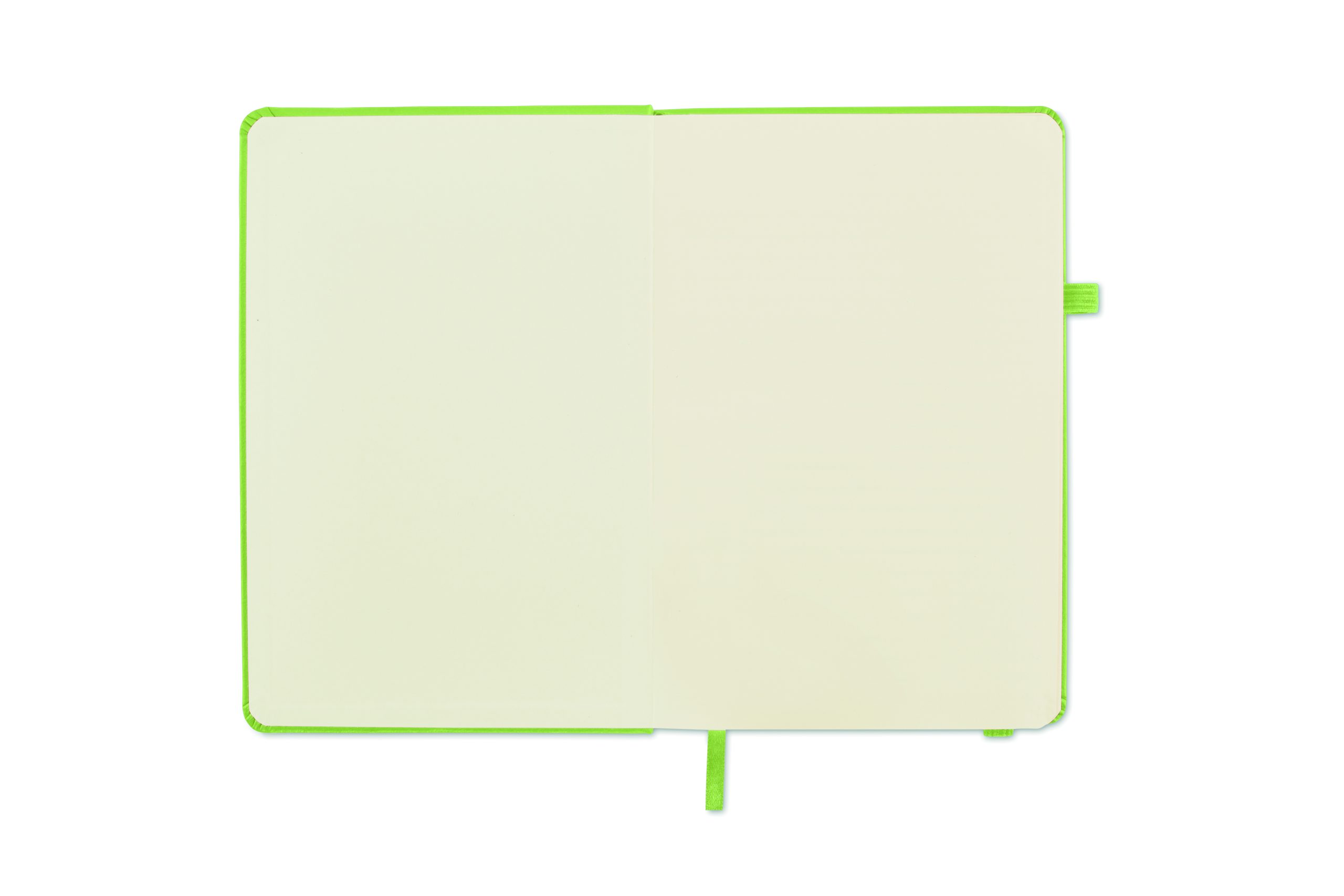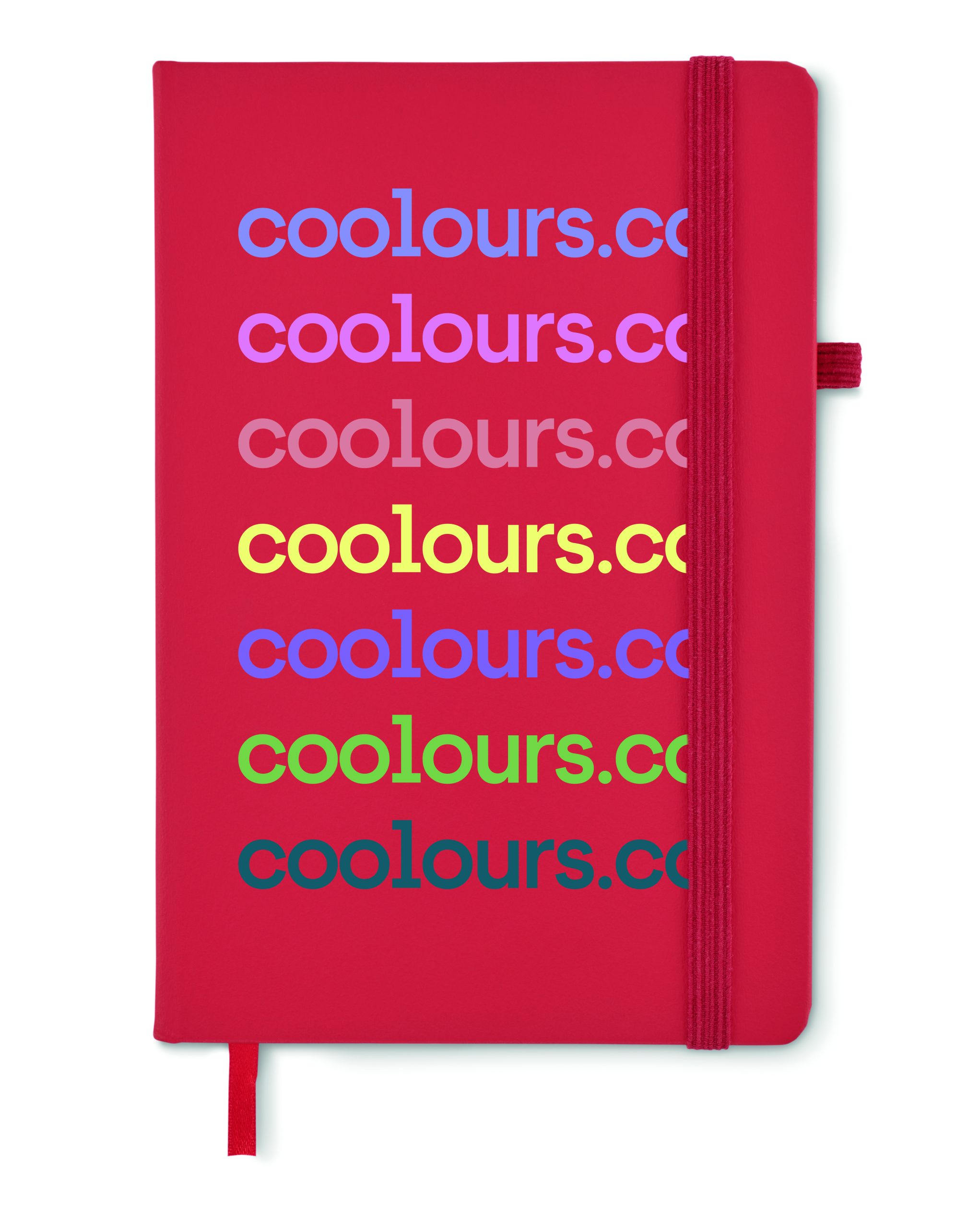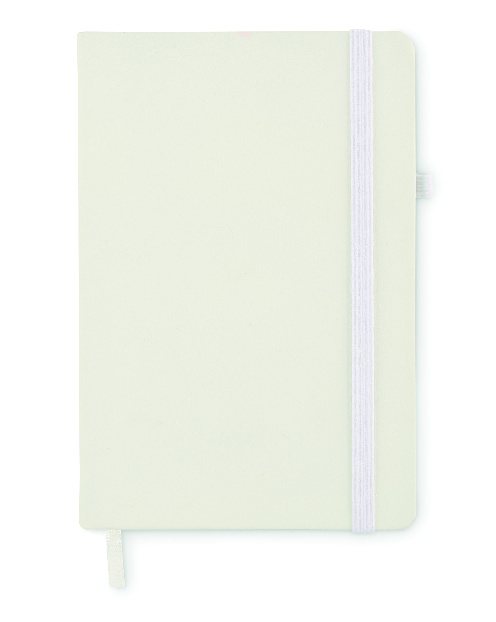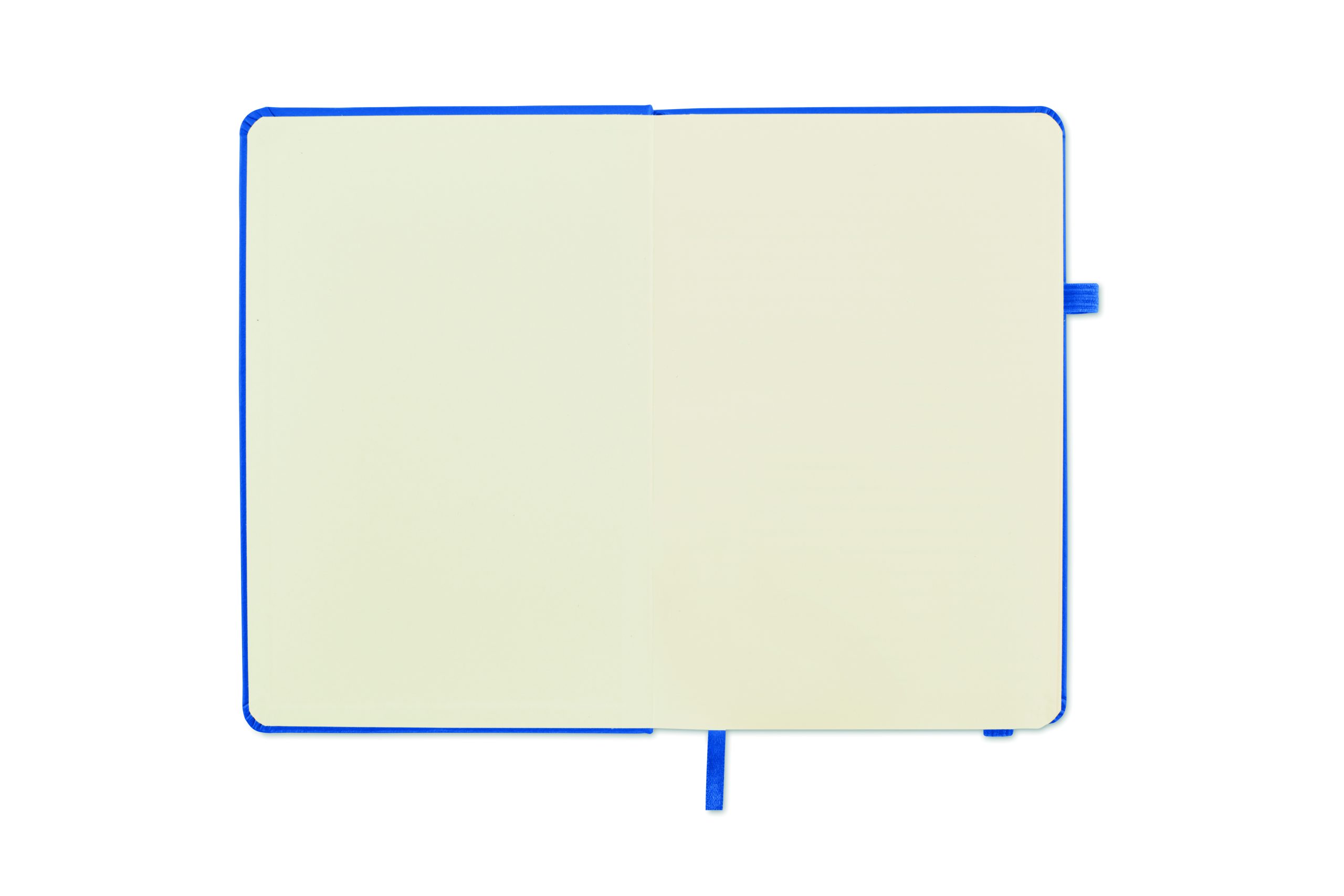 Notatnik A5 z okładką wykonaną w 70% ze skóry pochodzącej z recyklingu i w 30% z lateksowego PU. Obwoluta. 192 stron w linie na papierze z recyklingu (96 arkuszy). Dopasowany elastyczny bawełniany pasek i uchwyt na długopis.
