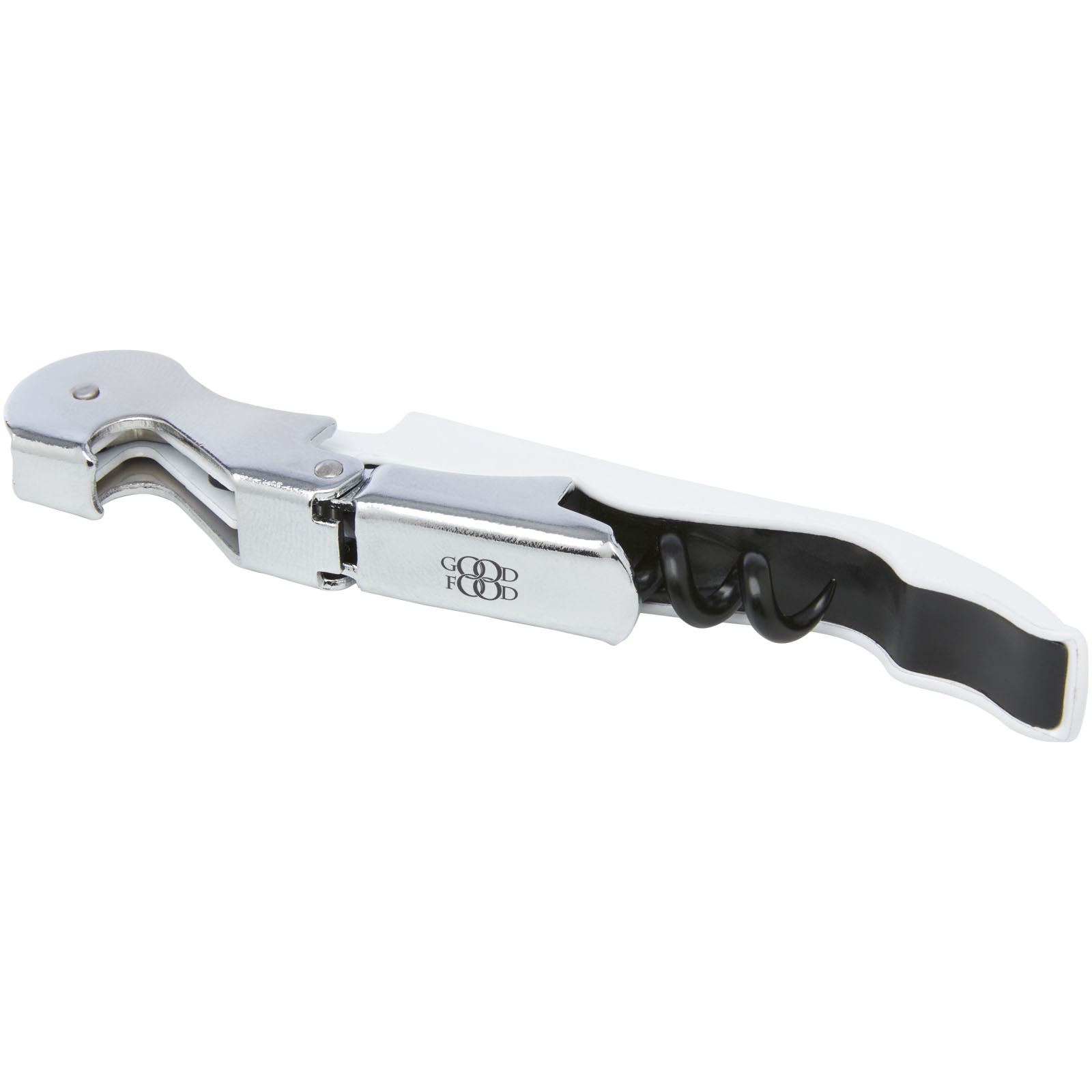 Nóż kelnerski ze stali nierdzewnej z kolorowym korpusem, wyposażony w korkociąg, przecinak do folii i otwieracz do butelek. Dzięki dwustopniowej konstrukcji można łatwo wyjąć korek z butelki.