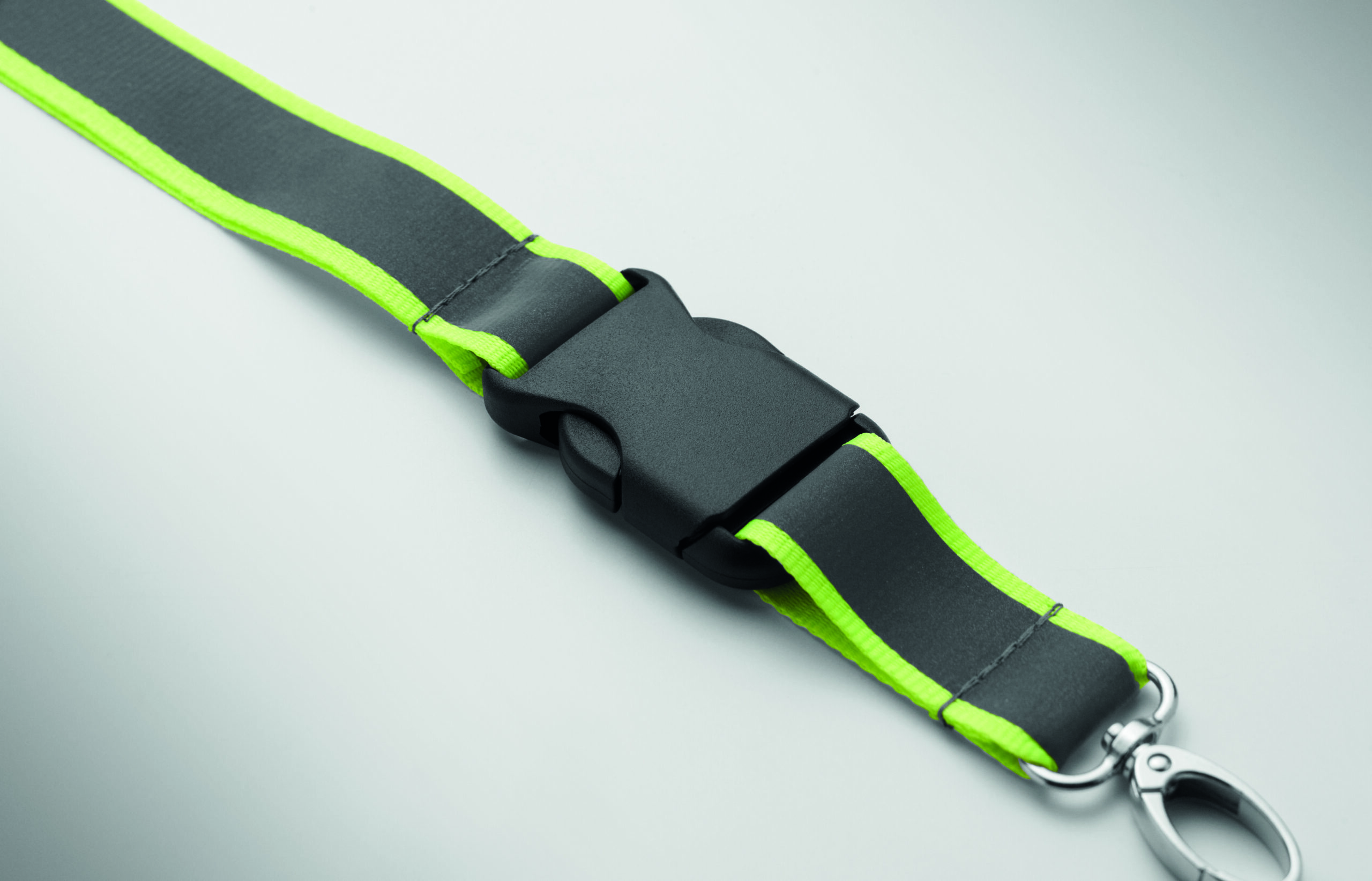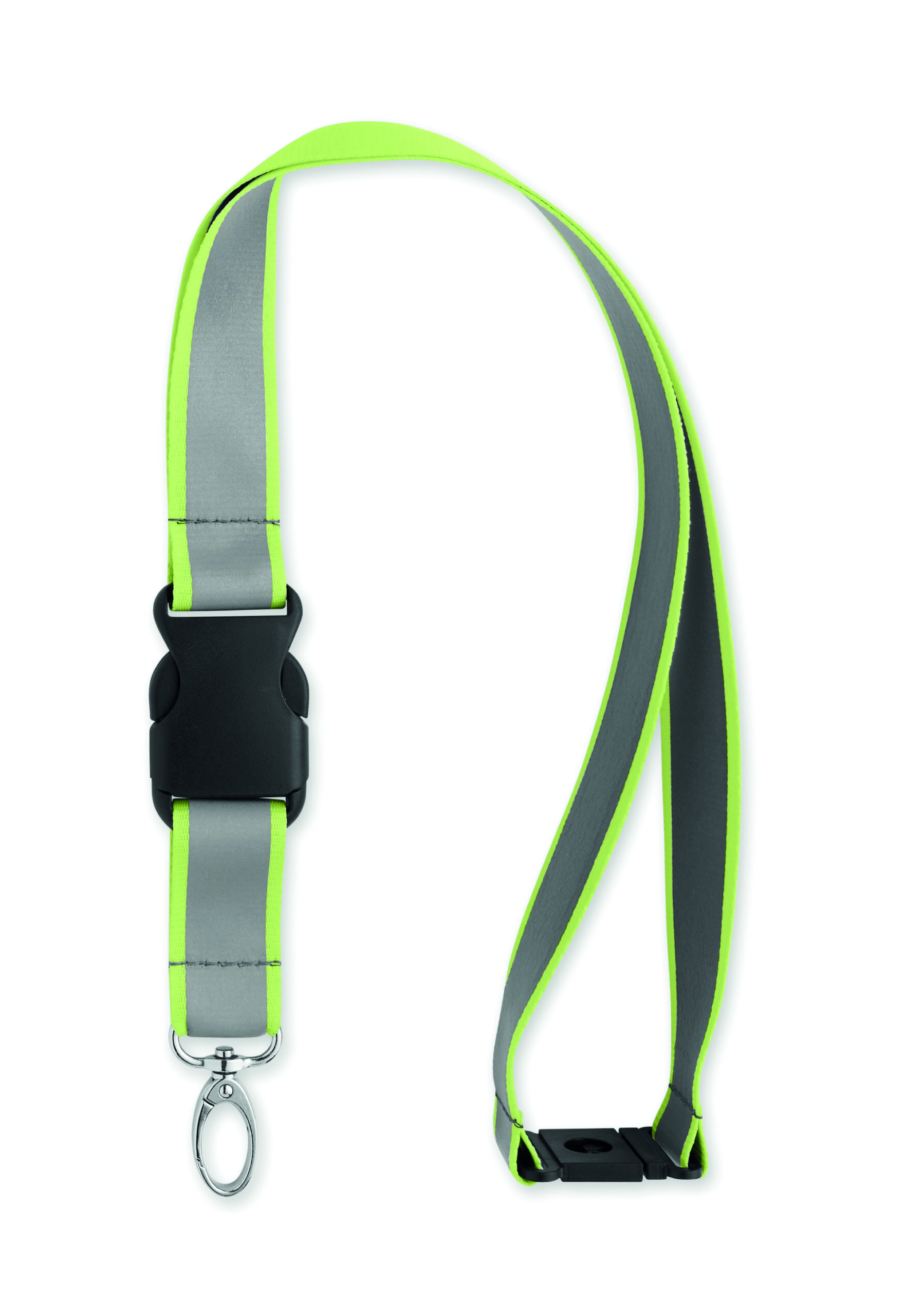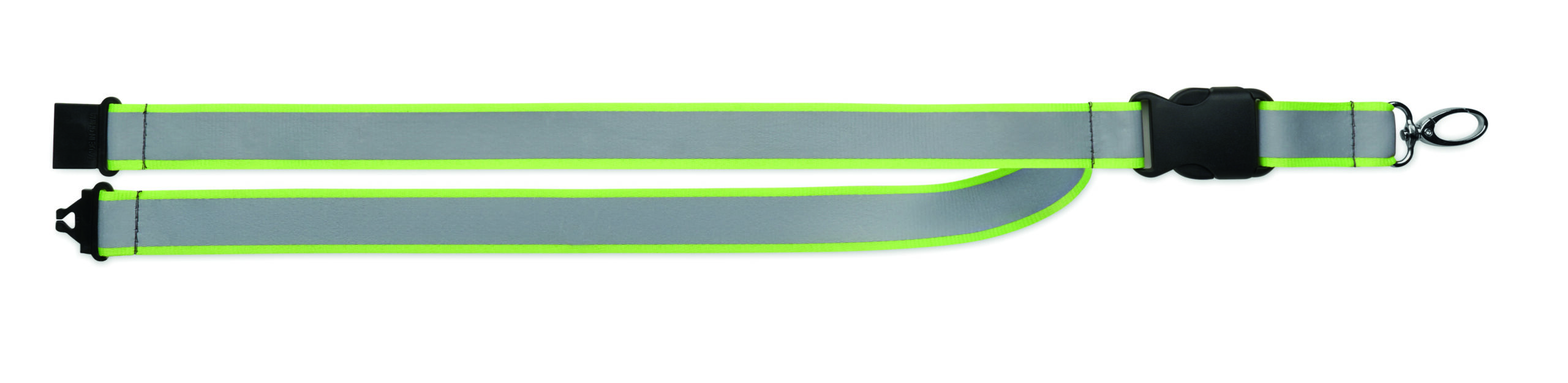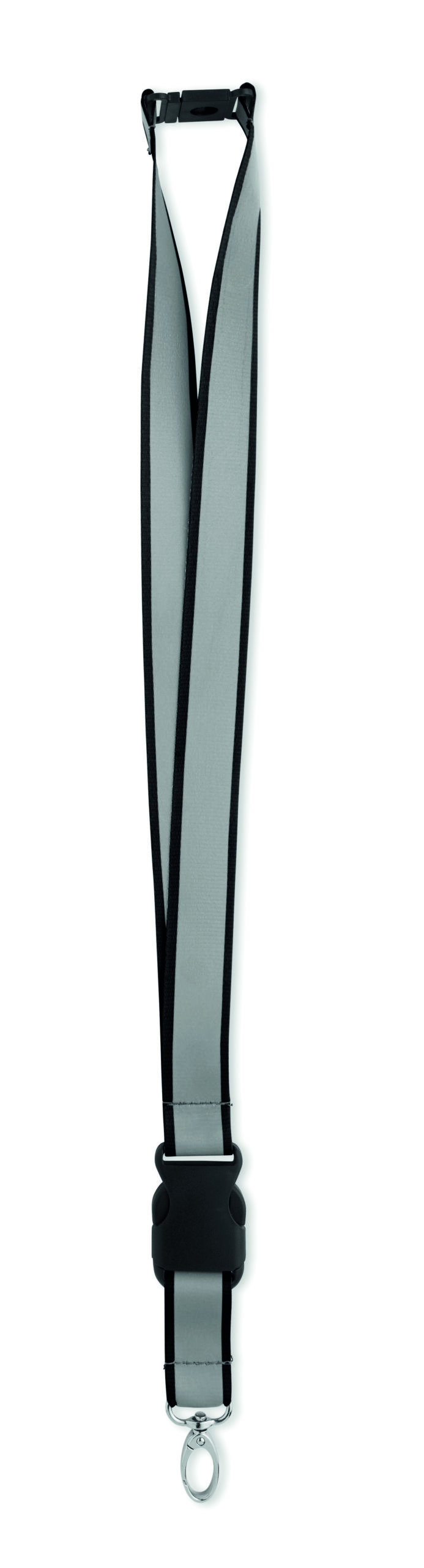Odblaskowa smycz poliestrowa RPET z 2,5 cm paskiem, metalowym karabińczykiem, odpinaną klamrą PP i bezpiecznym karabińczykiem. Wyłącznie do użytku promocyjnego.