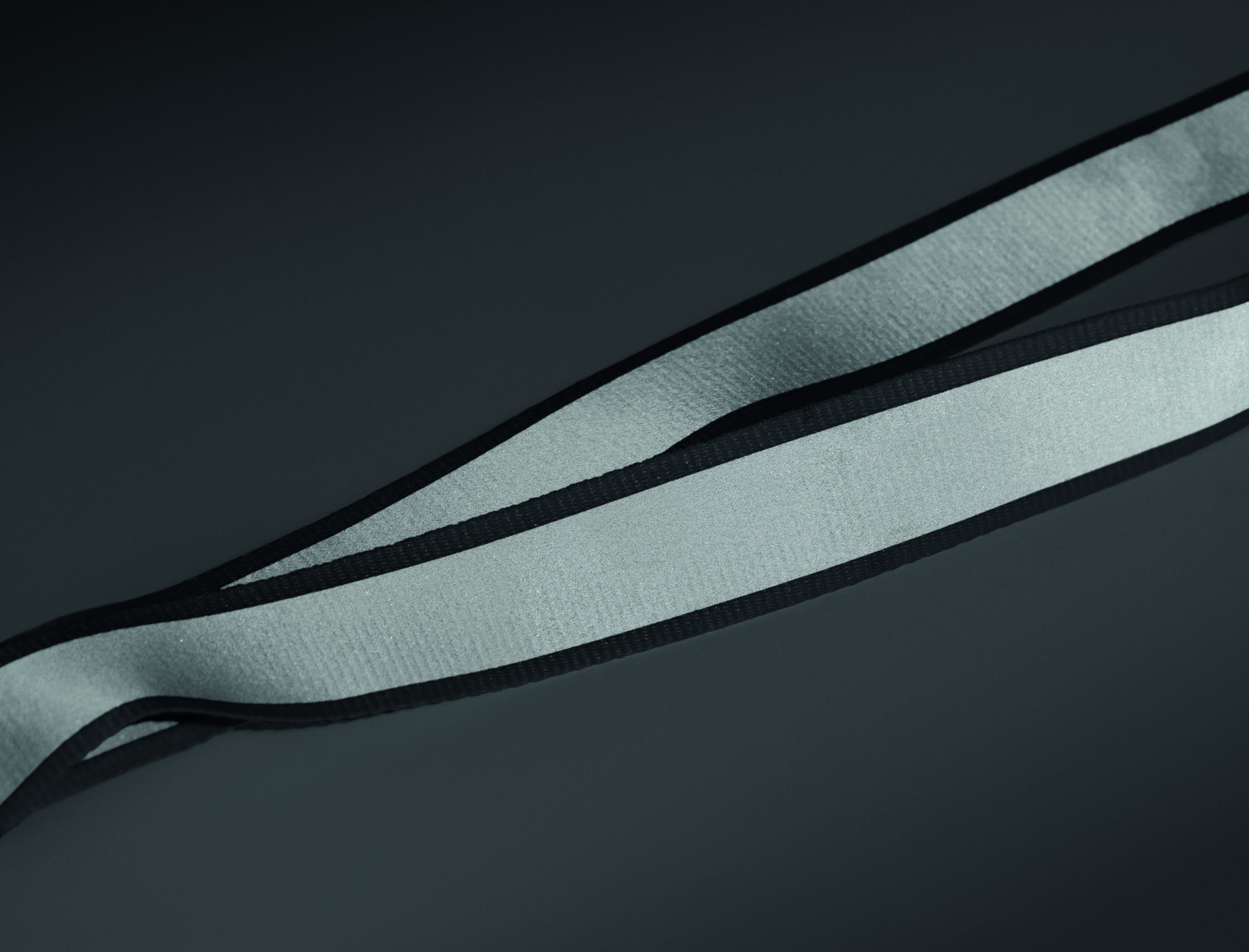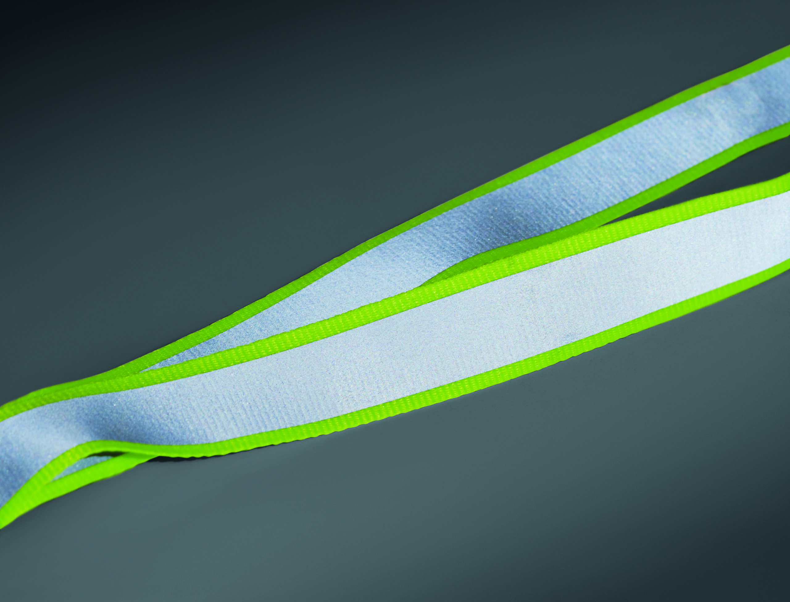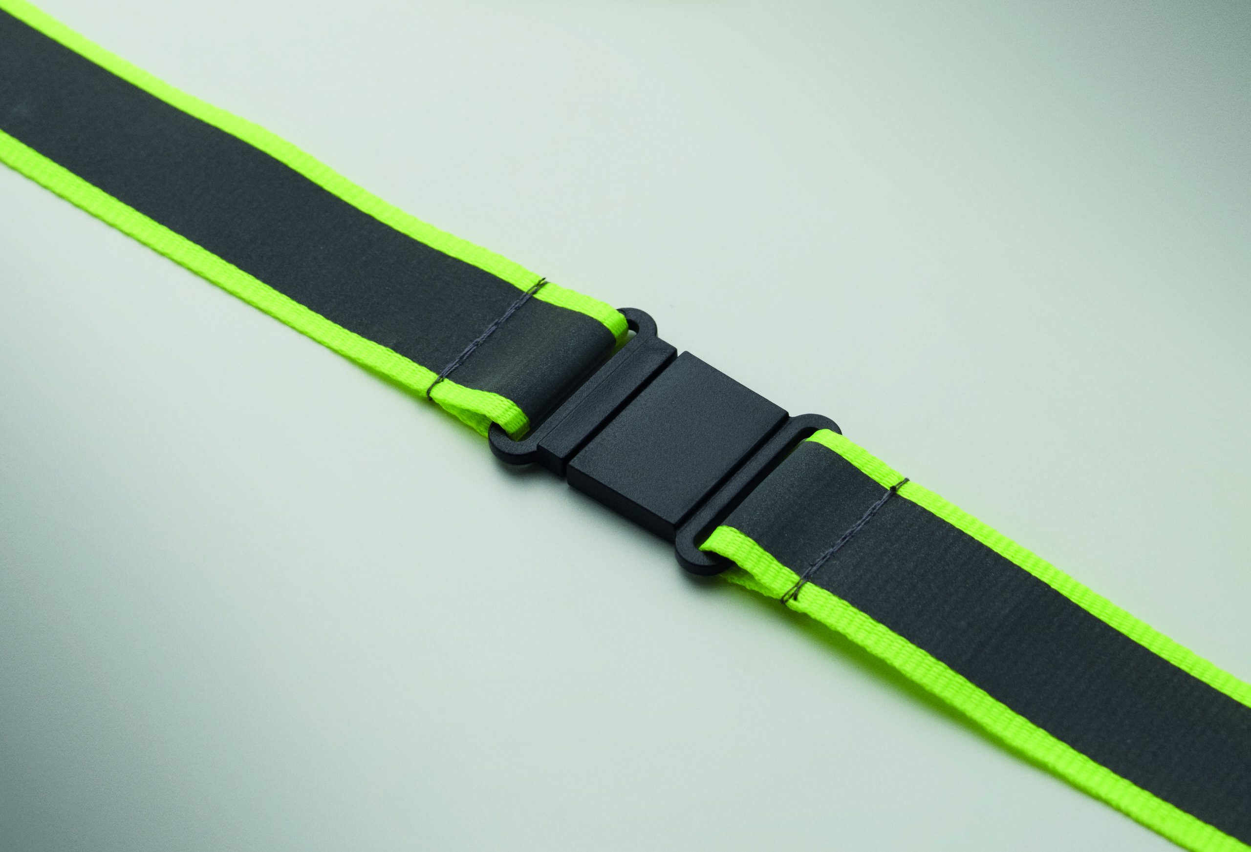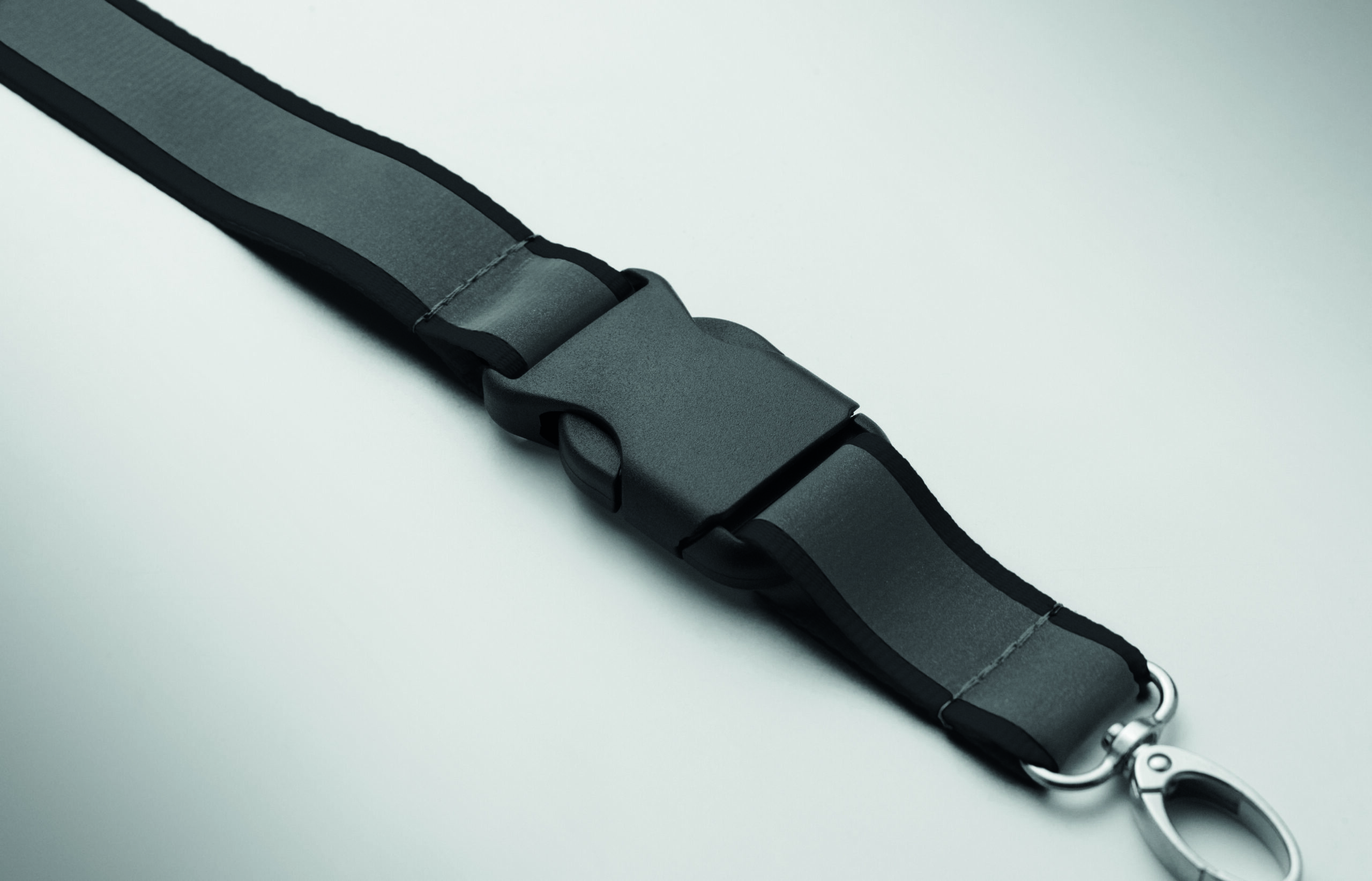Odblaskowa smycz poliestrowa RPET z 2,5 cm paskiem, metalowym karabińczykiem, odpinaną klamrą PP i bezpiecznym karabińczykiem. Wyłącznie do użytku promocyjnego.