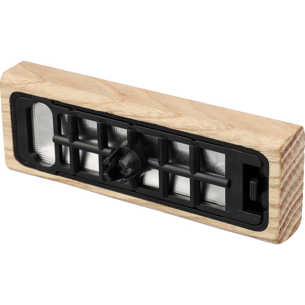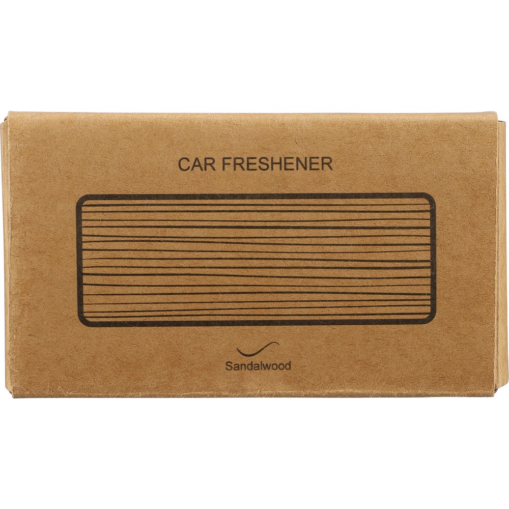 Odświeżacz do samochodu, 2 pojemniczki z zapachem drzewa sandałowego po 3 g, klips ułatwiający przypięcie w samochodzie, zapakowany pojedynczo w brązowy kartonik, produkt wykonany z drewna bukowego