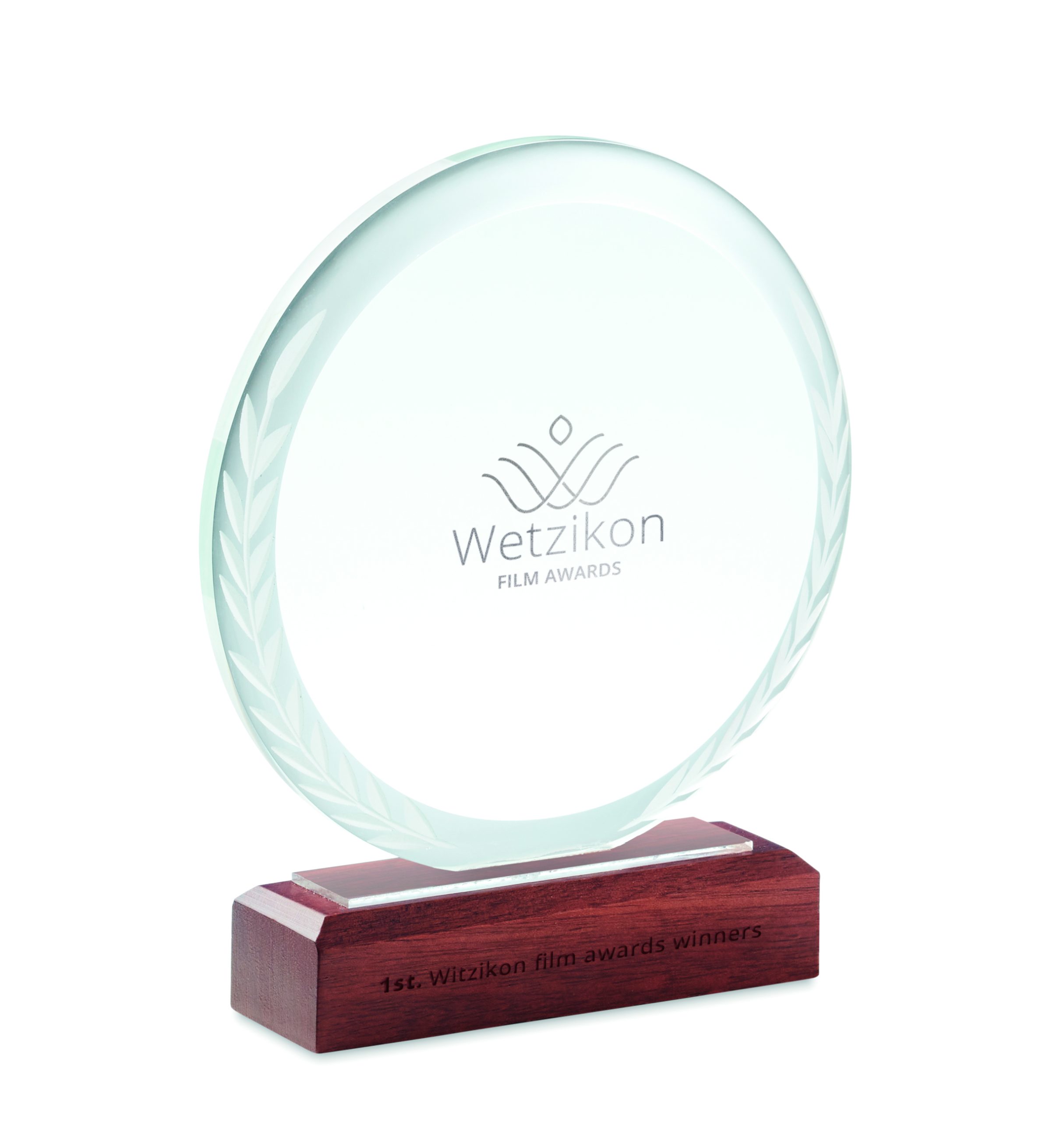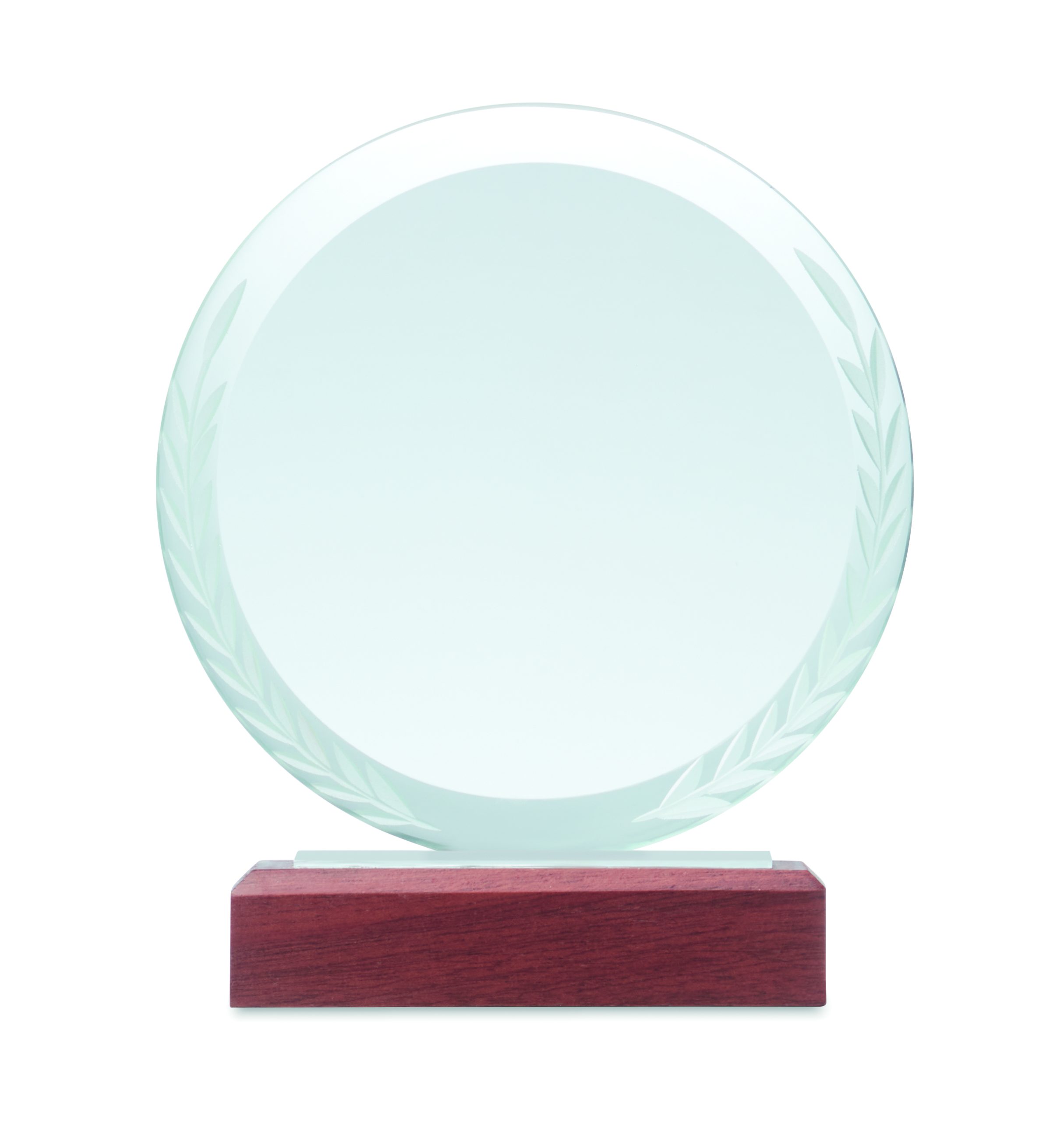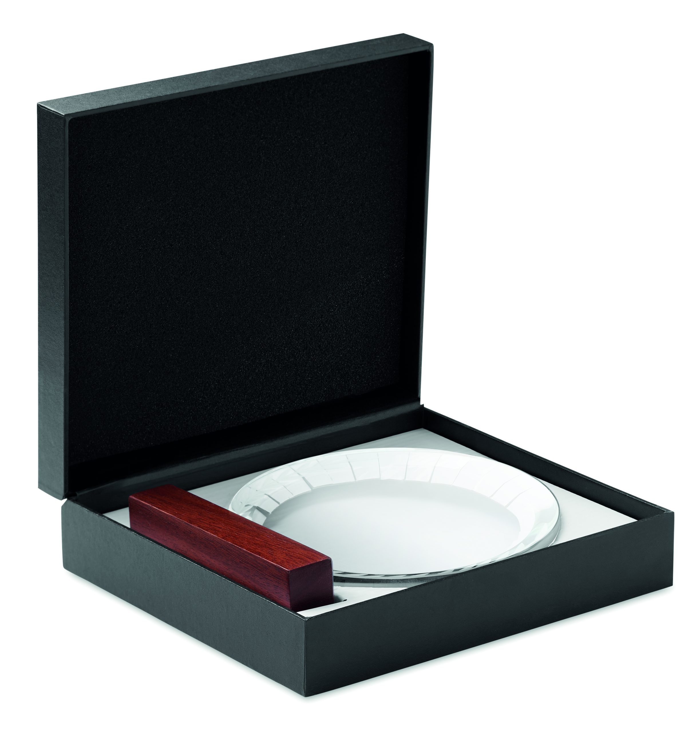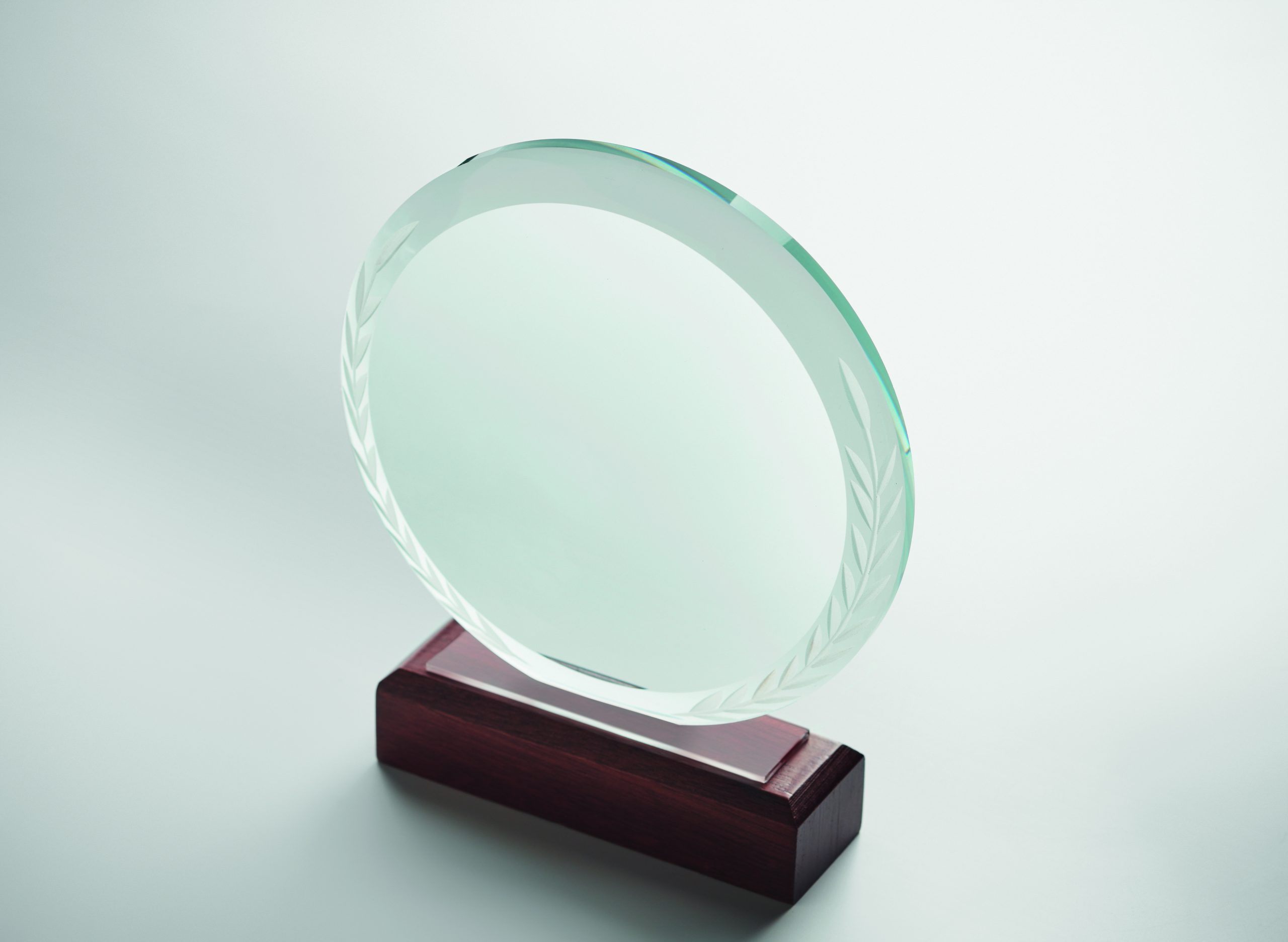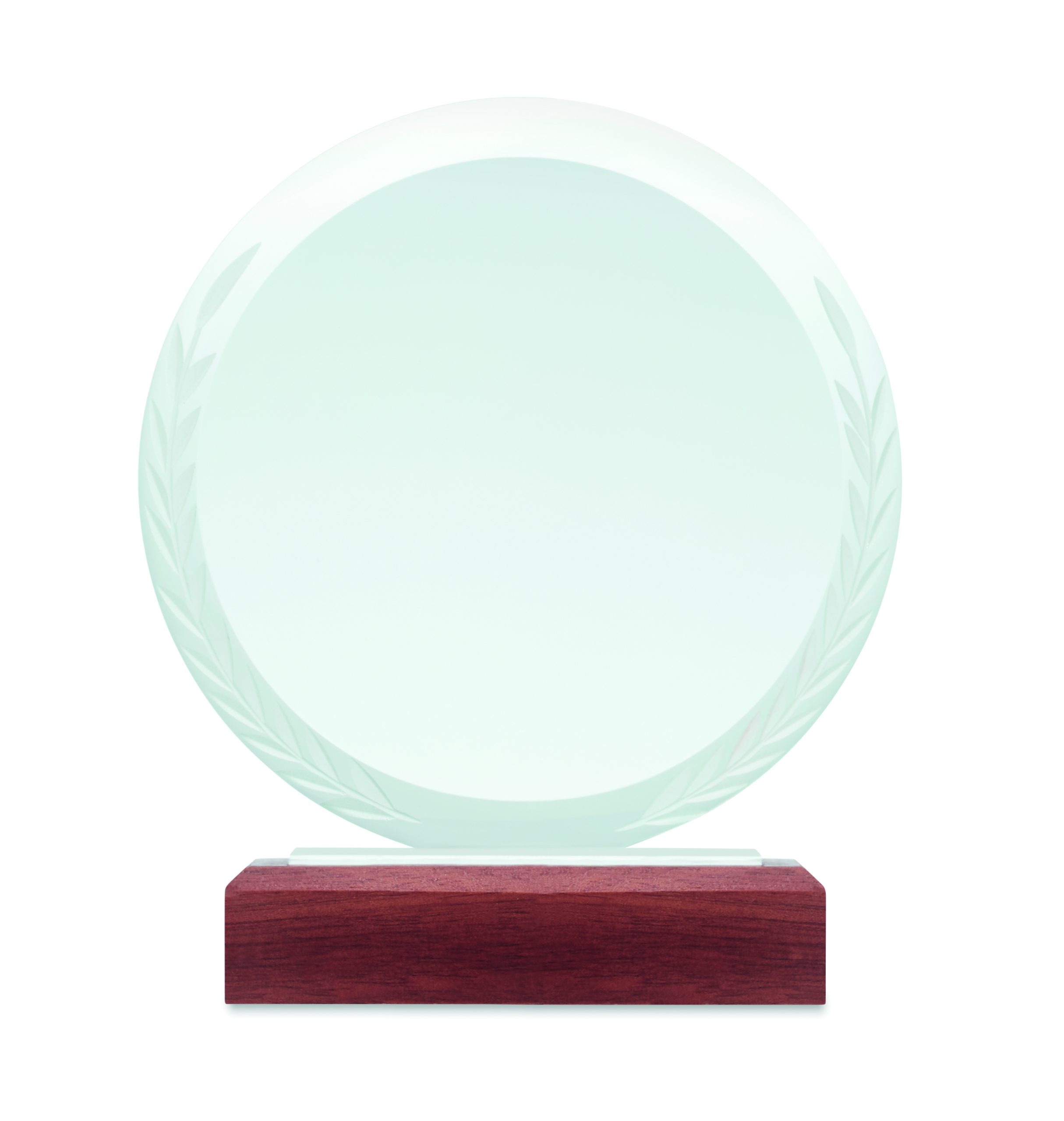 Okrągła kryształowa nagroda lub tabliczka pamiątkowa na drewnianej podstawie z drewna bukowego, w pudełku upominkowym.