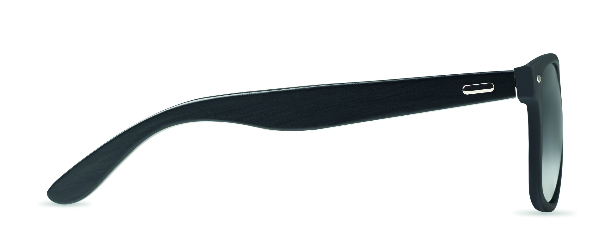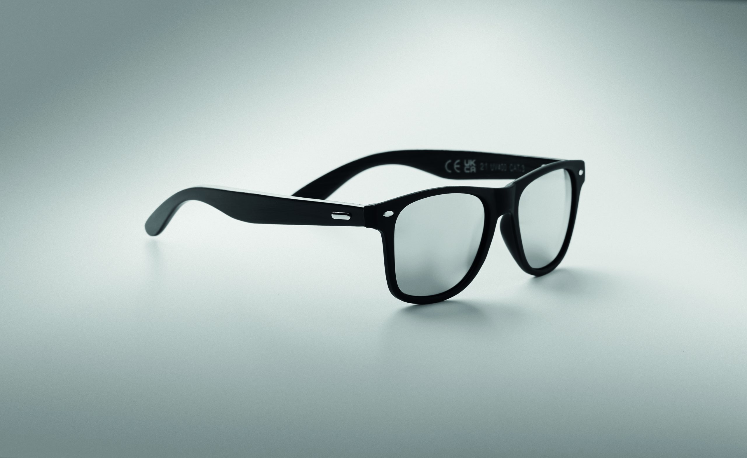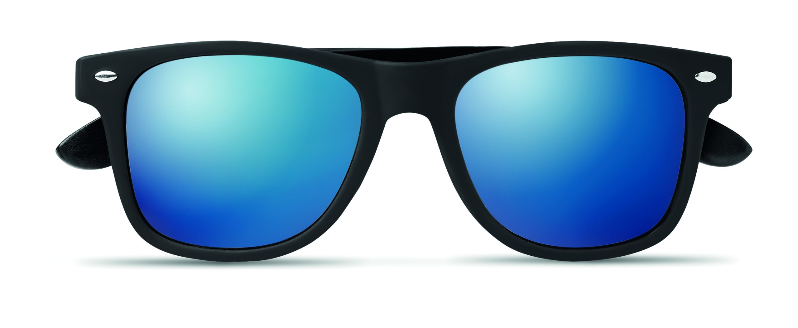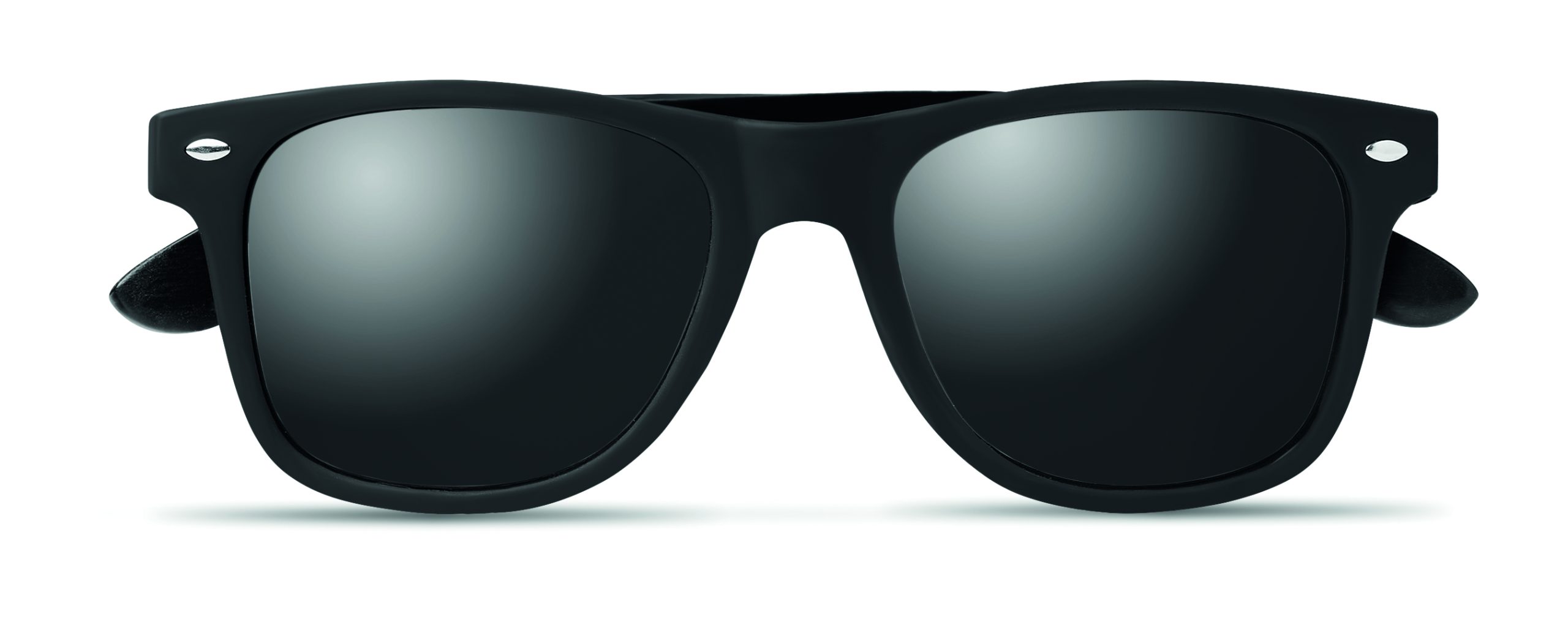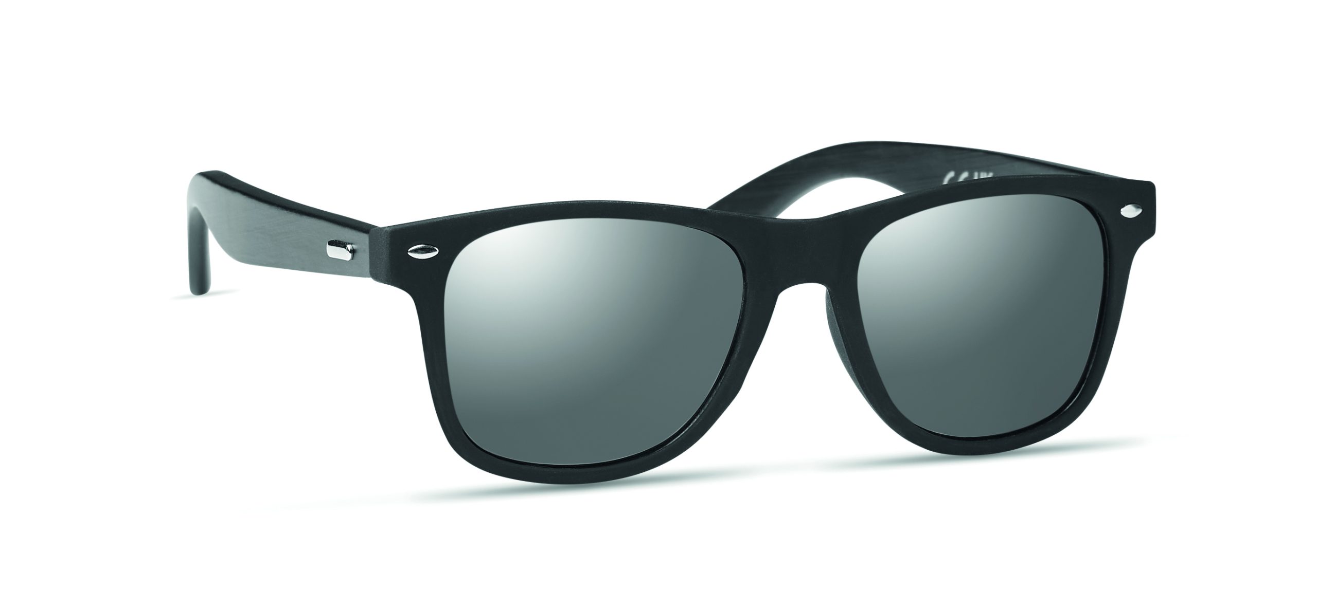 Okulary przeciwsłoneczne z czarnymi, zausznikami z bambusową powłoką i lustrzanymi soczewkami. Ochrona UV400. Bambus jest produktem naturalnym, dlatego mogą wystąpić nieznaczne różnice w kolorze, wzorze i rozmiarze.