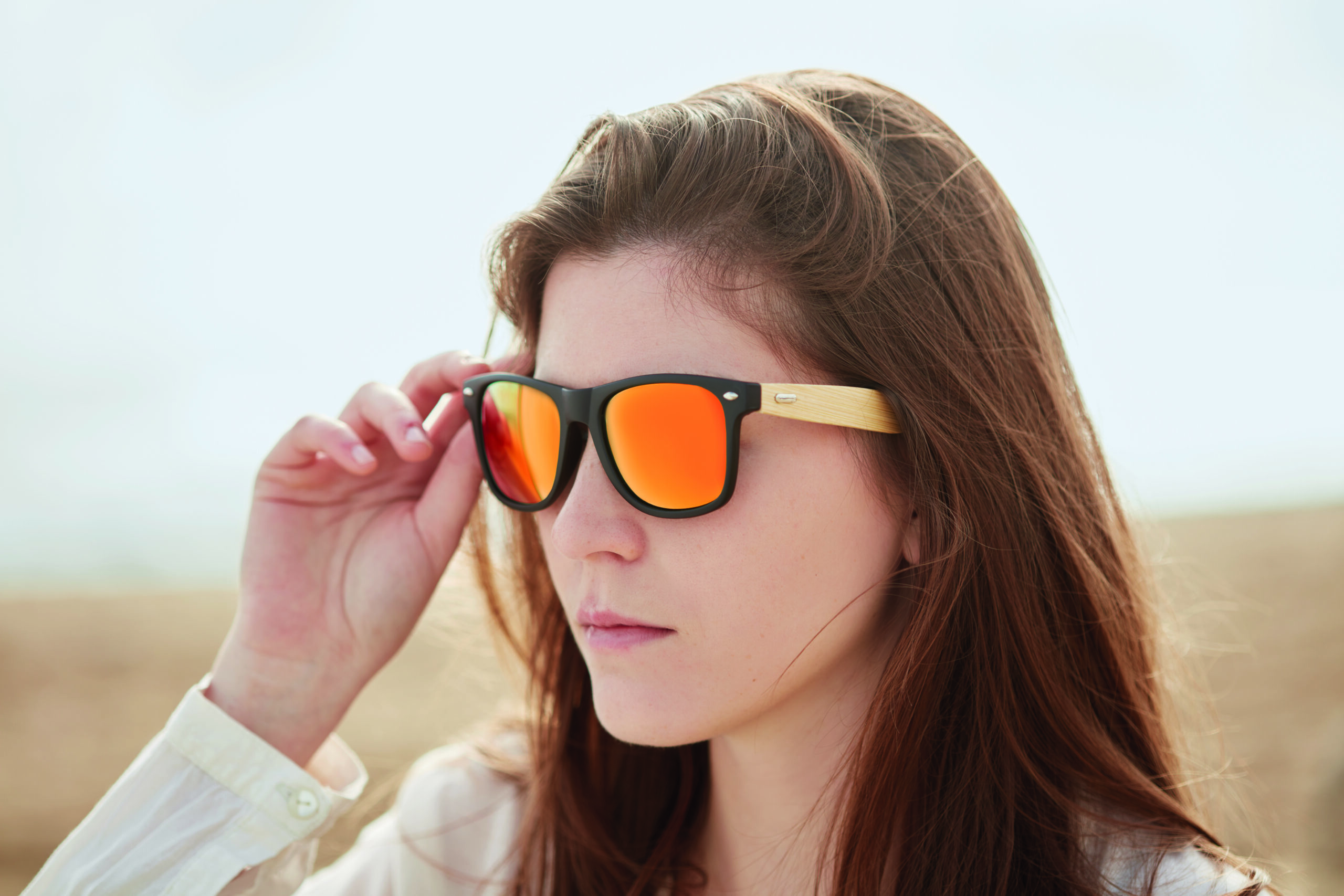 Okulary przeciwsłoneczne w stylu vintage z bambusowymi zausznikami i ramką PC. Kolorowe soczewki. Ochrona UV400. Bambus jest produktem naturalnym, dlatego mogą wystąpić nieznaczne różnice w kolorze, wzorze i rozmiarze.