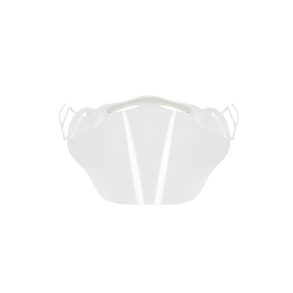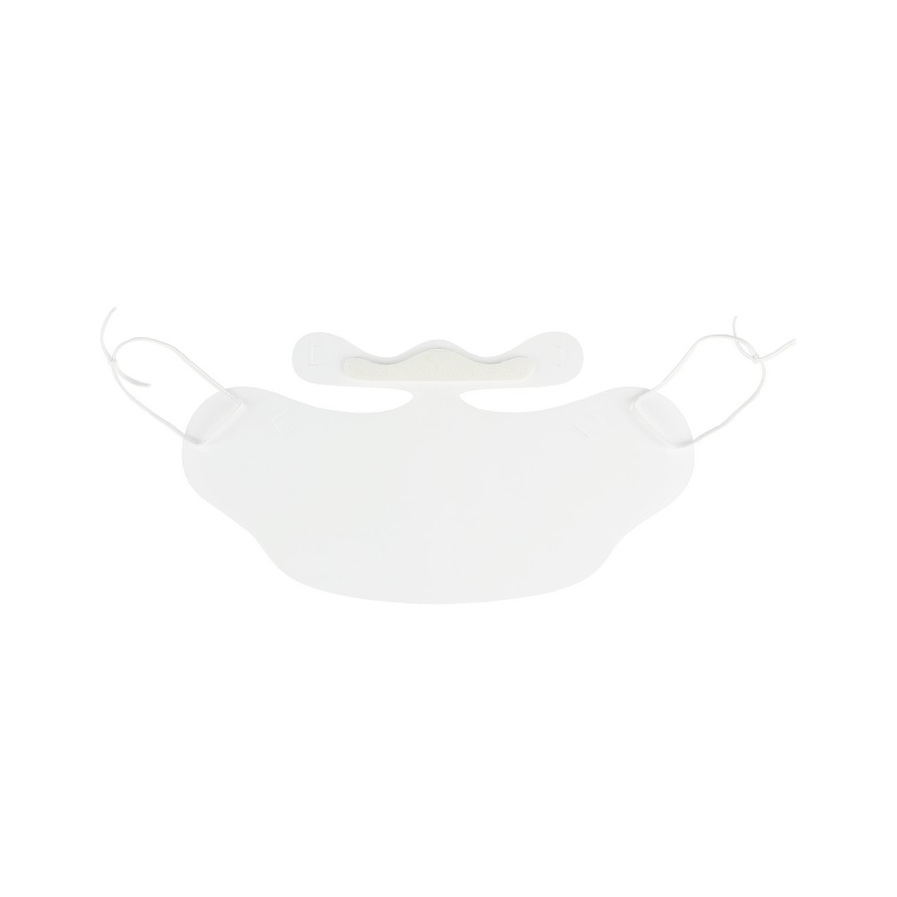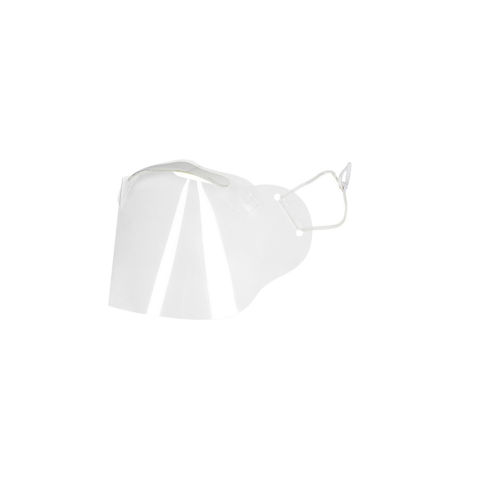 Osłona na nos i usta z elastycznymi mocowaniami, wielokrotnego użytku, wykonana z przezroczystego tworzywa PET, łatwa do dezynfekcji po każdym użyciu, łatwa w montażu, możliwość dopasowania długości gumek, duże otwory umożliwiające łatwą wymianę gumek, odpowiednio wyprofilowana pod okulary, posiada otwory zapobiegające parowaniu okularów, szeroki nosek z pianki poliestrowej dla większego komfortu użytkowania (wyprodukowana w Europie / made in Europe)