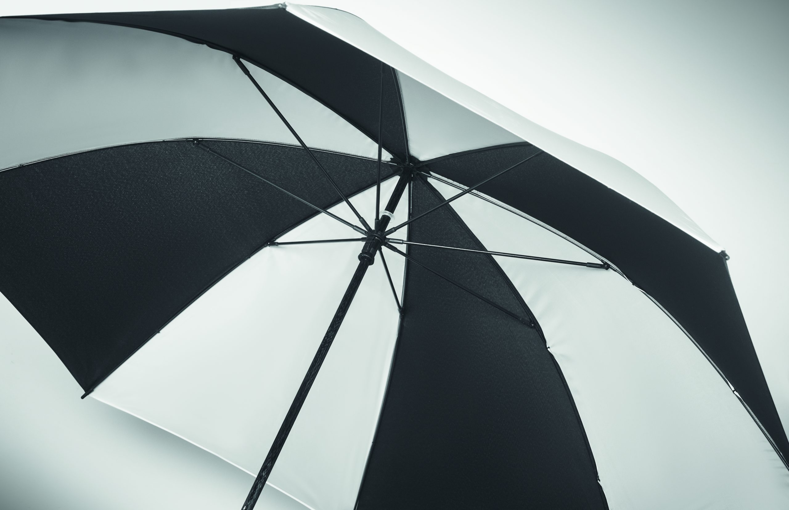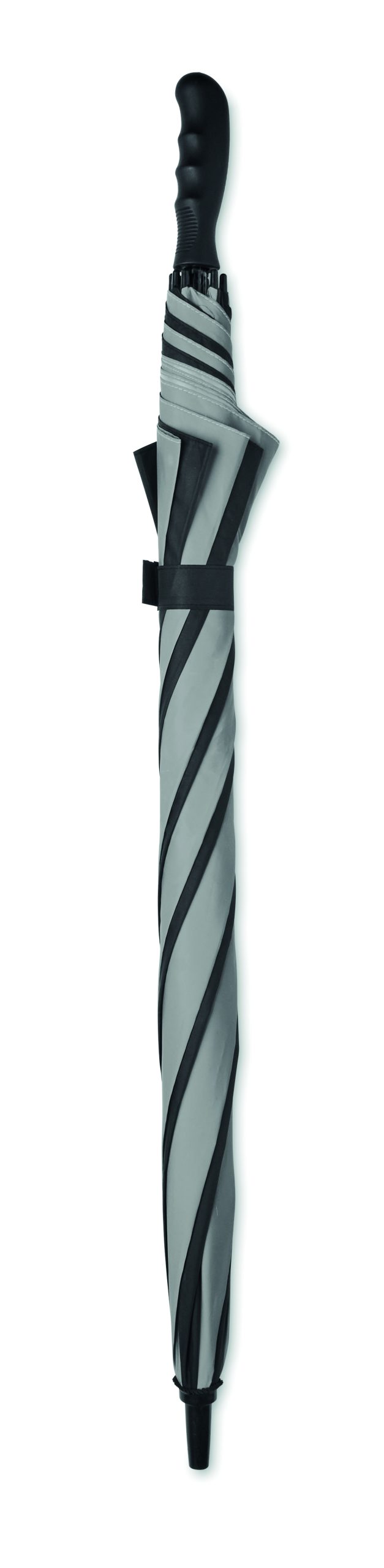 30-calowy, ręcznie otwierany, wiatroodporny parasol z materiału 190T pongee (4 panele) i materiału odblaskowego (4 panele) z ramą, żebrami i trzonem z włókna szklanego. Prosty uchwyt ABS z gumowym wykończeniem. Ręczne zamknięcie.