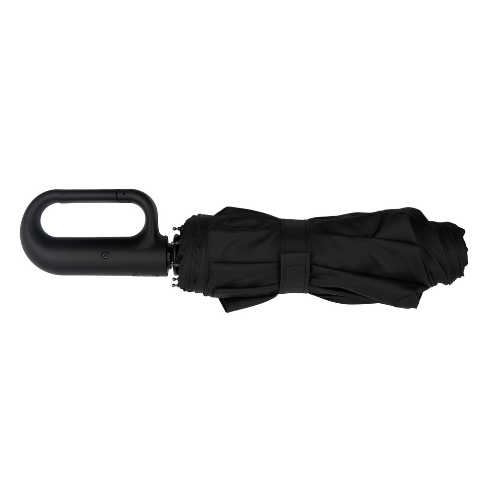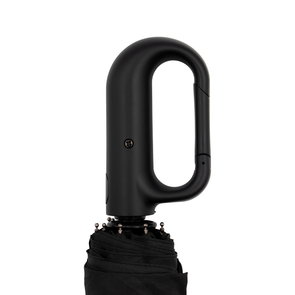 Parasol automatyczny, posiada 8 paneli oraz plastikową rączkę z przyciskiem i karabińczykiem umożliwiającym przypinanie, funkcja automatycznego otwierania i składania, zapięcie na rzep, czarny pokrowiec w komplecie, produkt wykonany między innymi z pongee 180T
