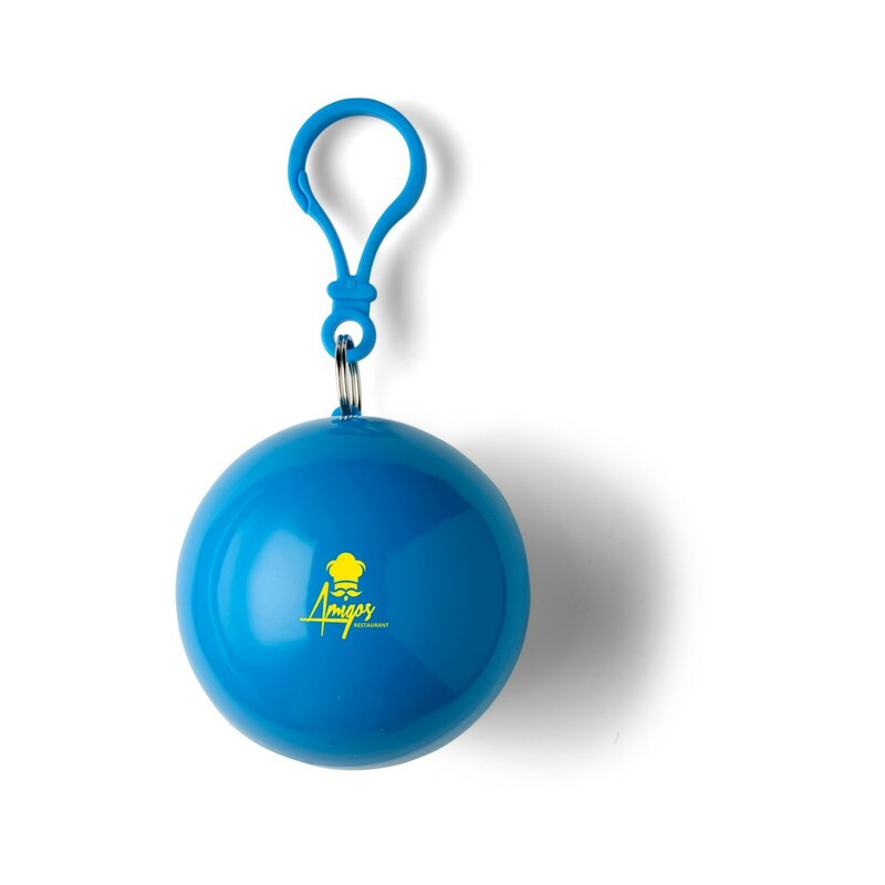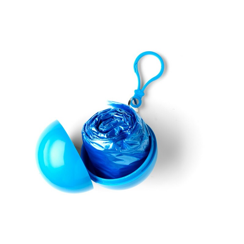 Peleryna przeciwdeszczowa w kulce o błyszczącym wykończeniu i karabińczykiem umożliwiającym przypinanie, produkt wykonany z ABS i PVC