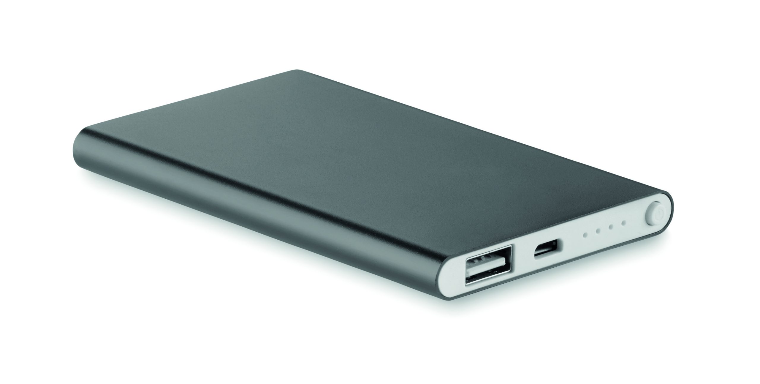 Power bank 4000 mAh z aluminium pochodzącego z recyklingu. Pojemność do smartfonów, prąd wyjściowy DC5V/1A. Zawiera lampkę kontrolną i kabel USB z wtyczką micro USB.