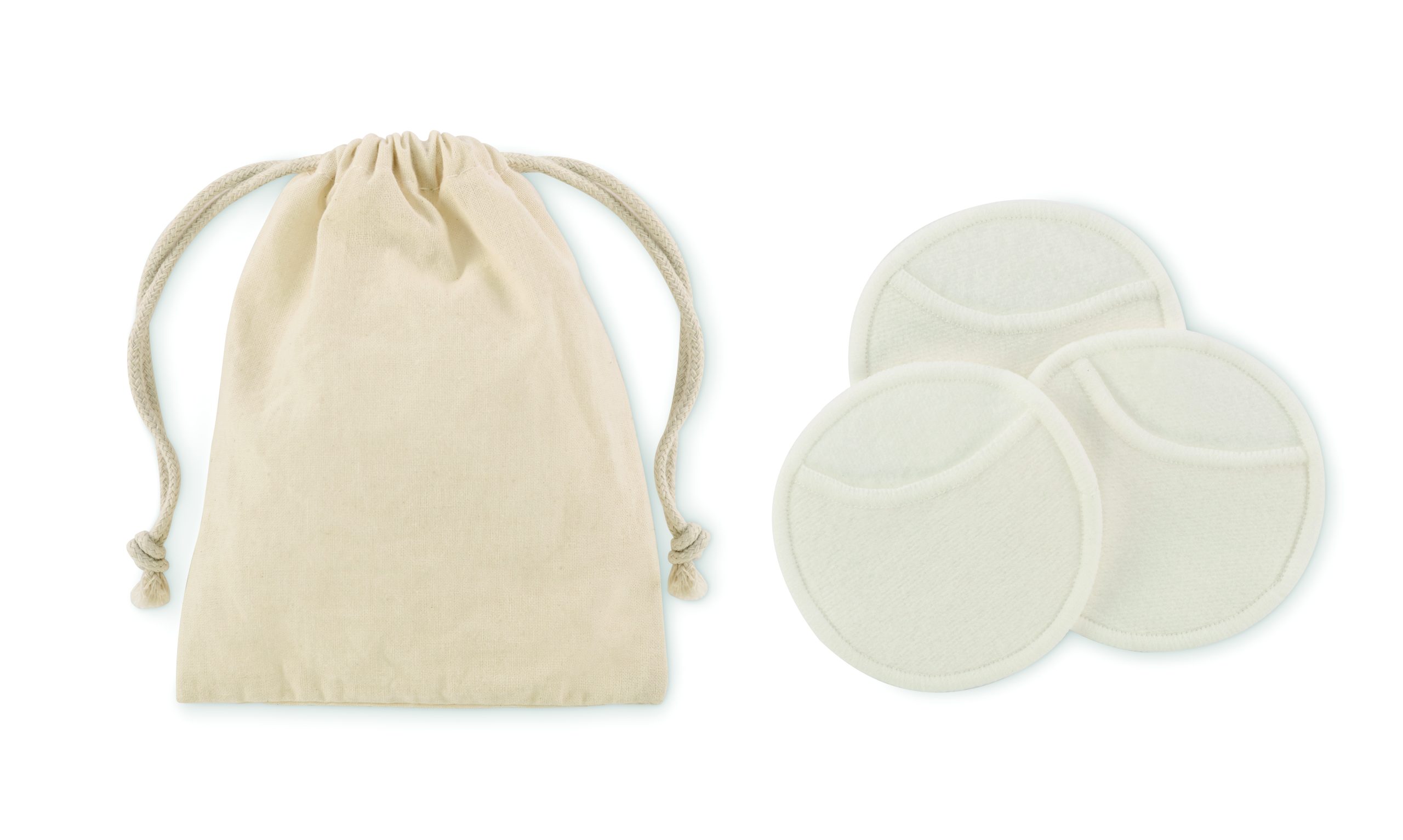3 sztuki miękkich płatków kosmetycznych wielokrotnego użytku (średnica 8 cm) wykonanych w 70% z włókna bambusowego i w 30% z bawełny w bawełnianym woreczku.