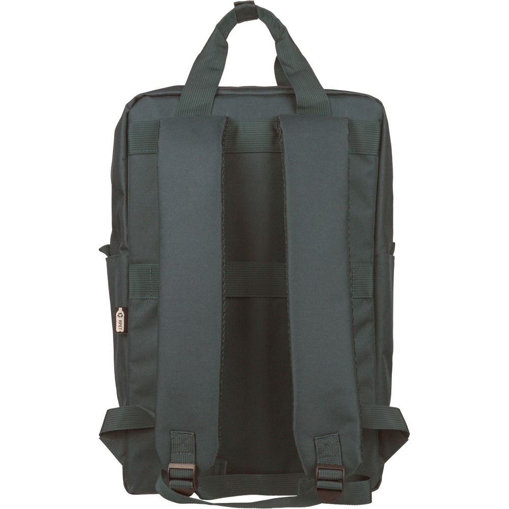 Plecak, podszewka z poliestru 210D, główna kieszeń zapinana na zamek, wewnętrzna przegroda na laptopa 16″, mniejsza przednia kieszeń zapinana na zamek, regulowane i wentylowane paski do noszenia, pasek do przymocowania do walizki, kieszenie boczne po obu stronach, produkt wykonany z poliestru 600D z recyklingu