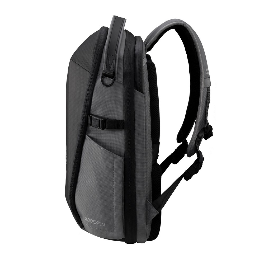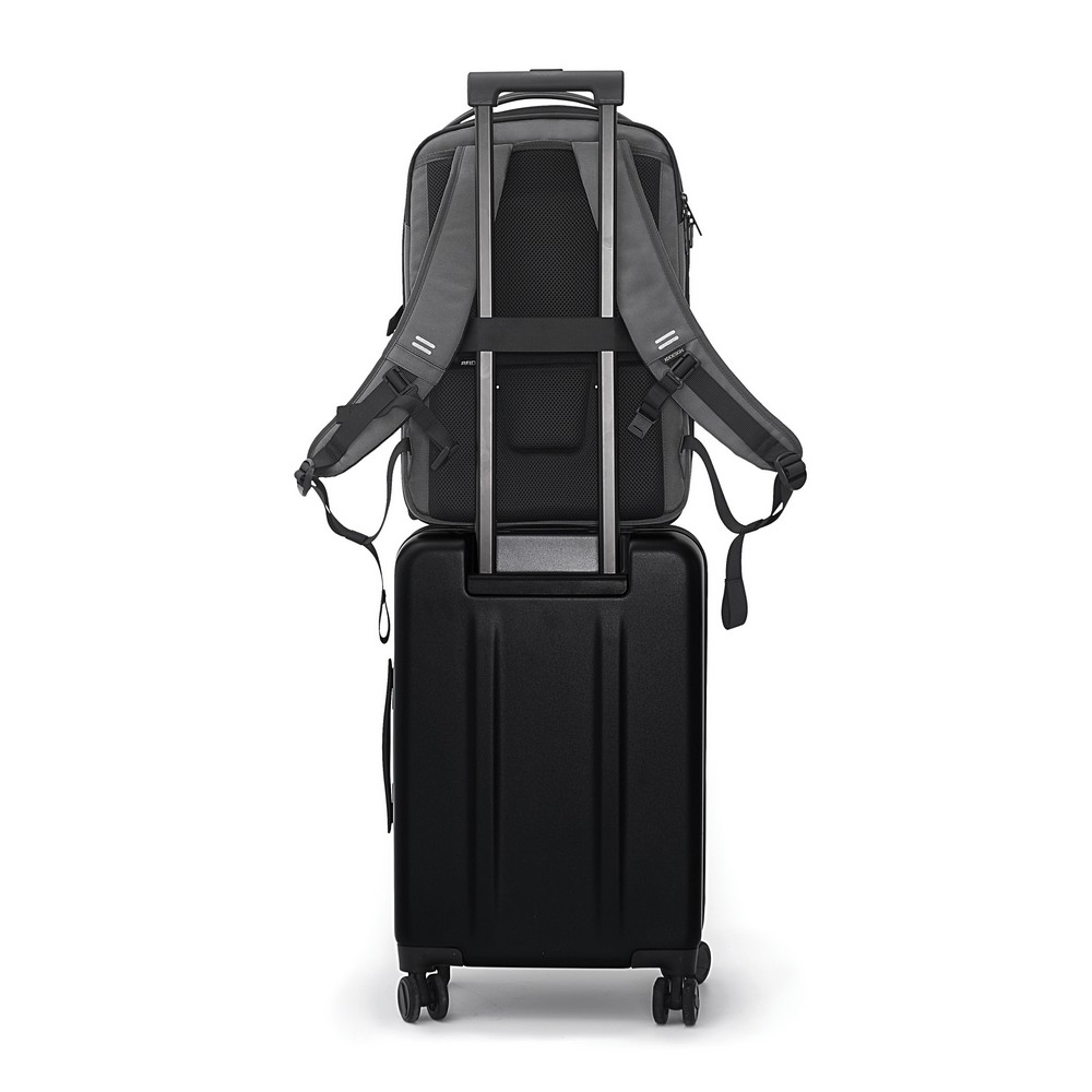 Plecak na laptopa do 16”, przegroda główna otwierana pod kątem 180 stopni, wewnątrz kieszenie z siatki, wiele kieszeni na zewnątrz, kieszeń na butelkę zamykana na magnes, kieszeń z odpinaną smyczą na klucze, wodoodporny, wykonany z materiałów pochodzących z recyklingu, posiada wbudowany znacznik AWARE™, który potwierdza wykorzystanie materiałów z recyklingu, ślad węglowy produktu: 8,03 kg CO2