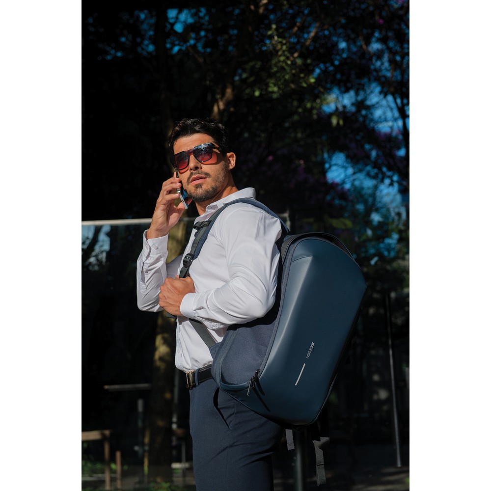 Plecak na laptopa do 16”, przegroda główna otwierana pod kątem 180 stopni, wewnątrz kieszenie z siatki, wiele kieszeni na zewnątrz, kieszeń na butelkę zamykana na magnes, kieszeń z odpinaną smyczą na klucze, wodoodporny, wykonany z materiałów pochodzących z recyklingu, posiada wbudowany znacznik AWARE™, który potwierdza wykorzystanie materiałów z recyklingu, ślad węglowy produktu: 8,03 kg CO2
