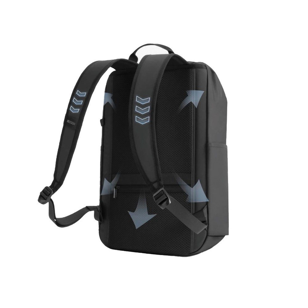 Plecak chroniący przed kieszonkowcami, zwijana przegroda główna i zamek szyfrowy wzmocniony stalą umożliwiający całkowite zamknięcie plecaka, zamek może posłużyć również do przypięcia plecaka do stałego obiektu, ukryte kieszenie do przechowywania dokumentów i kart kredytowych z tyłu torby oraz w pasku na ramię z ochroną RFID, kieszeń boczna, odpinana elastyczna siatka na sprzęt sportowy w komplecie, wewnątrz usztywnione przegrody na laptopa 16″ lub tablet, siateczkowe kieszenie na inne przedmioty osobiste, całkowita zawartość materiałów z recyklingu obliczona w oparciu o wagę całkowitą przedmiotu: 11%, wzór zastrzeżony®