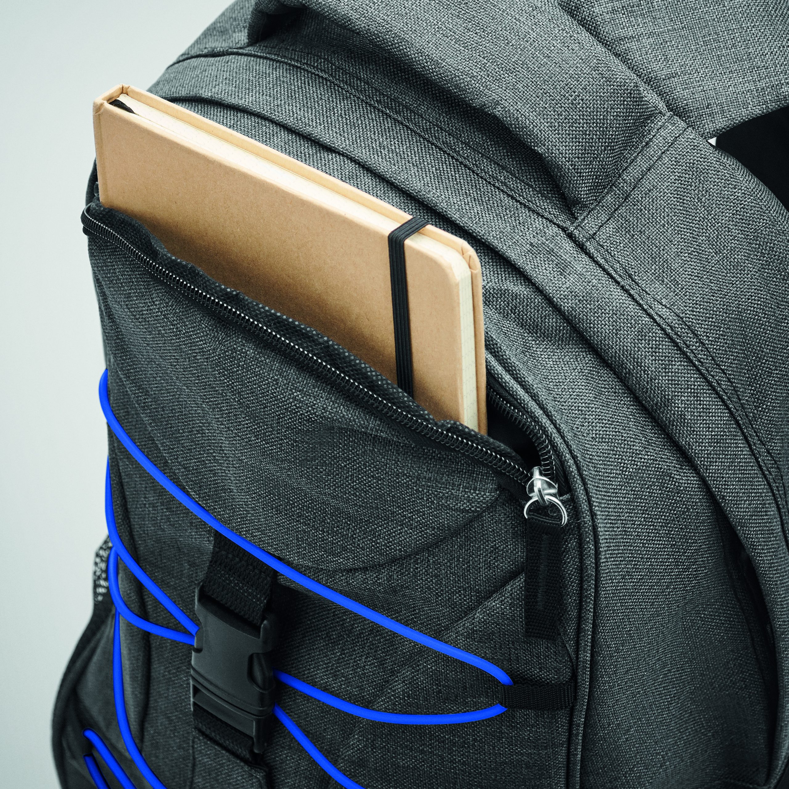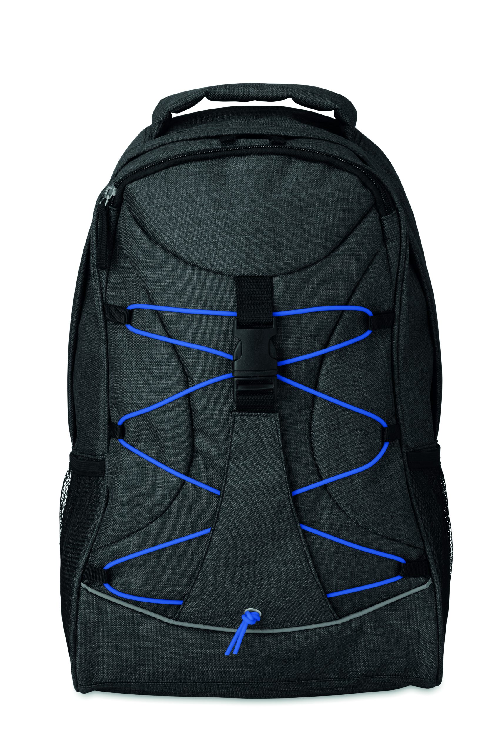 Plecak wykonany z 2-kolorowego poliestru 600D z kontrastującym kolorowym sznurkiem świecącym w ciemności. Siatkowe kieszenie po obu stronach.