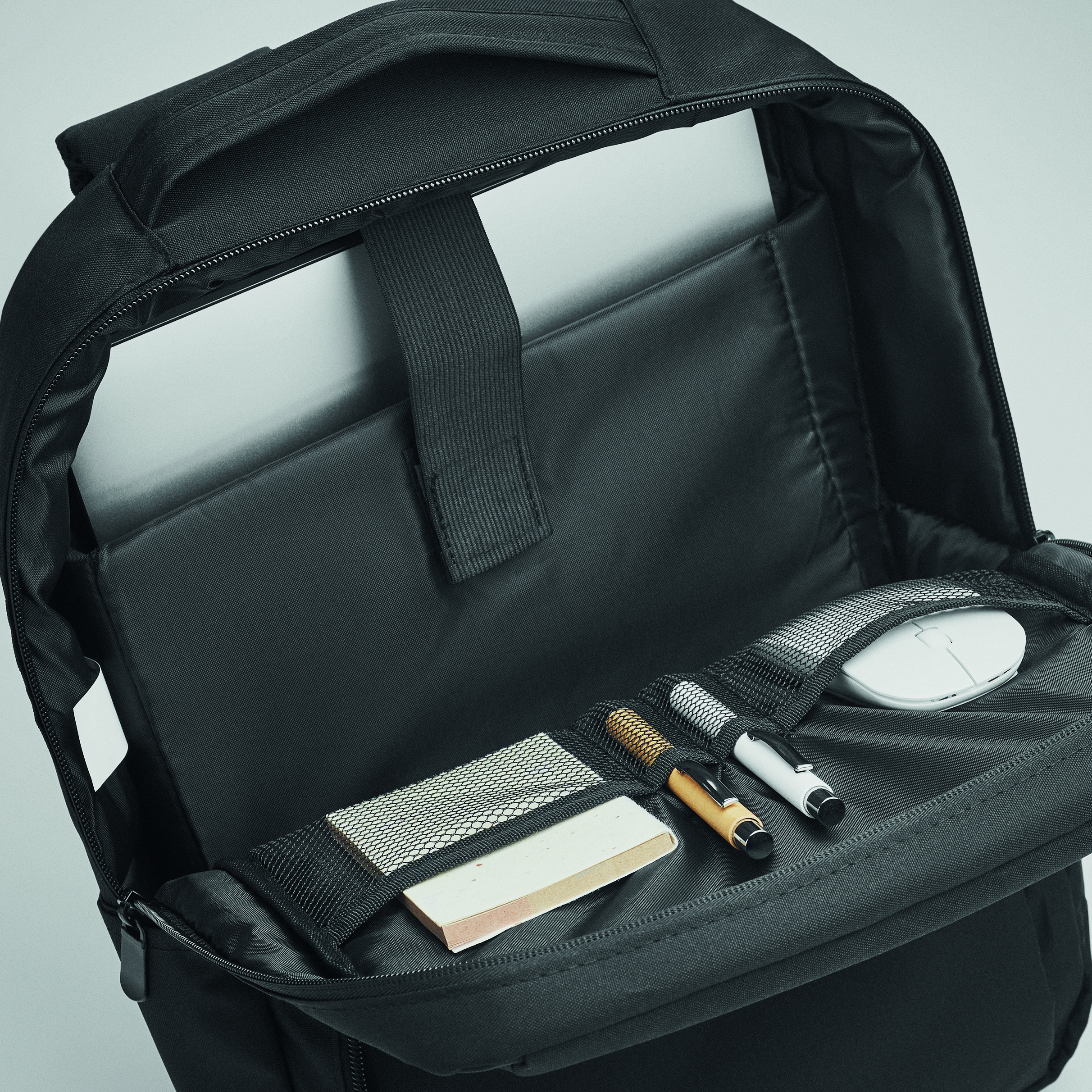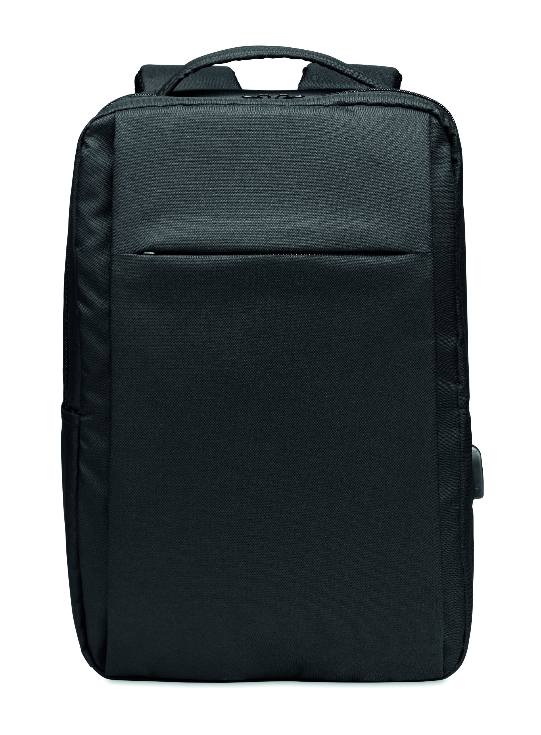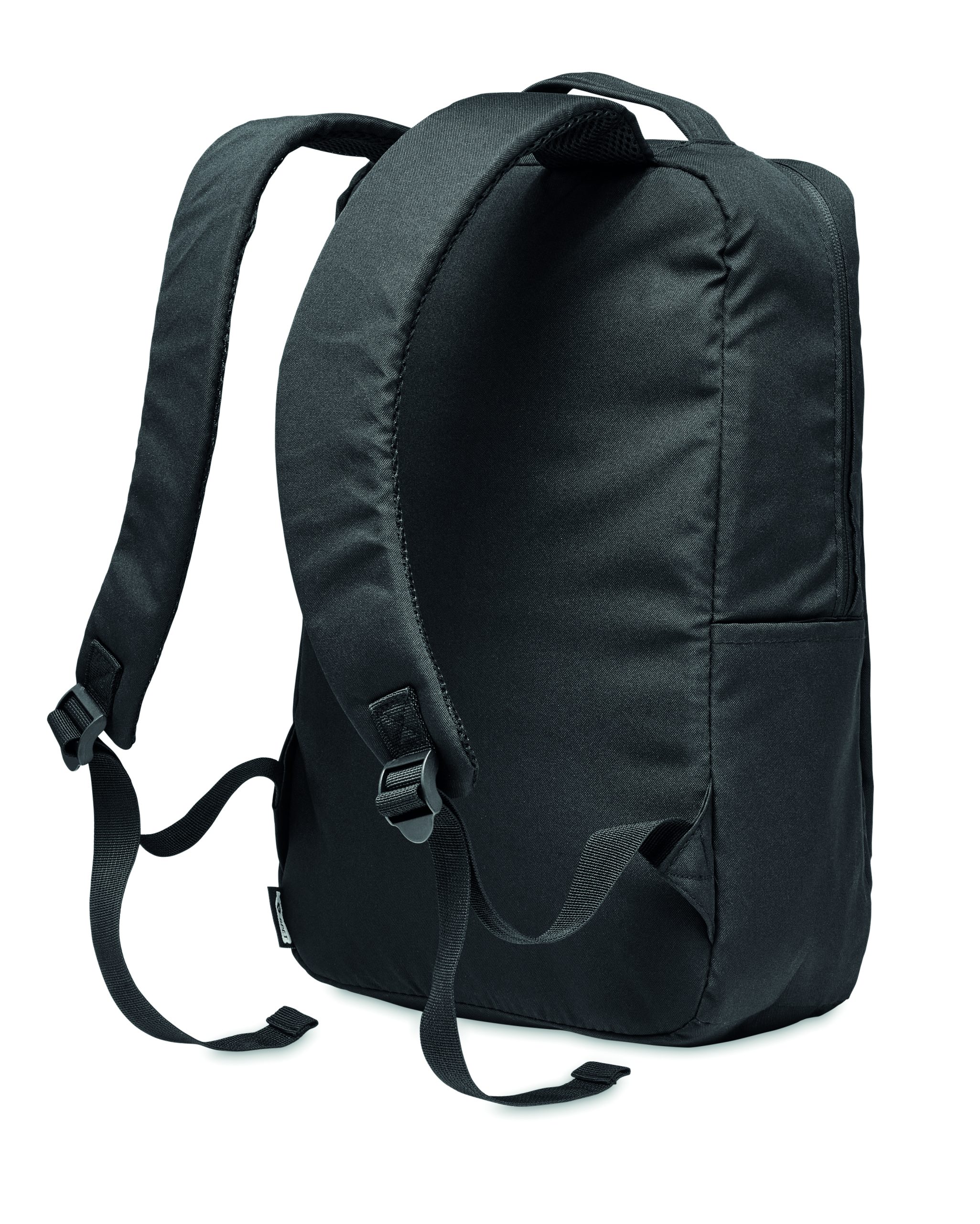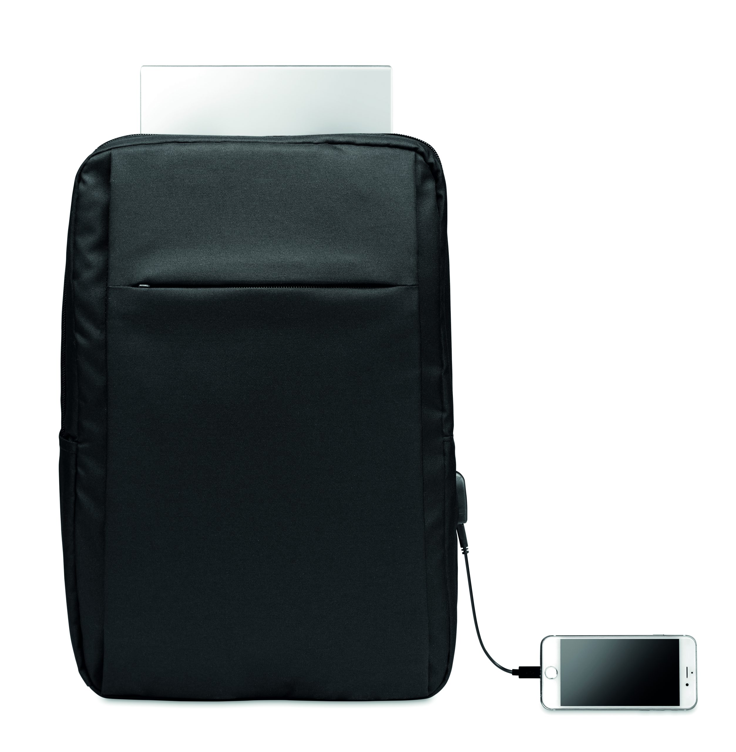 Plecak na komputer z poliestru 300D RPET z wyściełanym paskiem na ramię, zawiera jedną główną komorę wewnętrzną na laptopa 13 cali i kabel USB do ładowania.