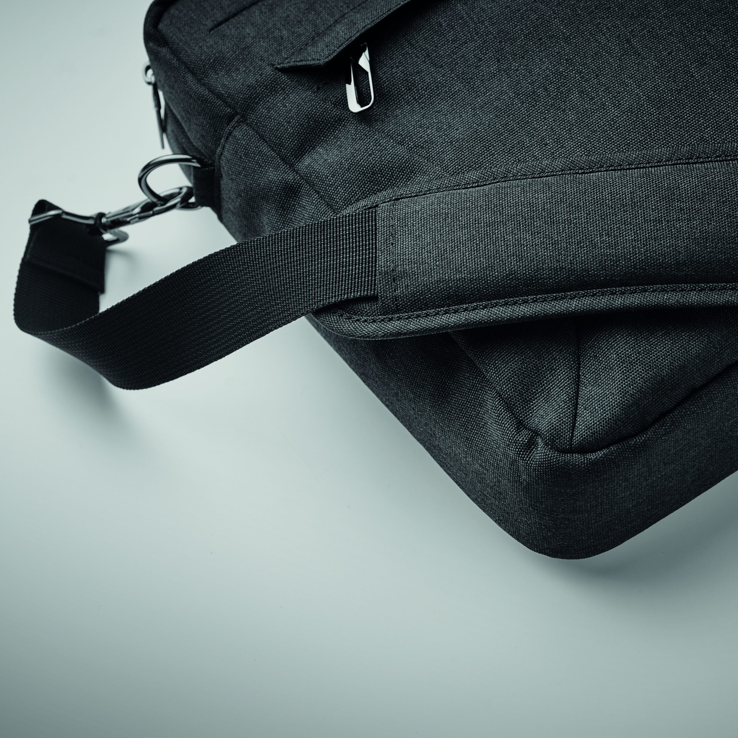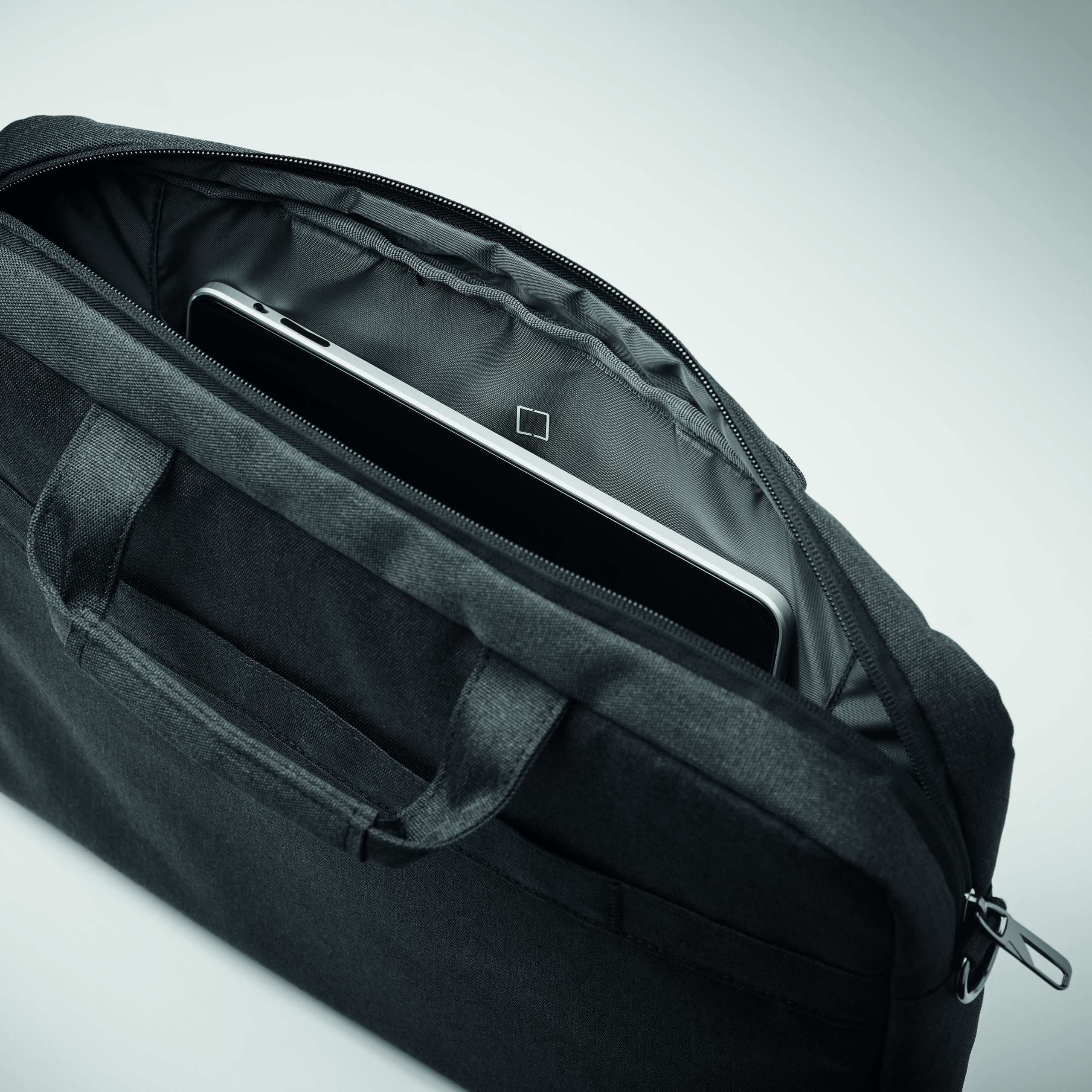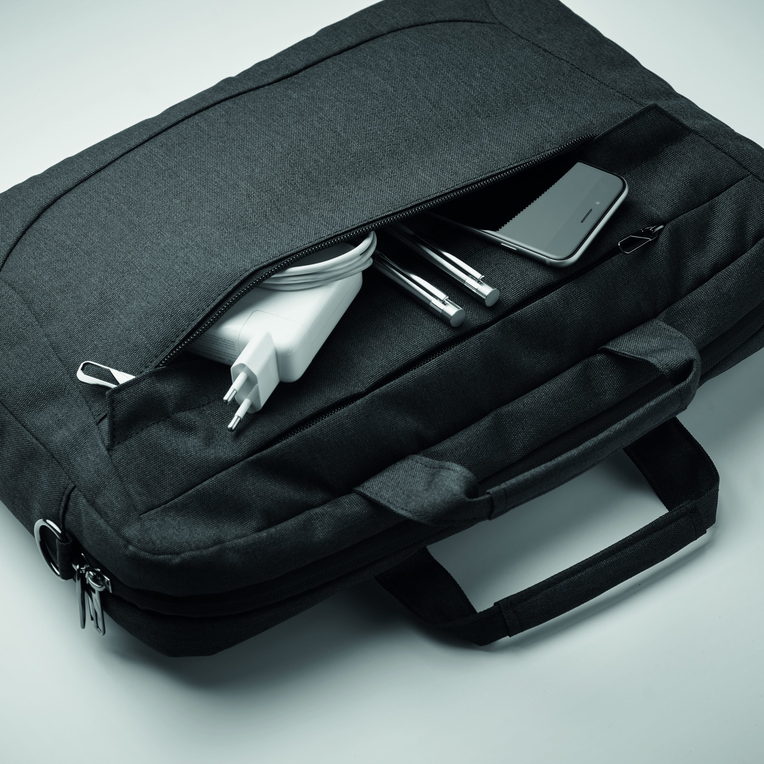 Torba na laptopa 15 cali z poliestru 600D RPET. 2 główne komory wewnętrzne na laptop i tablet, duża kieszeń przednia na zamek błyskawiczny. Posiada małą kieszeń zapinaną na zamek błyskawiczny. Odpinane i regulowane szelki. Uchwyt na walizkę z tyłu.