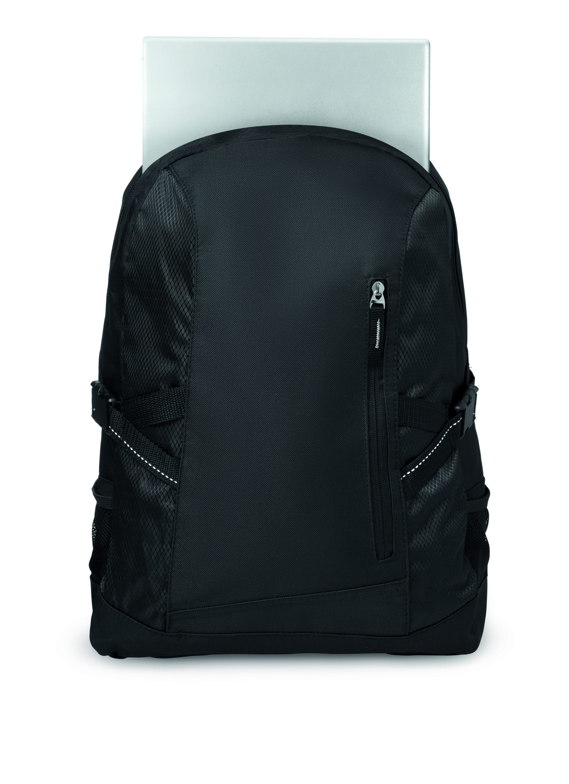 Plecak na laptop 15” z poliestru 600D z wodoszczelnymi elementami. Zawiera 1 przegrodę na laptop 15”, 1 przednią kieszeń na zamek oraz 2 boczne kieszenie. Regulowane paski na ramiona.