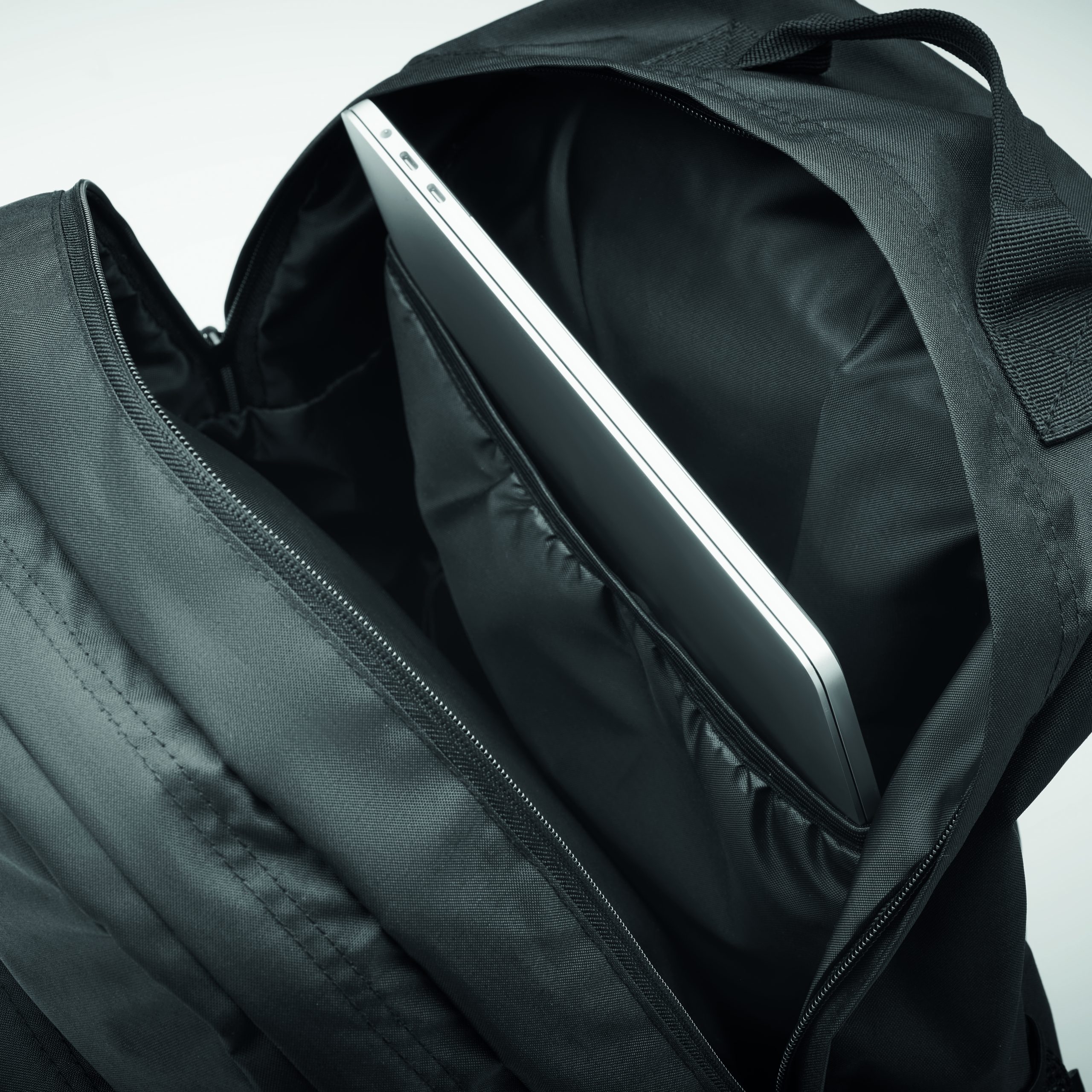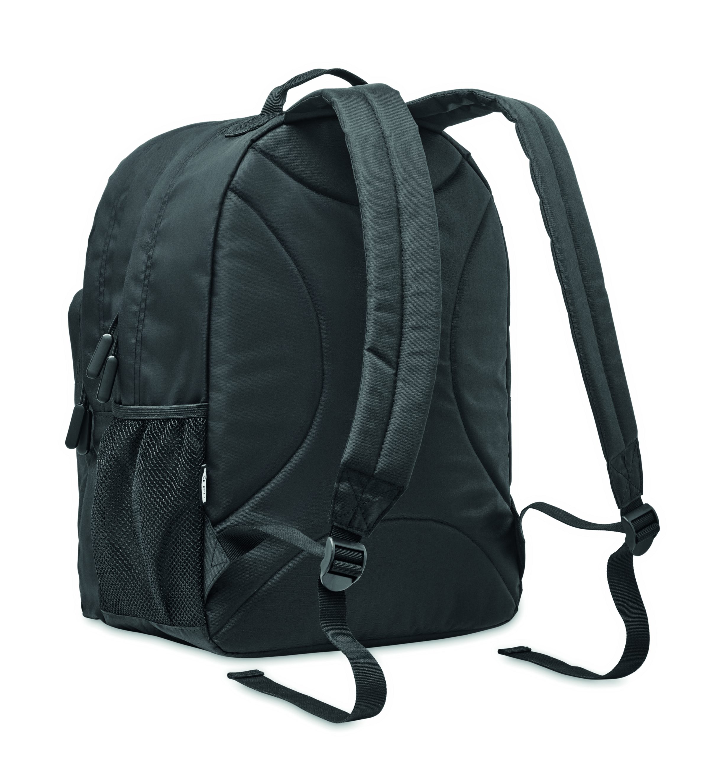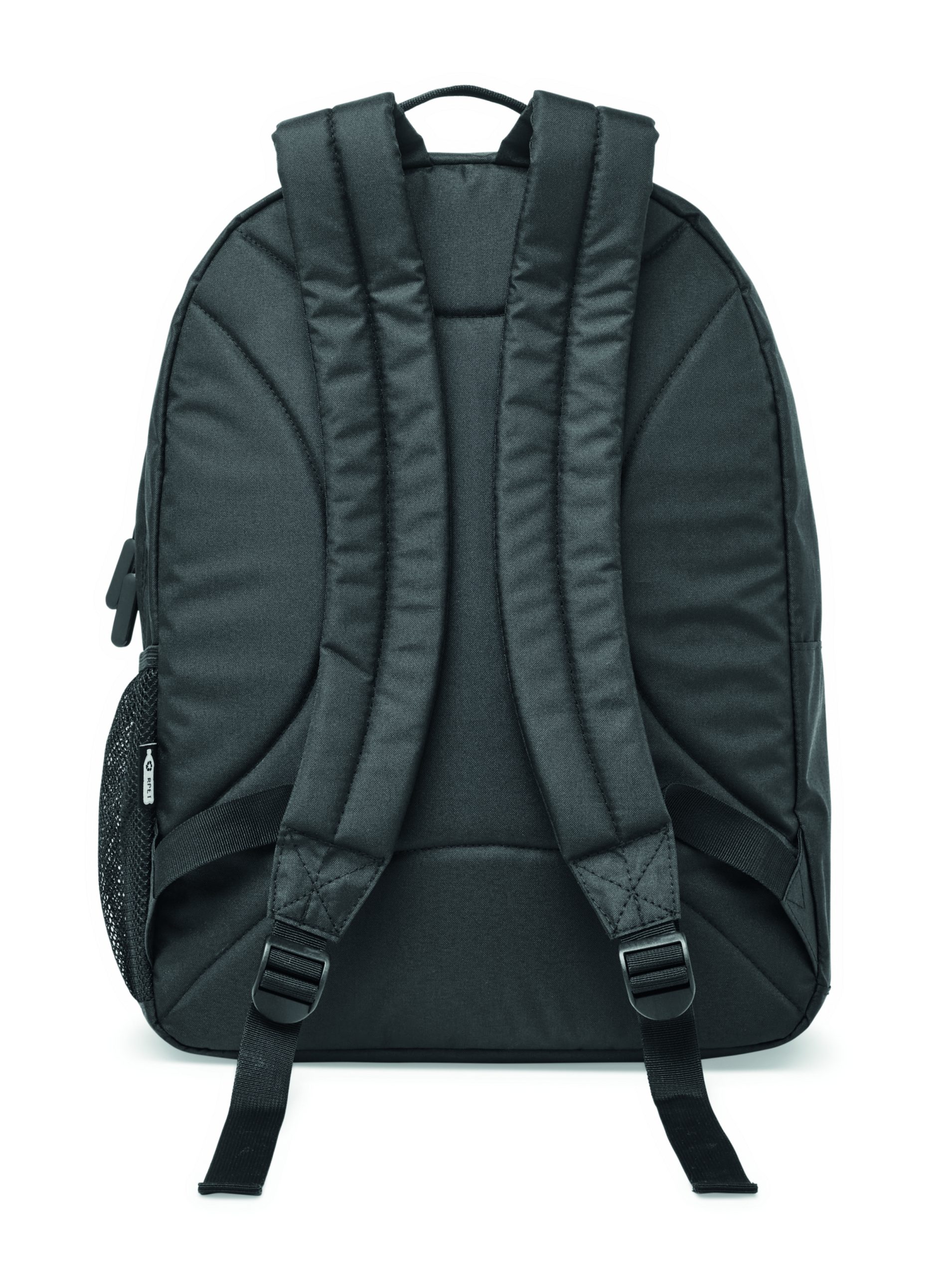 Plecak na laptopa 15 cali z poliestru 300D RPET. Posiada 2 duże komory zapinane na zamek błyskawiczny, podwójnie zasuwane kieszenie przednie i boczną kieszeń z siateczki. Wyściełane plecy i szelki.