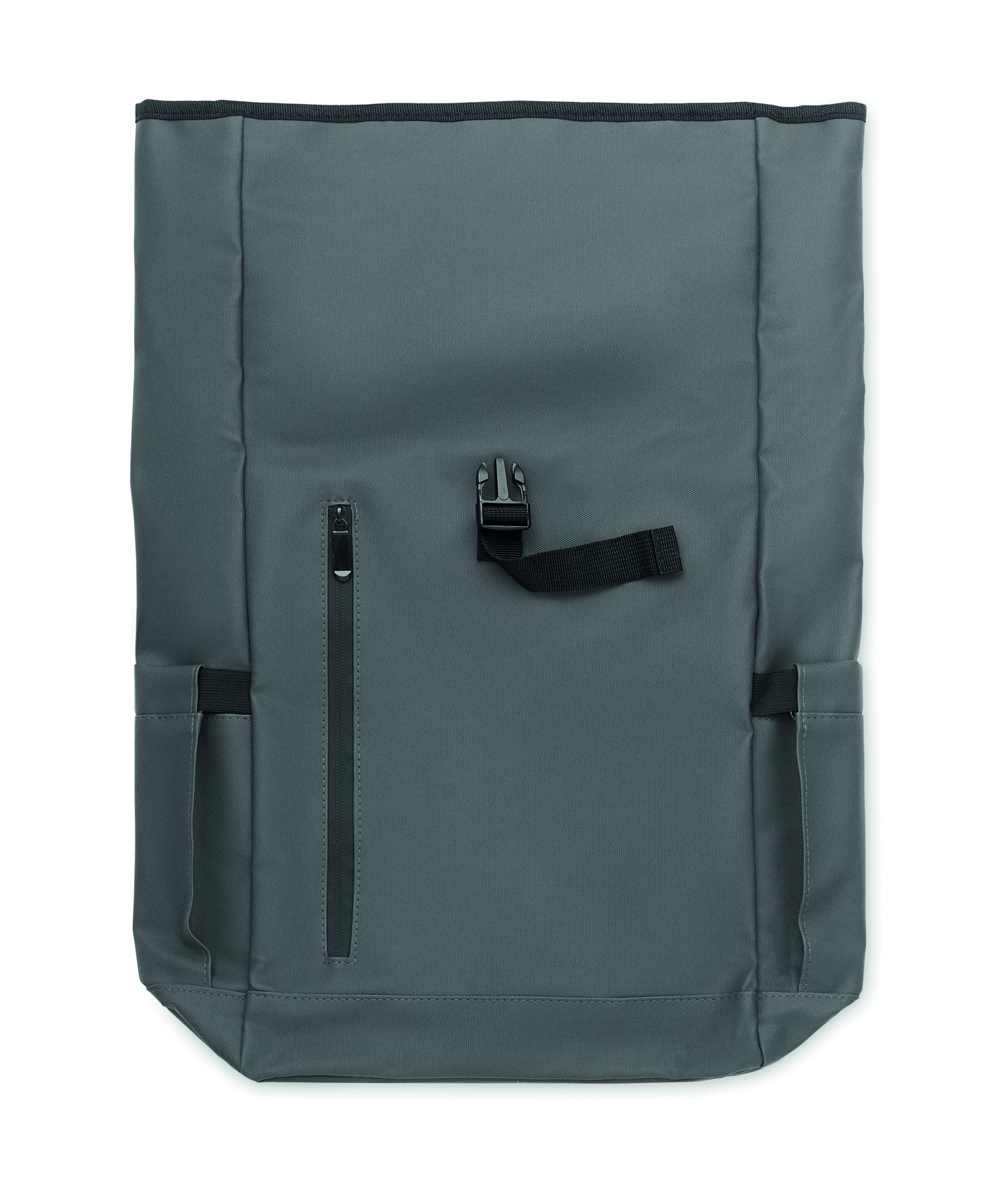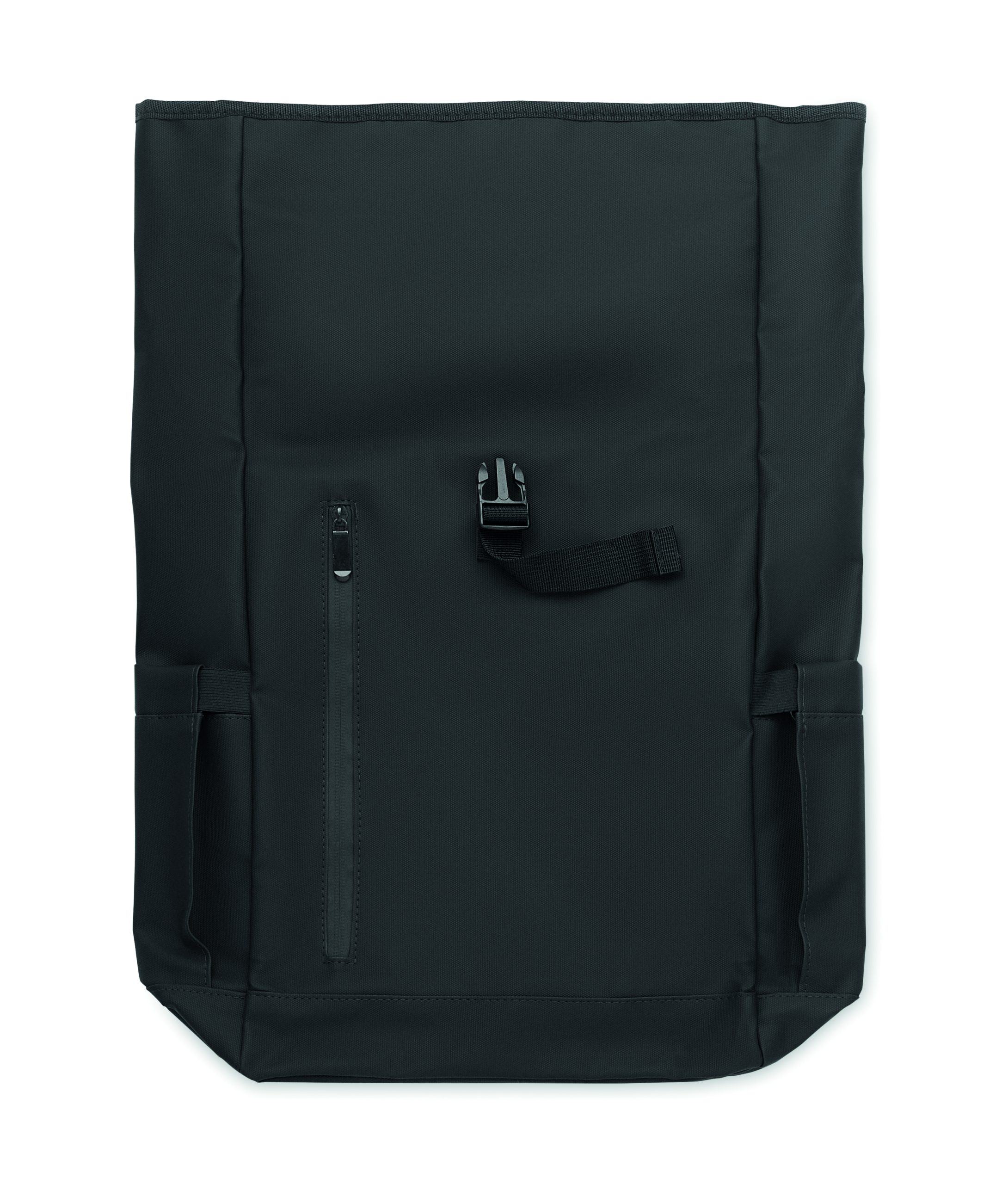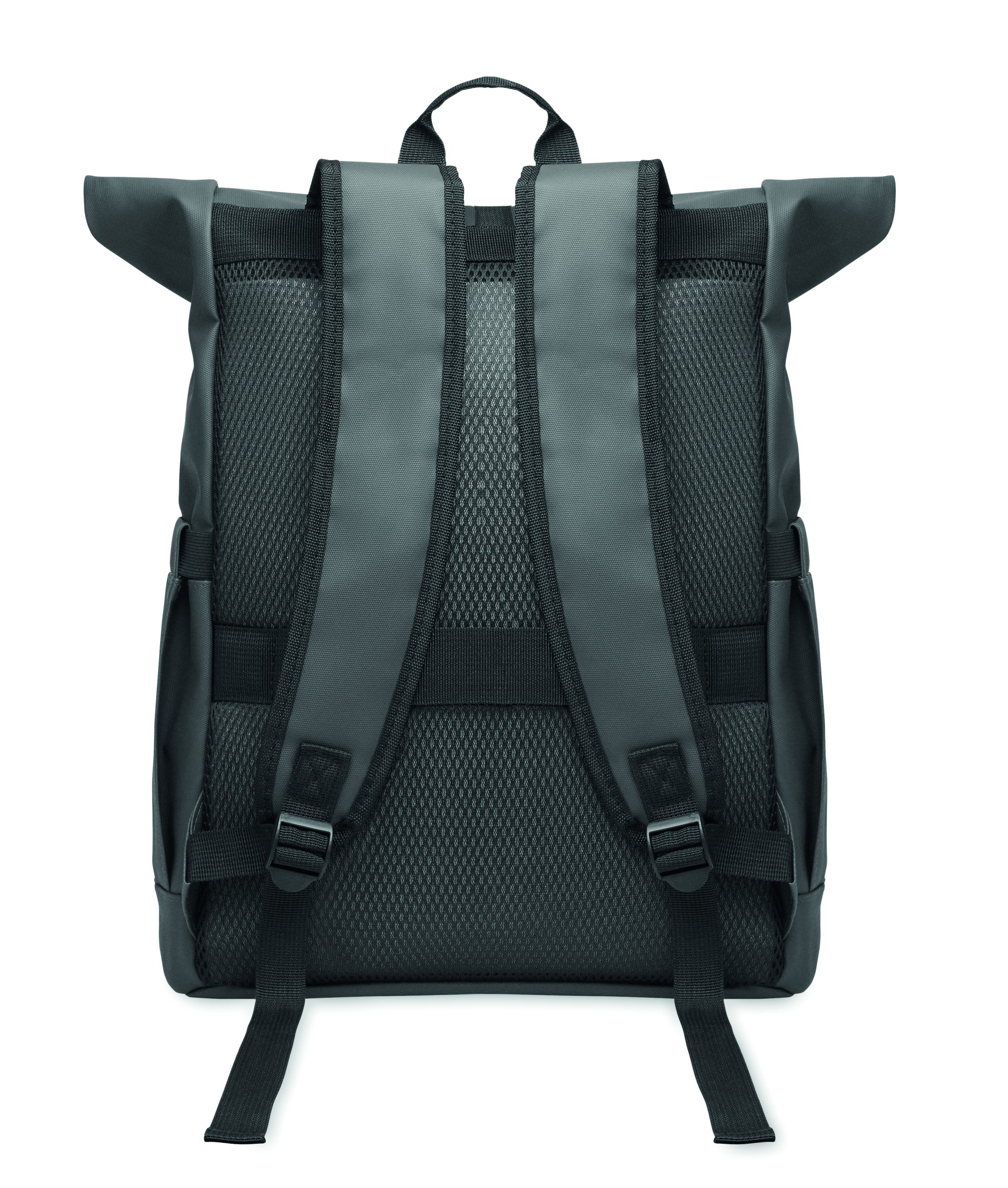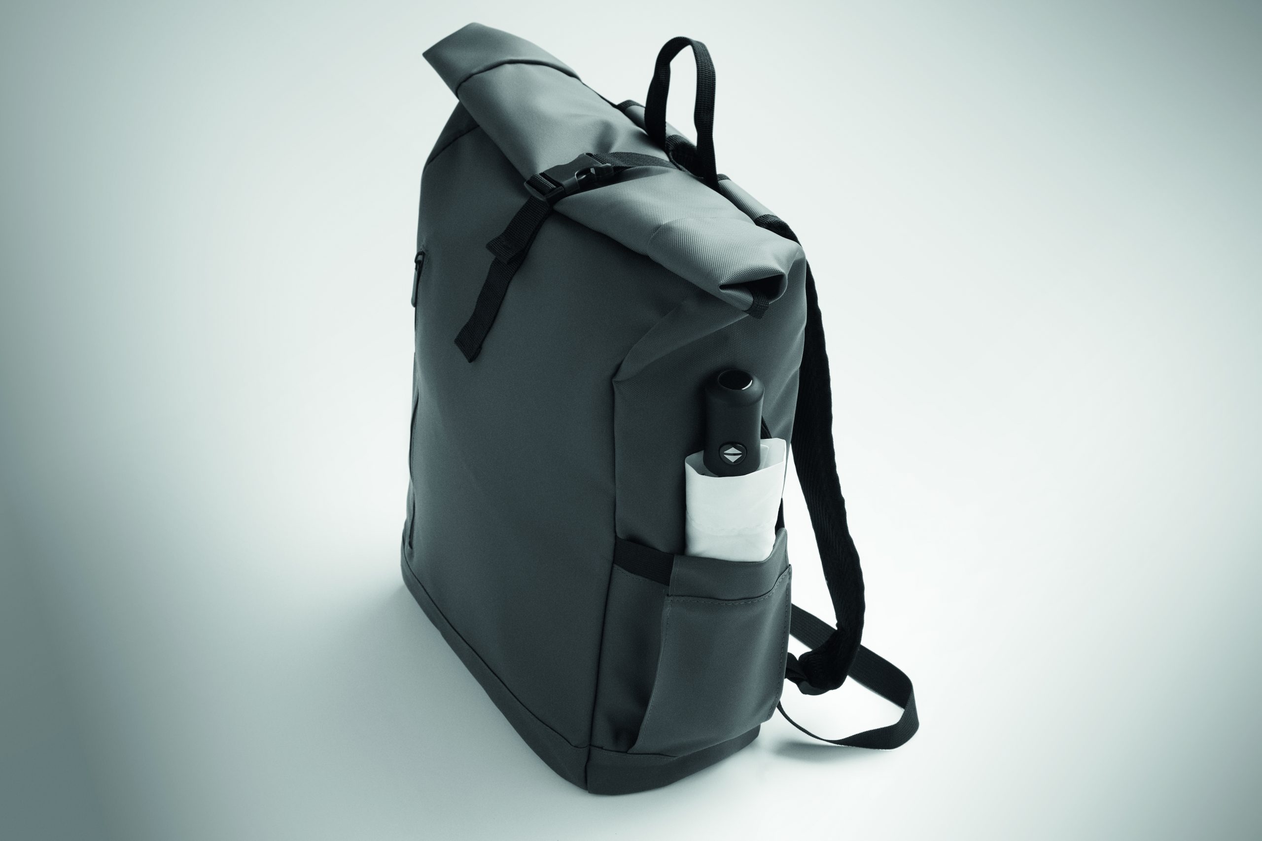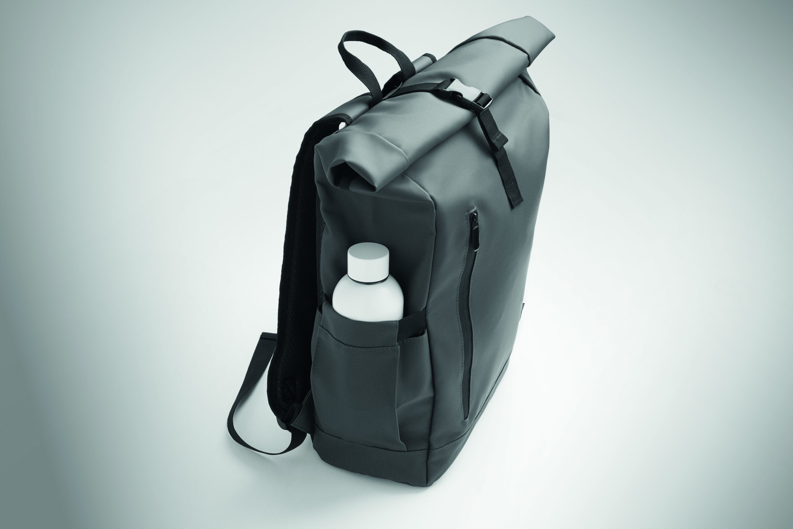 Plecak na laptop typu rolltop z powlekanego PU poliestru 600D RPET i podszewką z poliestru RPET. Wyściełane plecy z kieszenią na zamek i paskiem na walizkę. Wyściełany pasek na ramię z wewnętrznym wykończeniem z siatki.