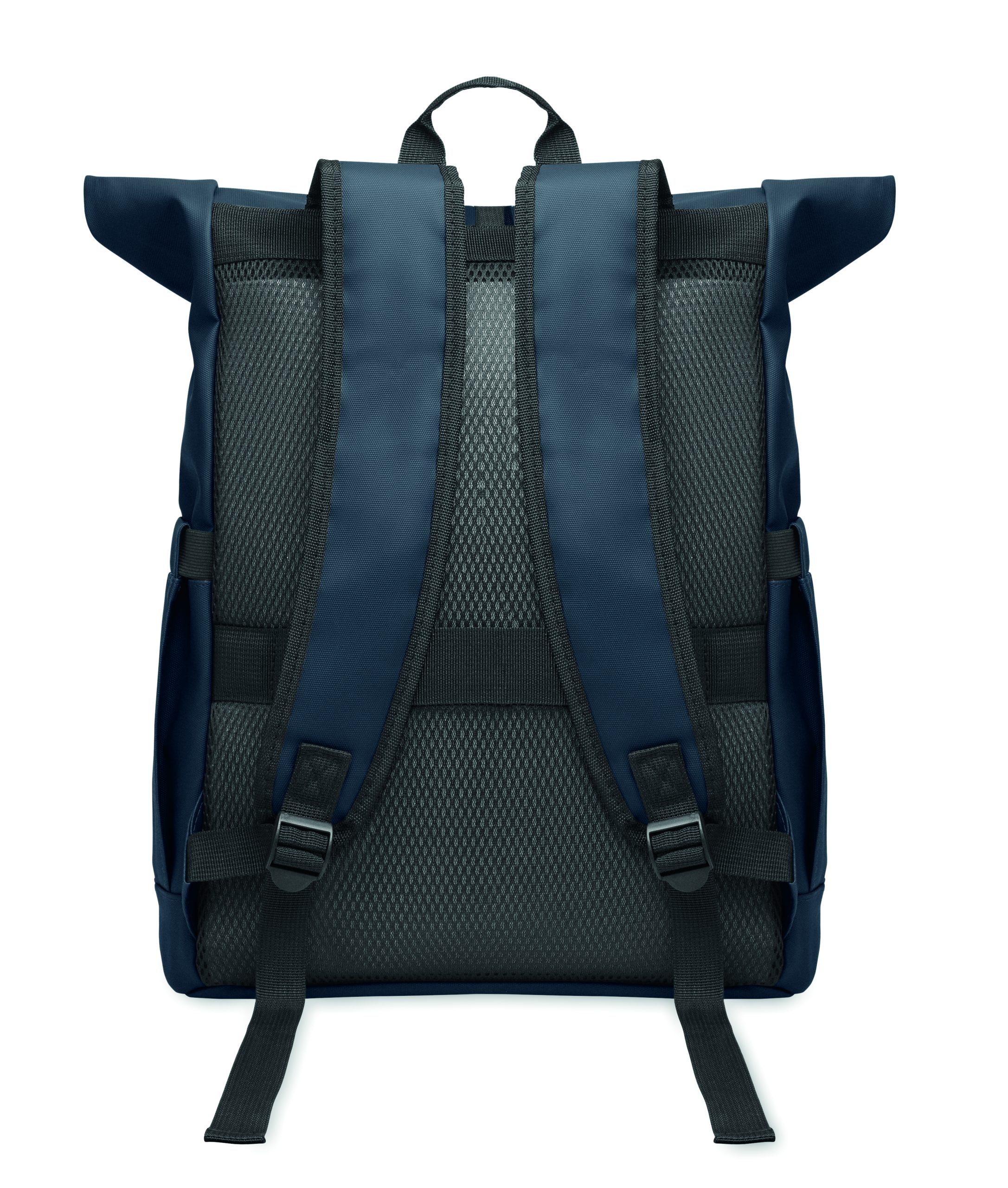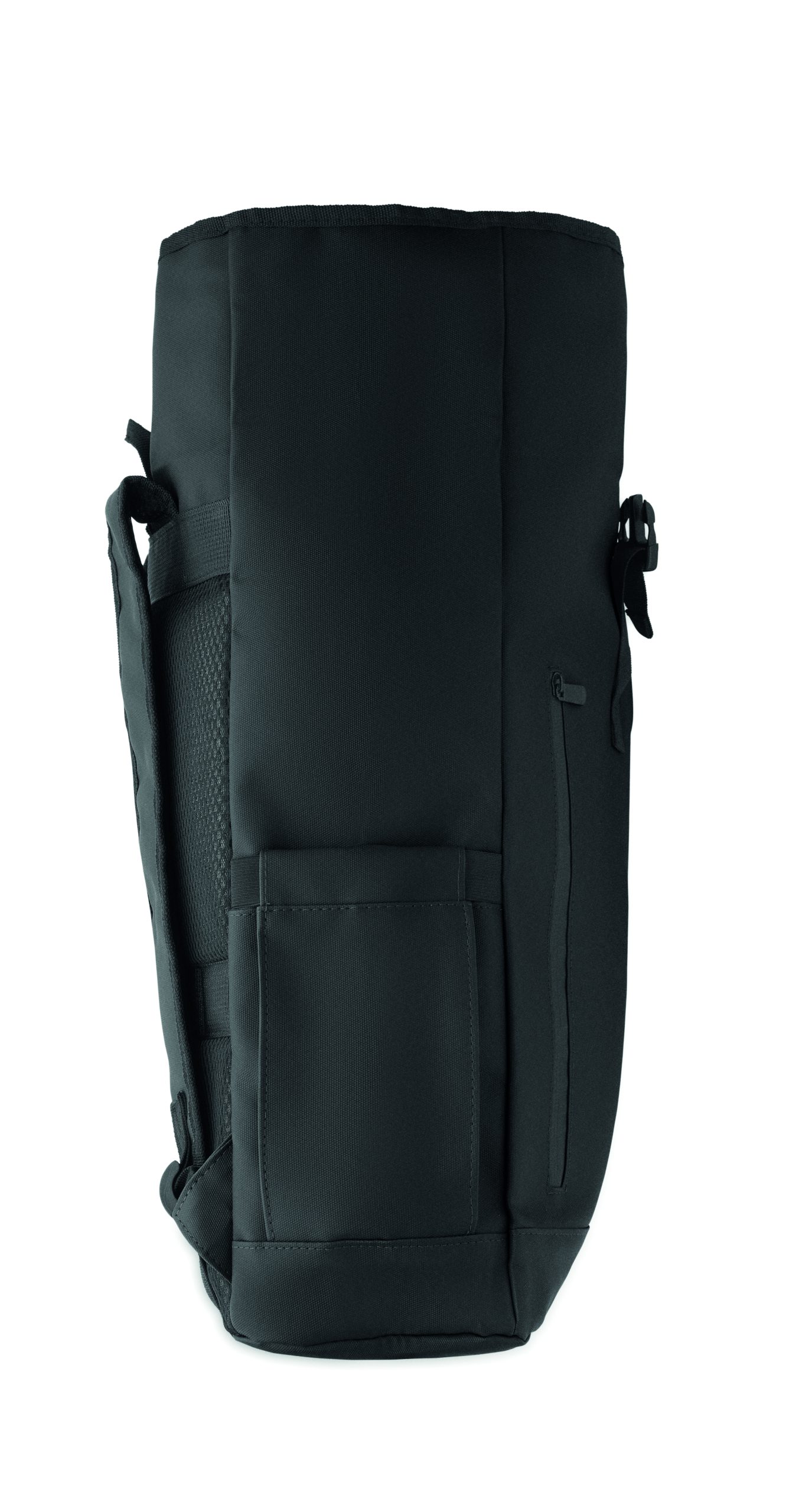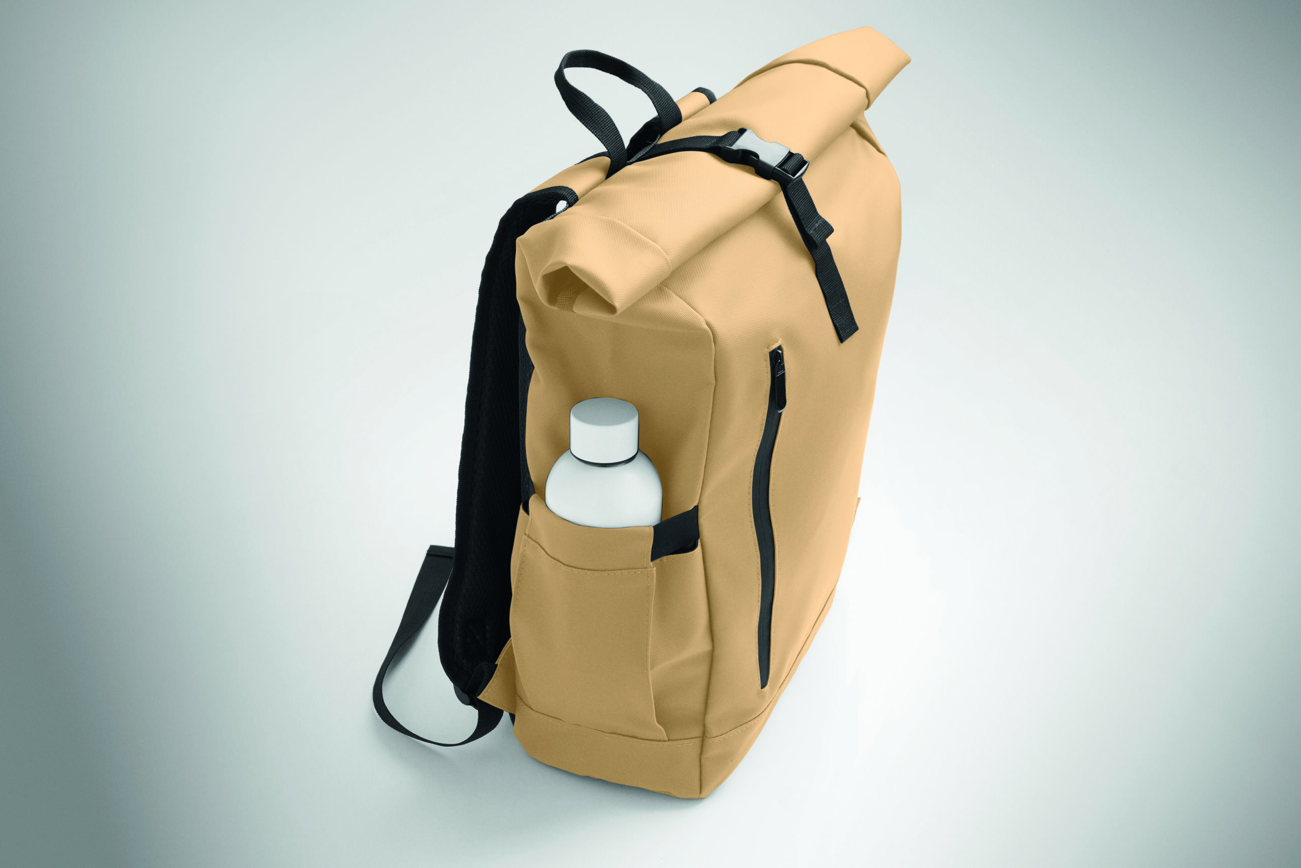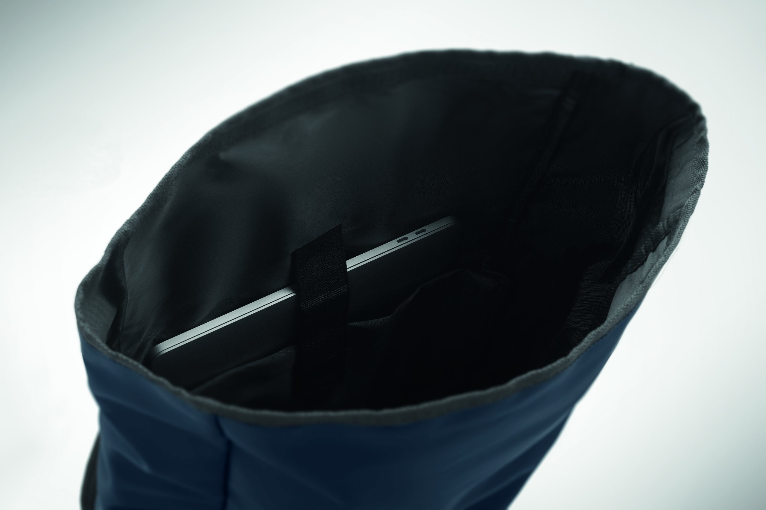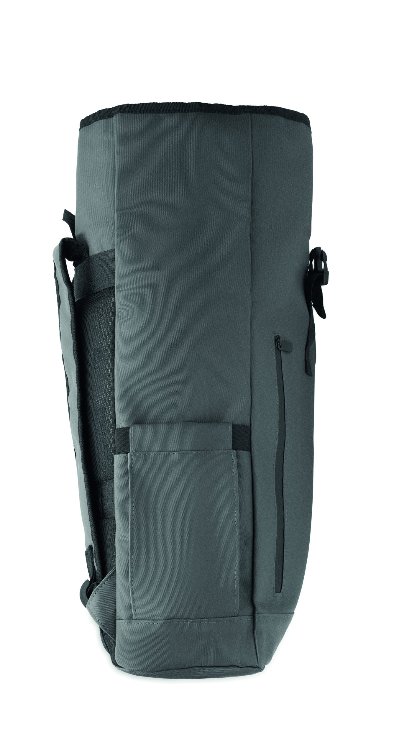 Plecak na laptop typu rolltop z powlekanego PU poliestru 600D RPET i podszewką z poliestru RPET. Wyściełane plecy z kieszenią na zamek i paskiem na walizkę. Wyściełany pasek na ramię z wewnętrznym wykończeniem z siatki.