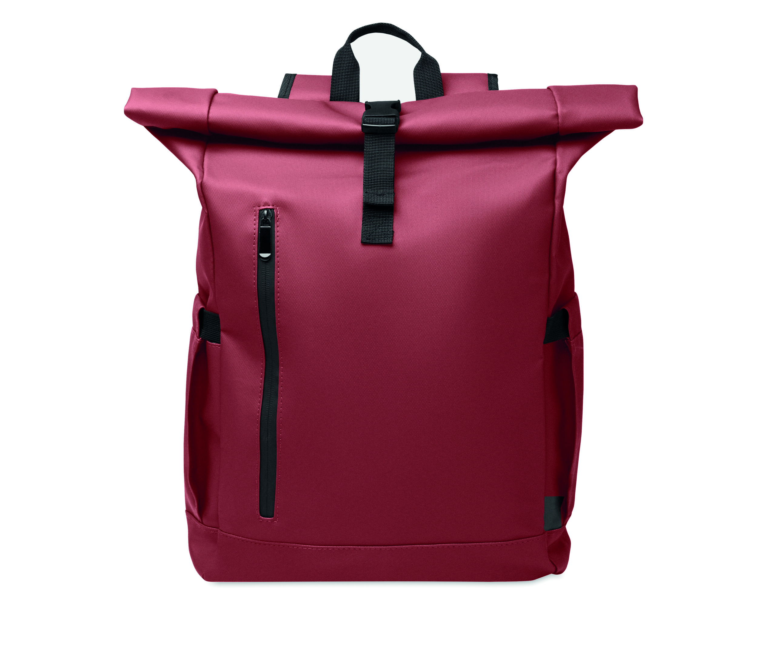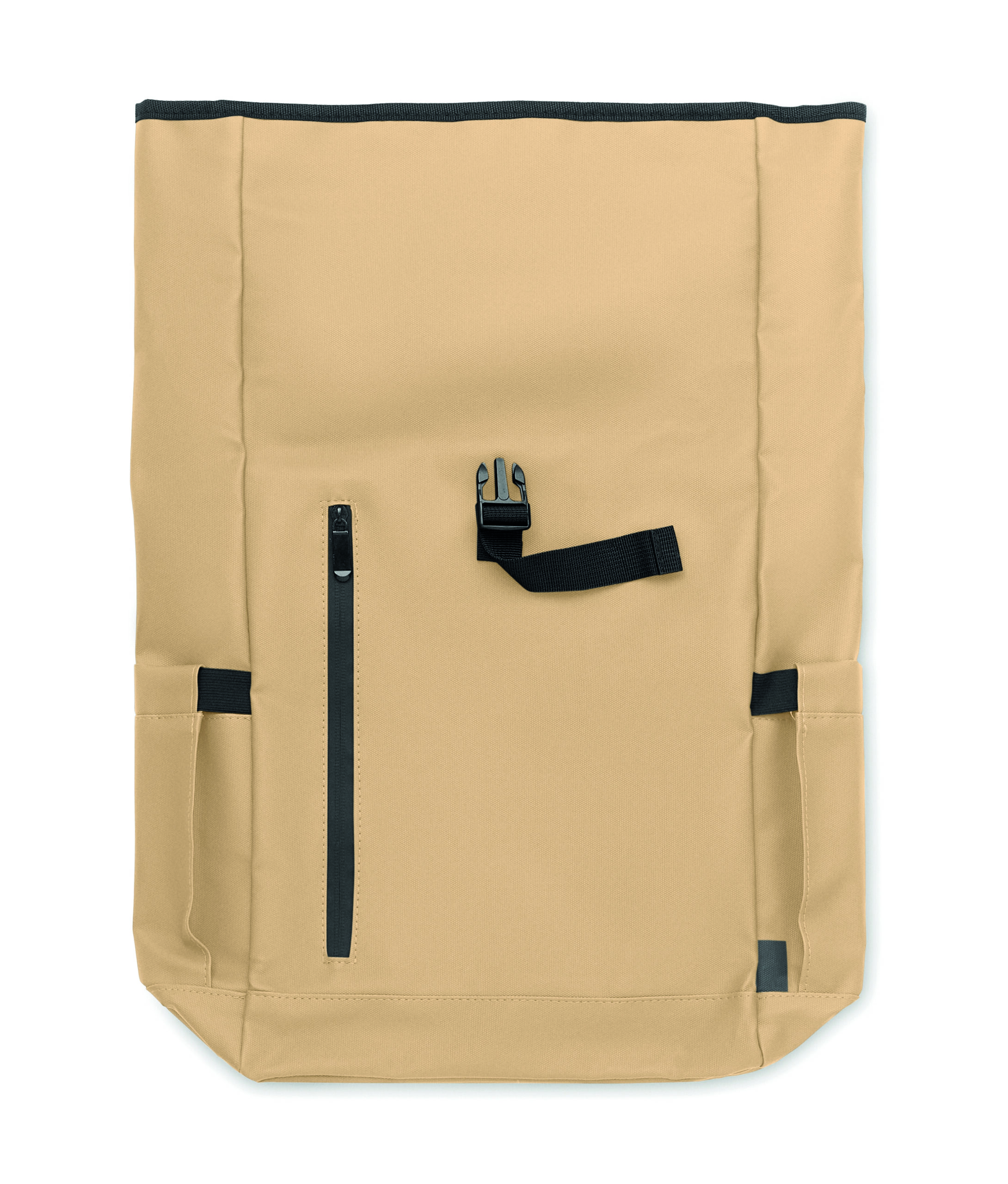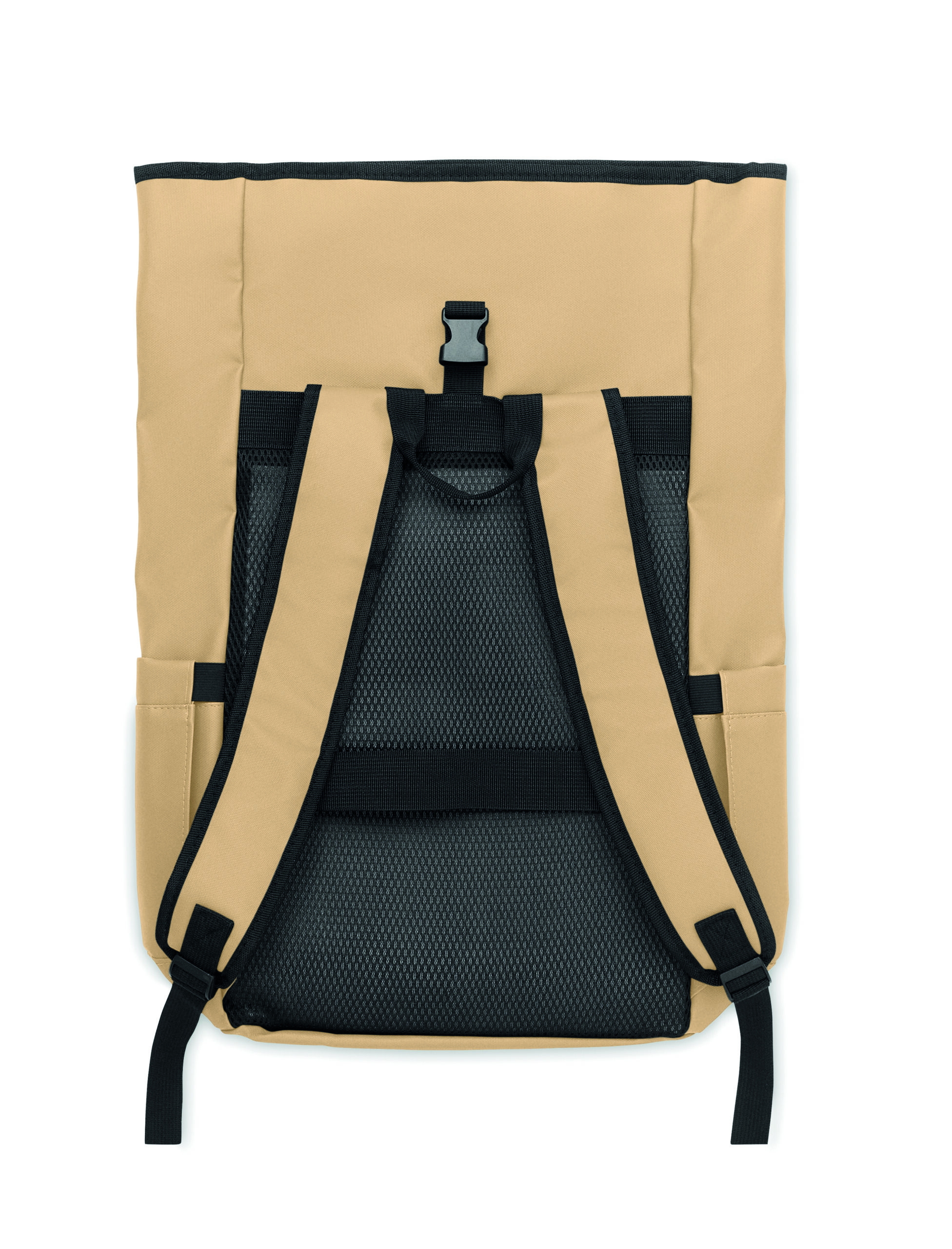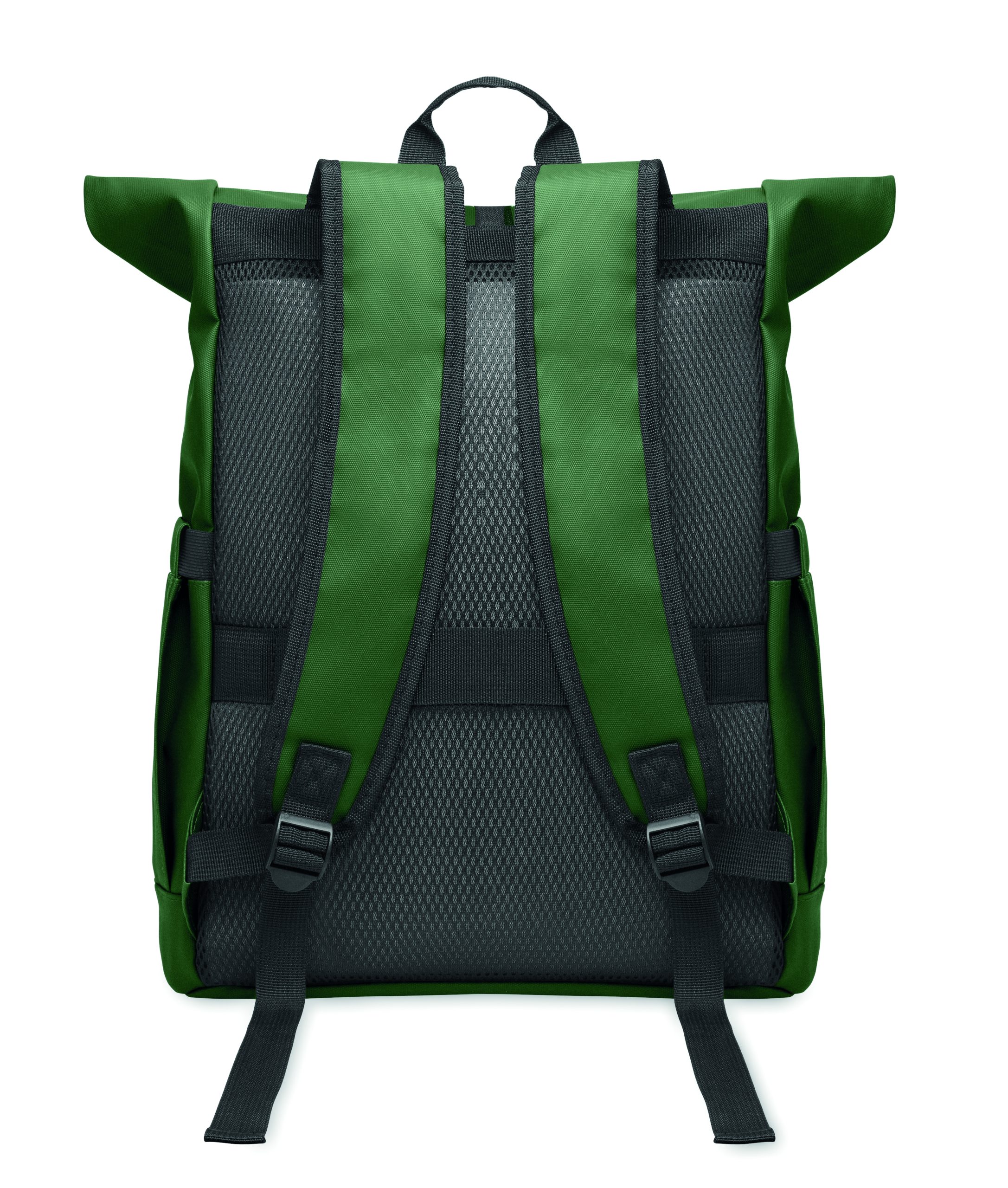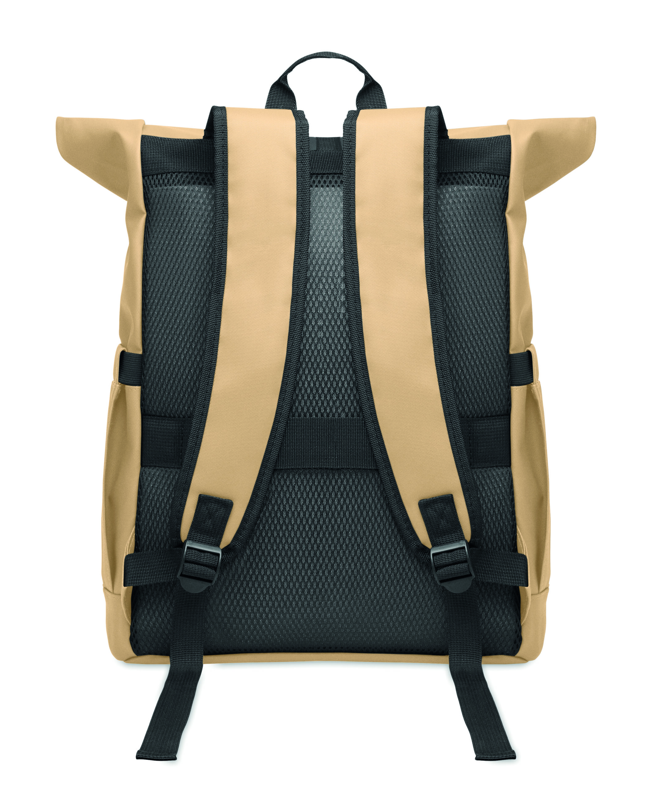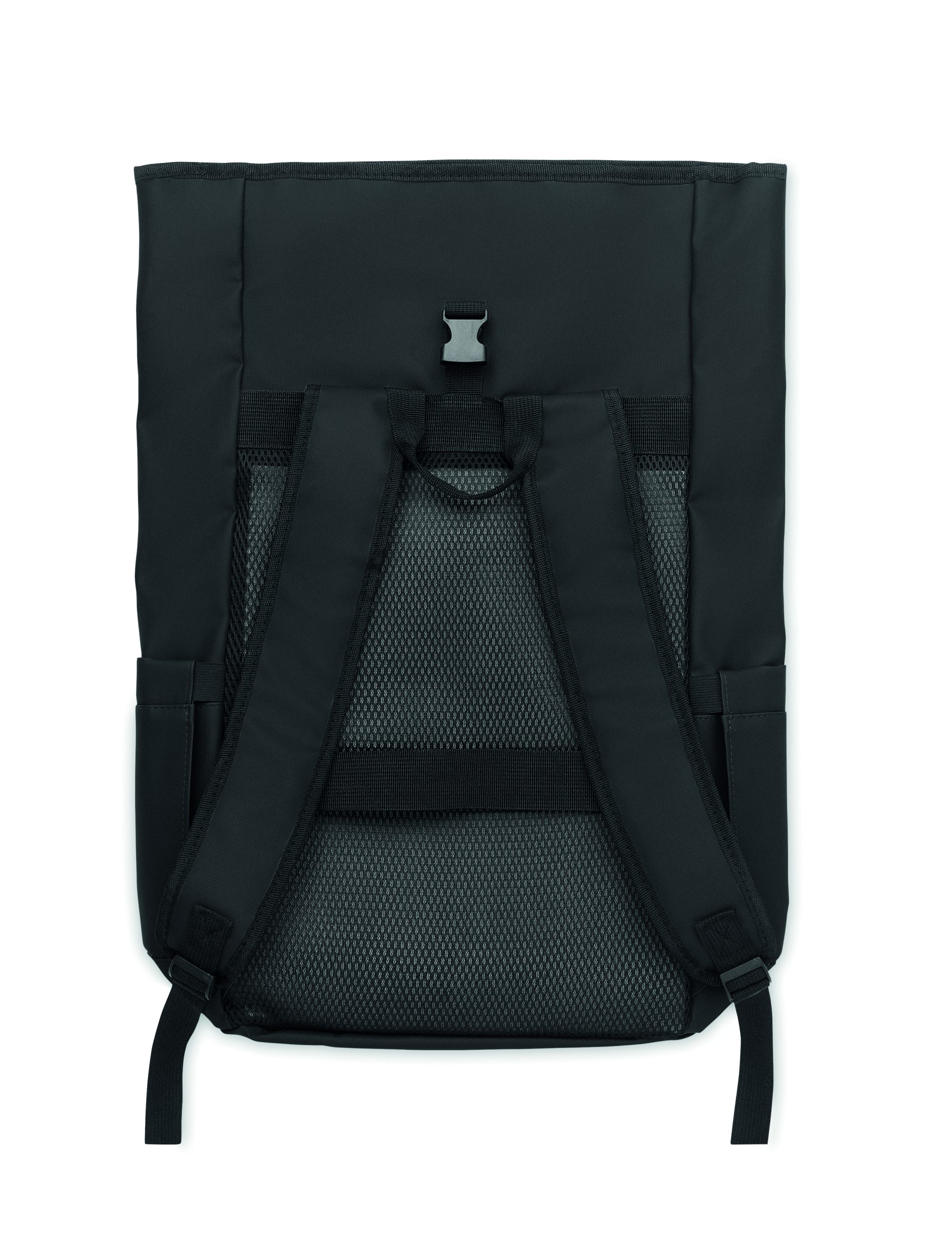 Plecak na laptop typu rolltop z powlekanego PU poliestru 600D RPET i podszewką z poliestru RPET. Wyściełane plecy z kieszenią na zamek i paskiem na walizkę. Wyściełany pasek na ramię z wewnętrznym wykończeniem z siatki.