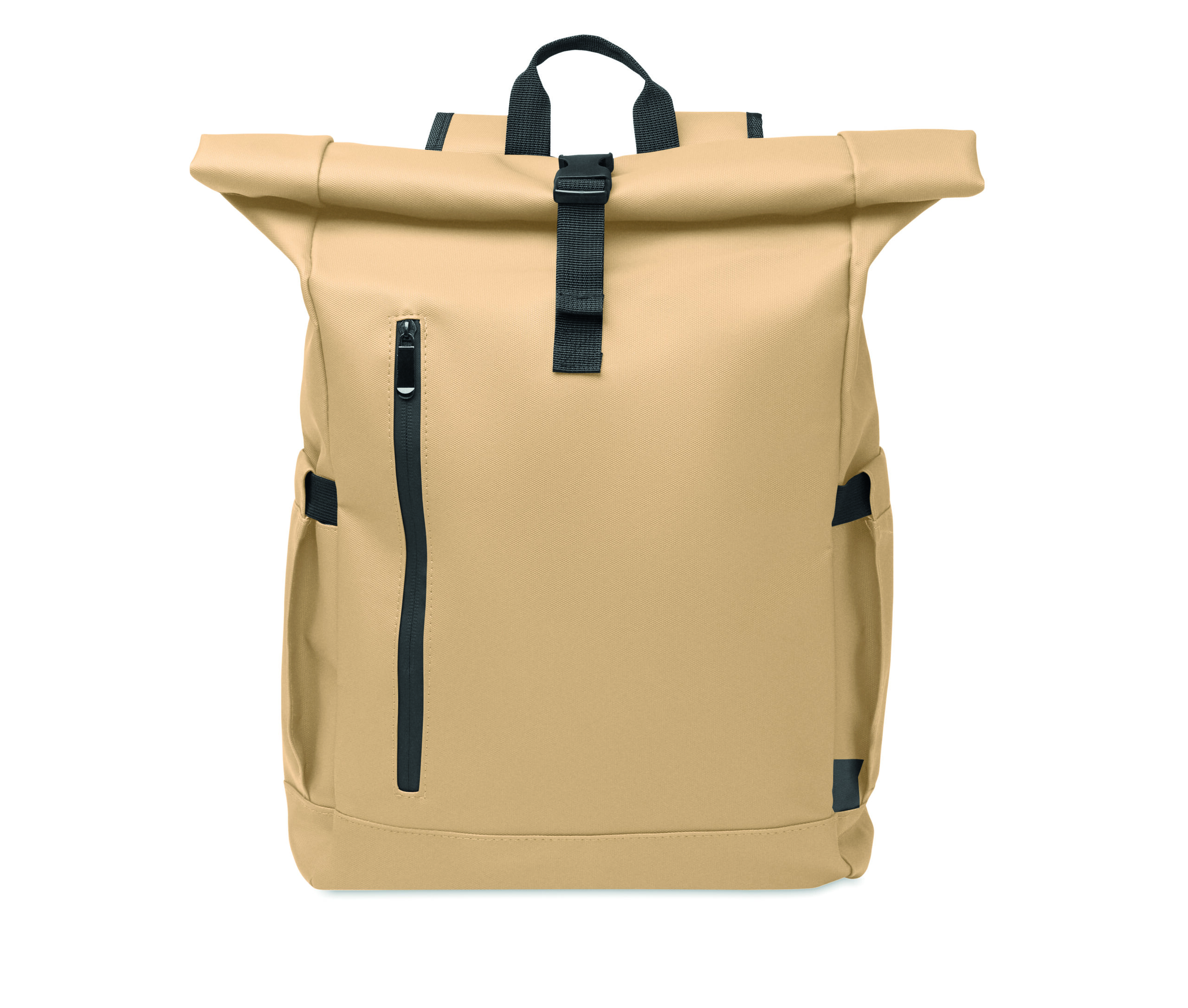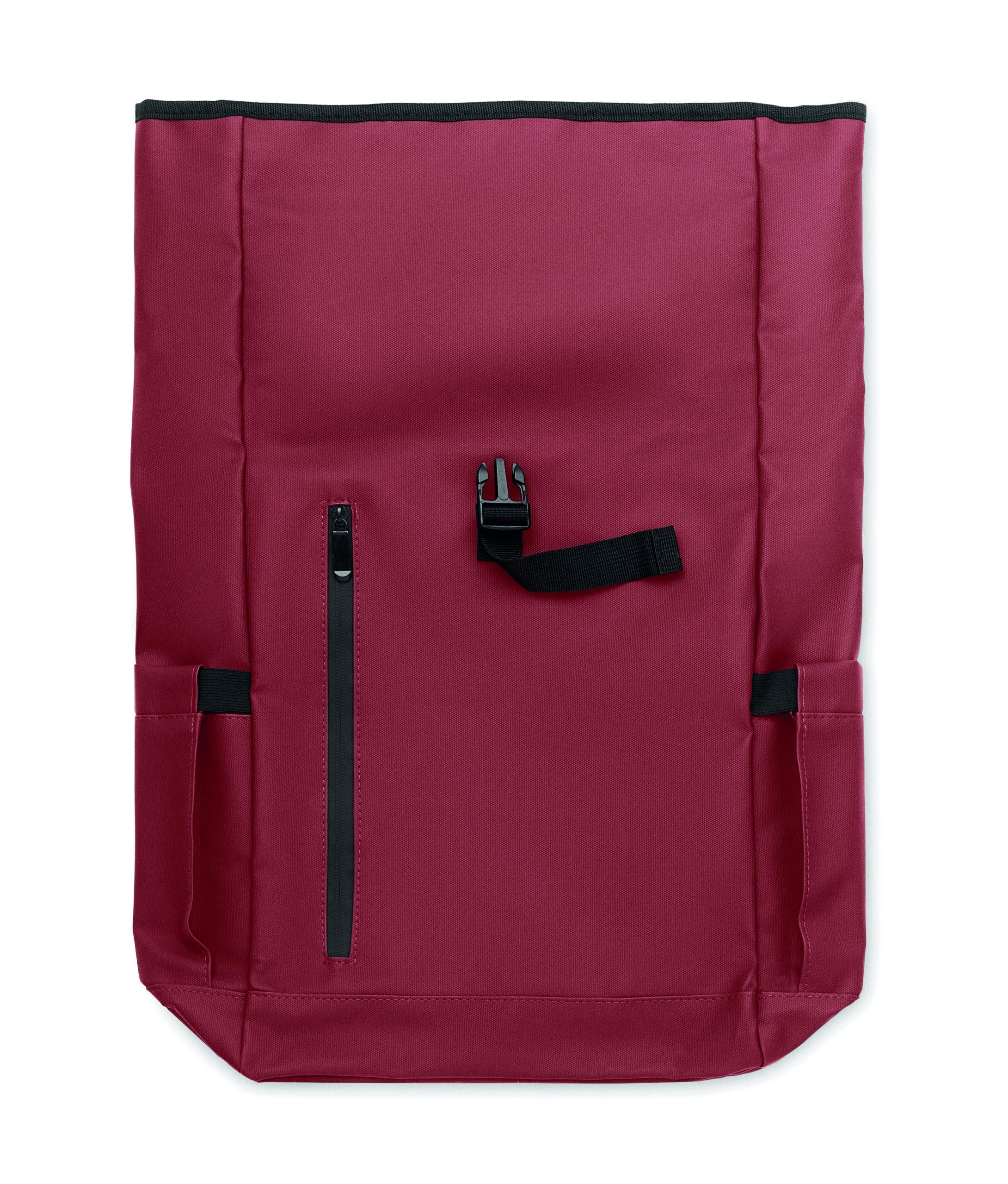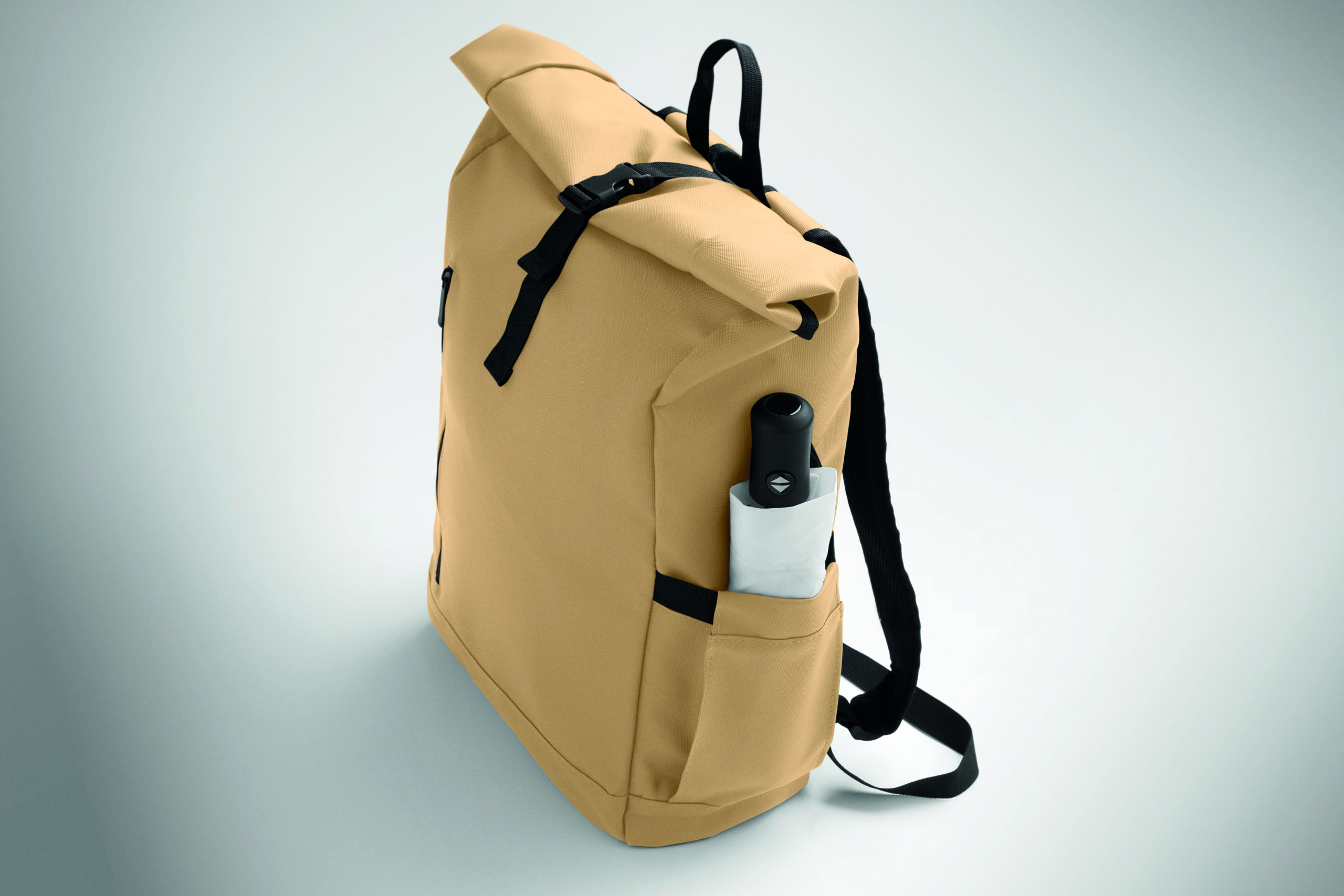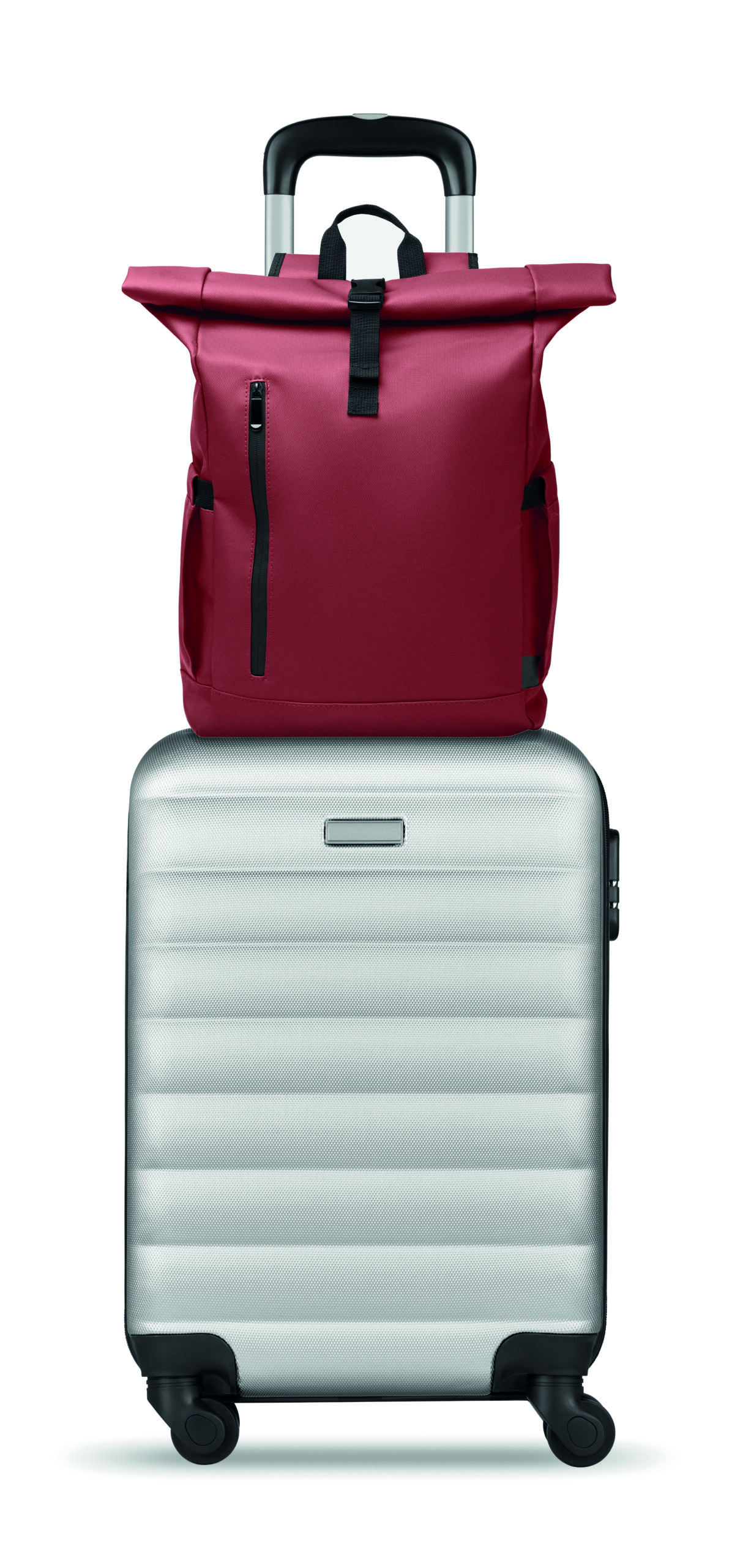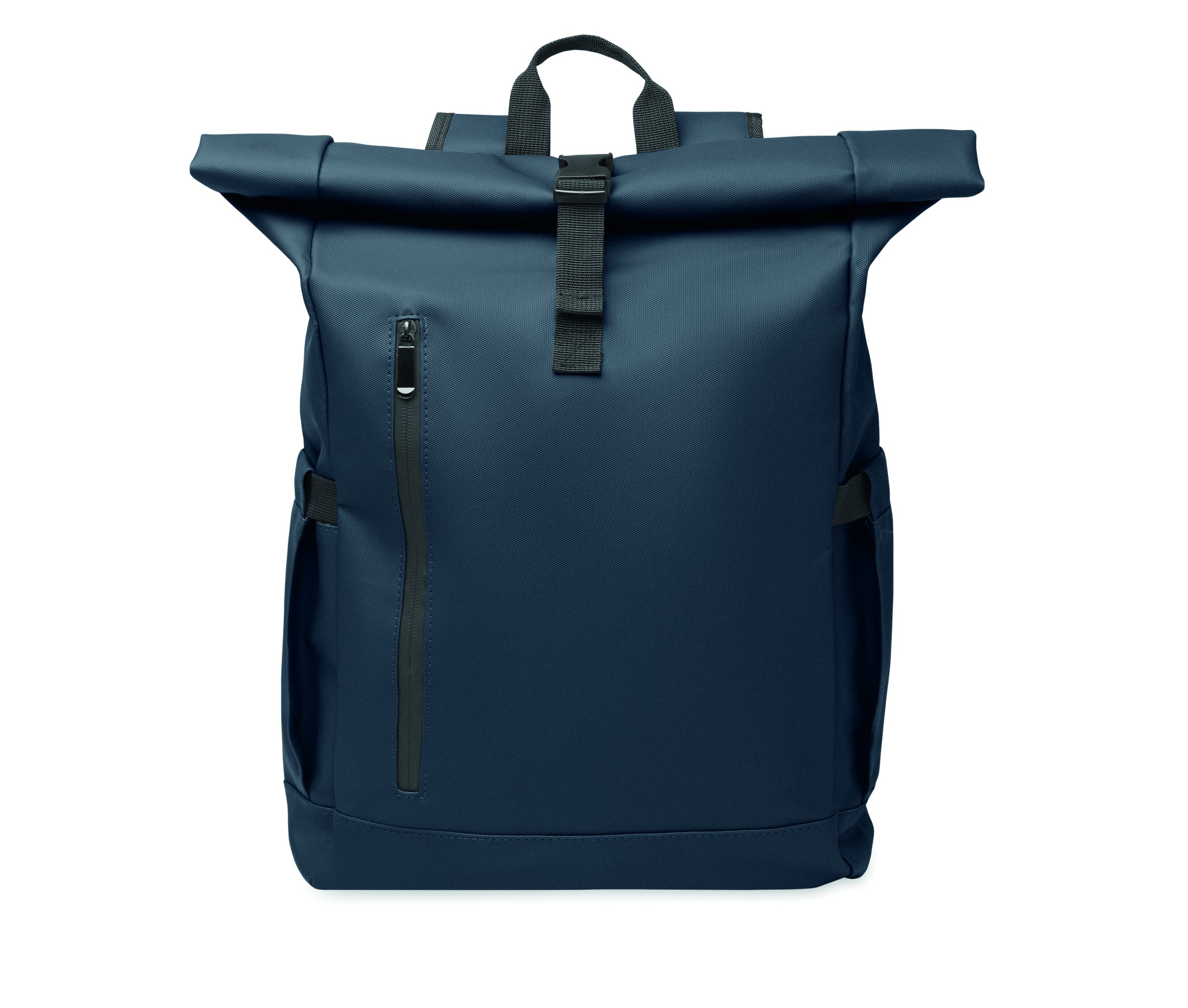 Plecak na laptop typu rolltop z powlekanego PU poliestru 600D RPET i podszewką z poliestru RPET. Wyściełane plecy z kieszenią na zamek i paskiem na walizkę. Wyściełany pasek na ramię z wewnętrznym wykończeniem z siatki.