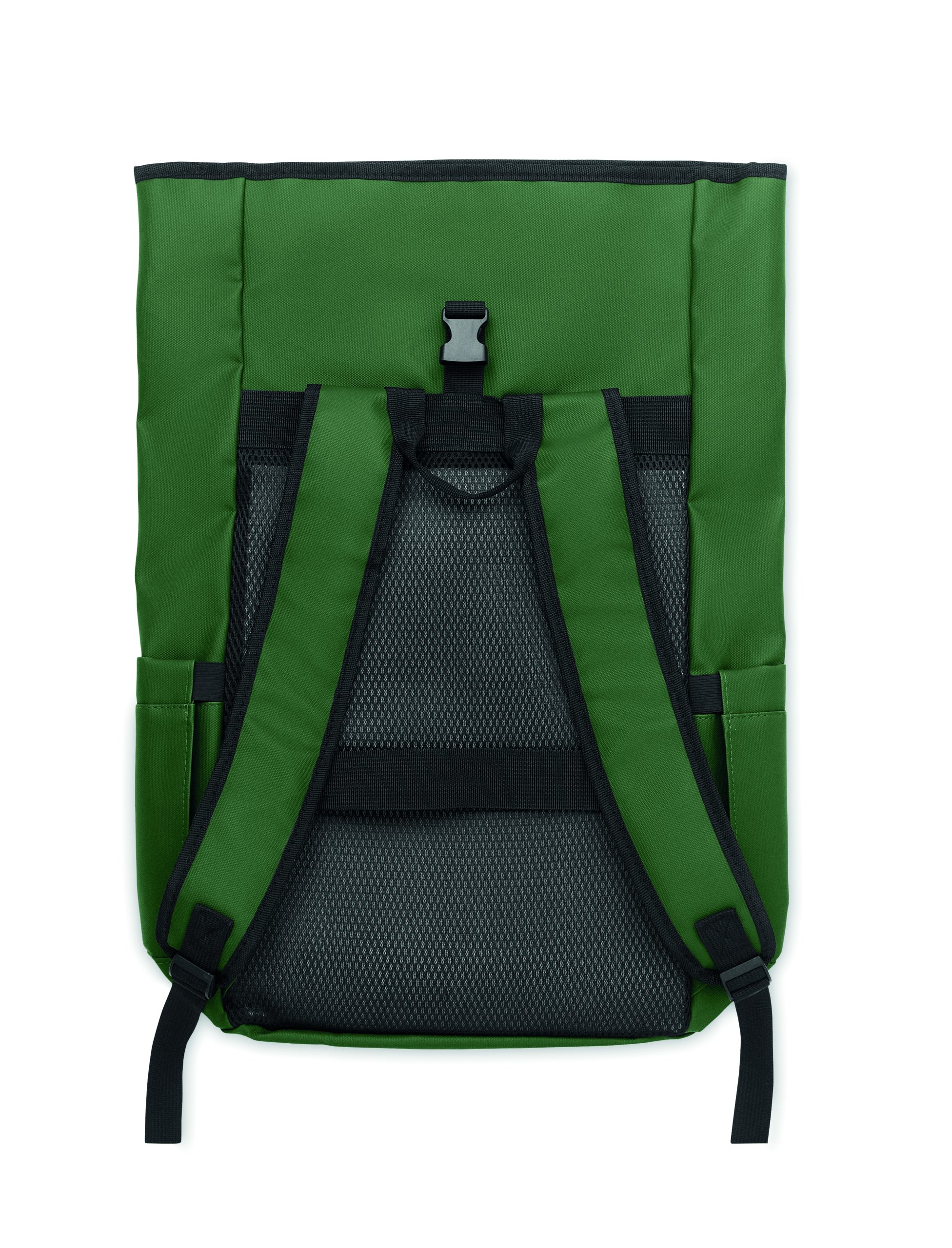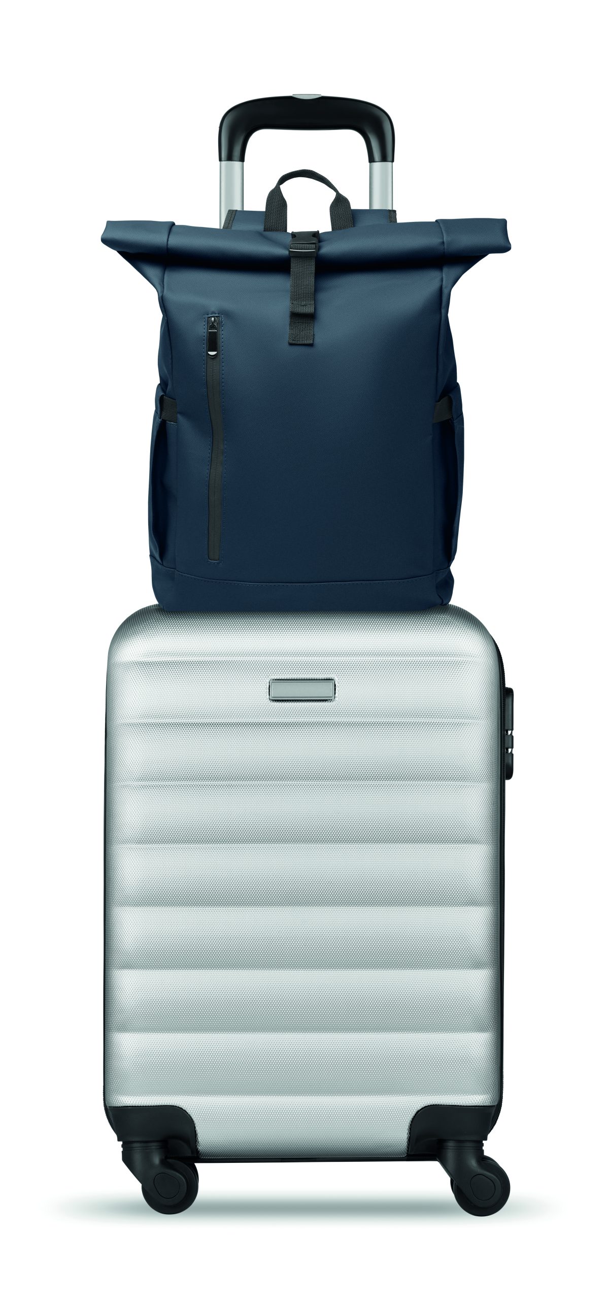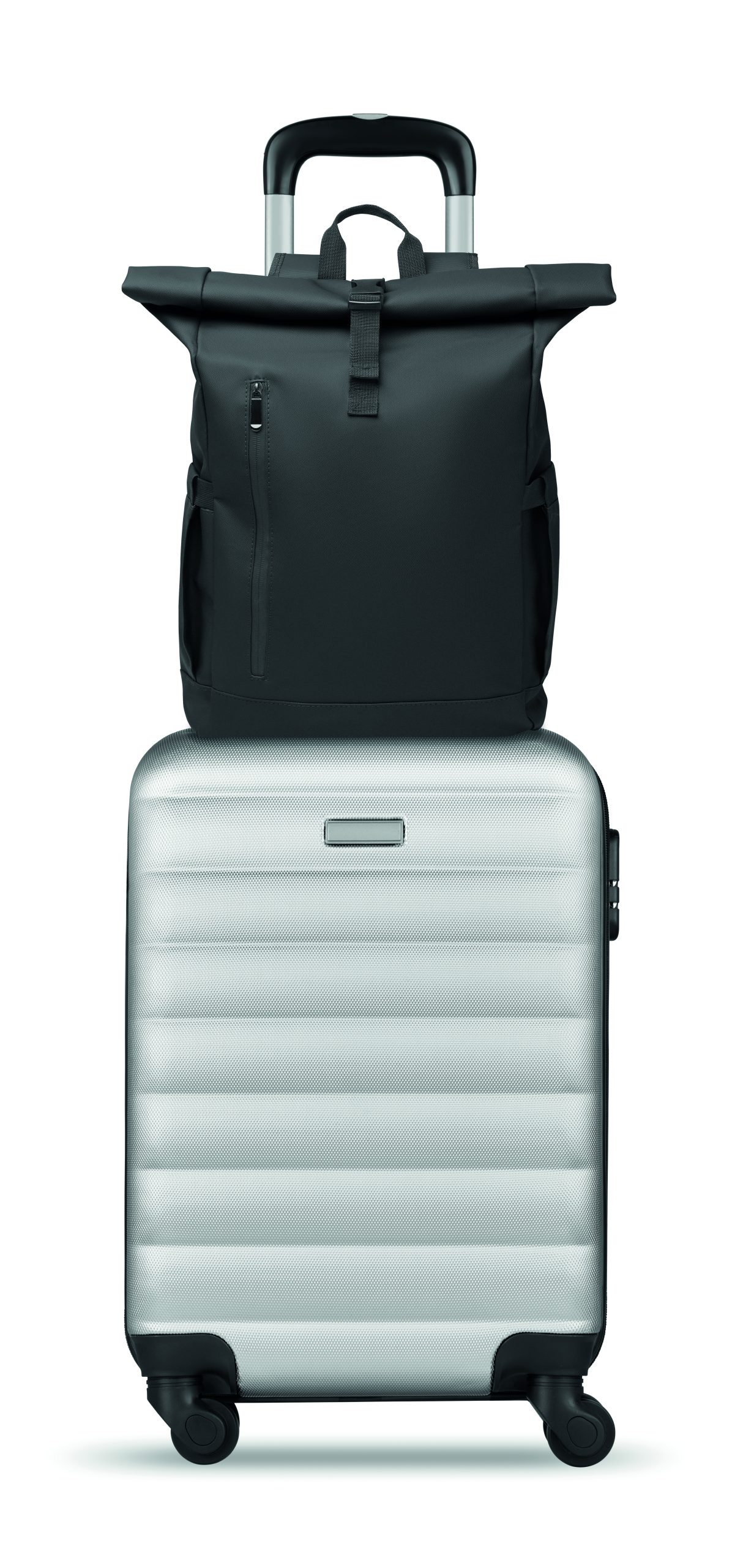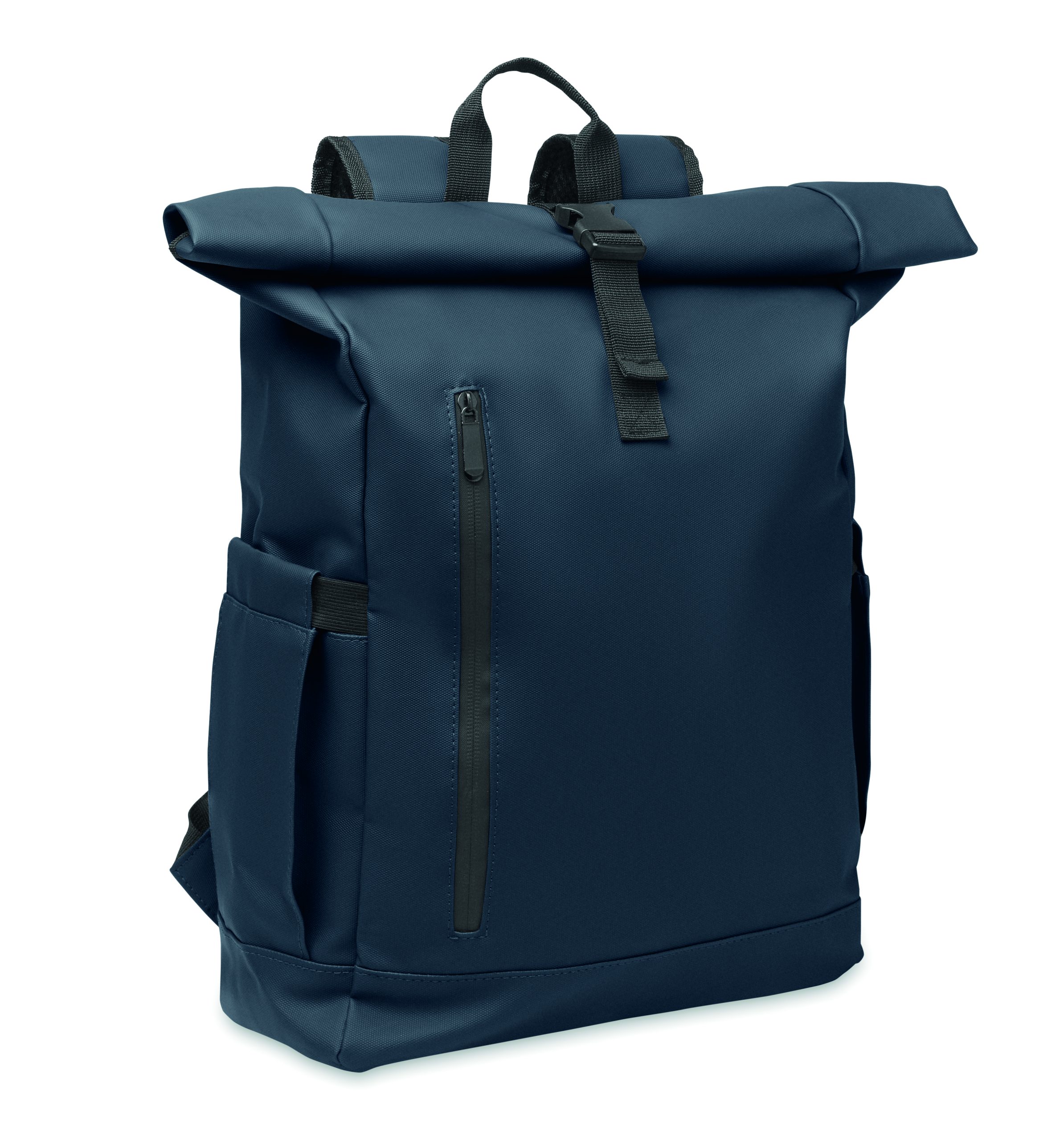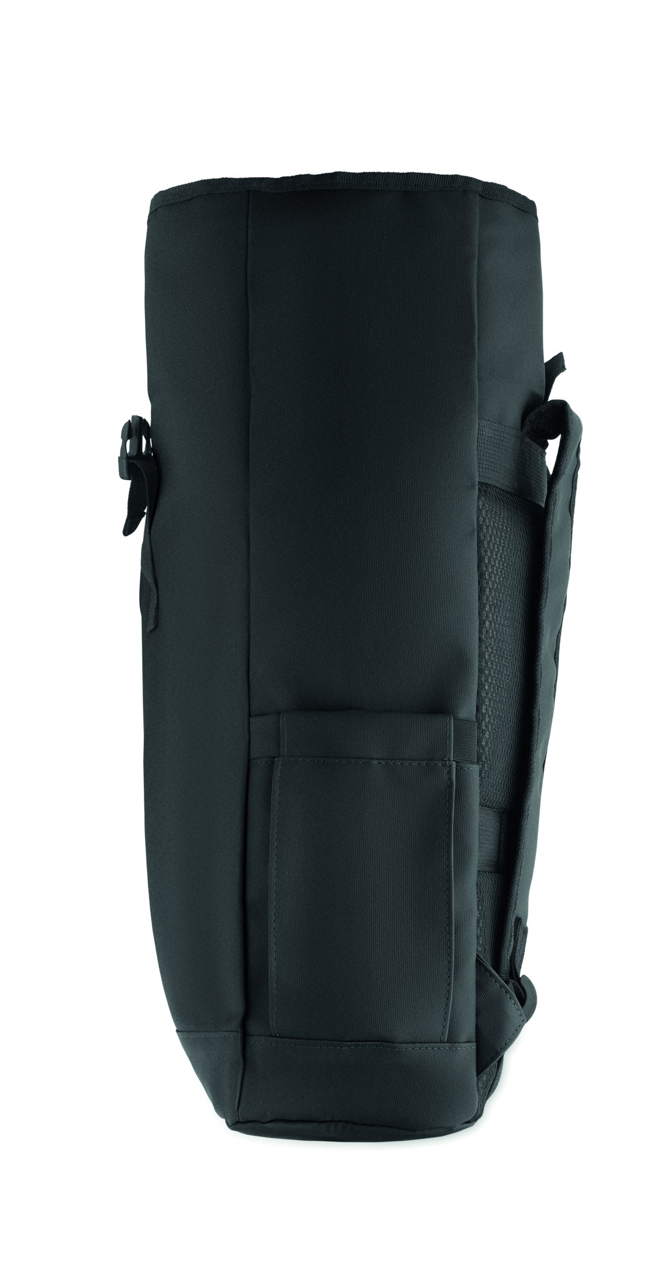Plecak na laptop typu rolltop z powlekanego PU poliestru 600D RPET i podszewką z poliestru RPET. Wyściełane plecy z kieszenią na zamek i paskiem na walizkę. Wyściełany pasek na ramię z wewnętrznym wykończeniem z siatki.