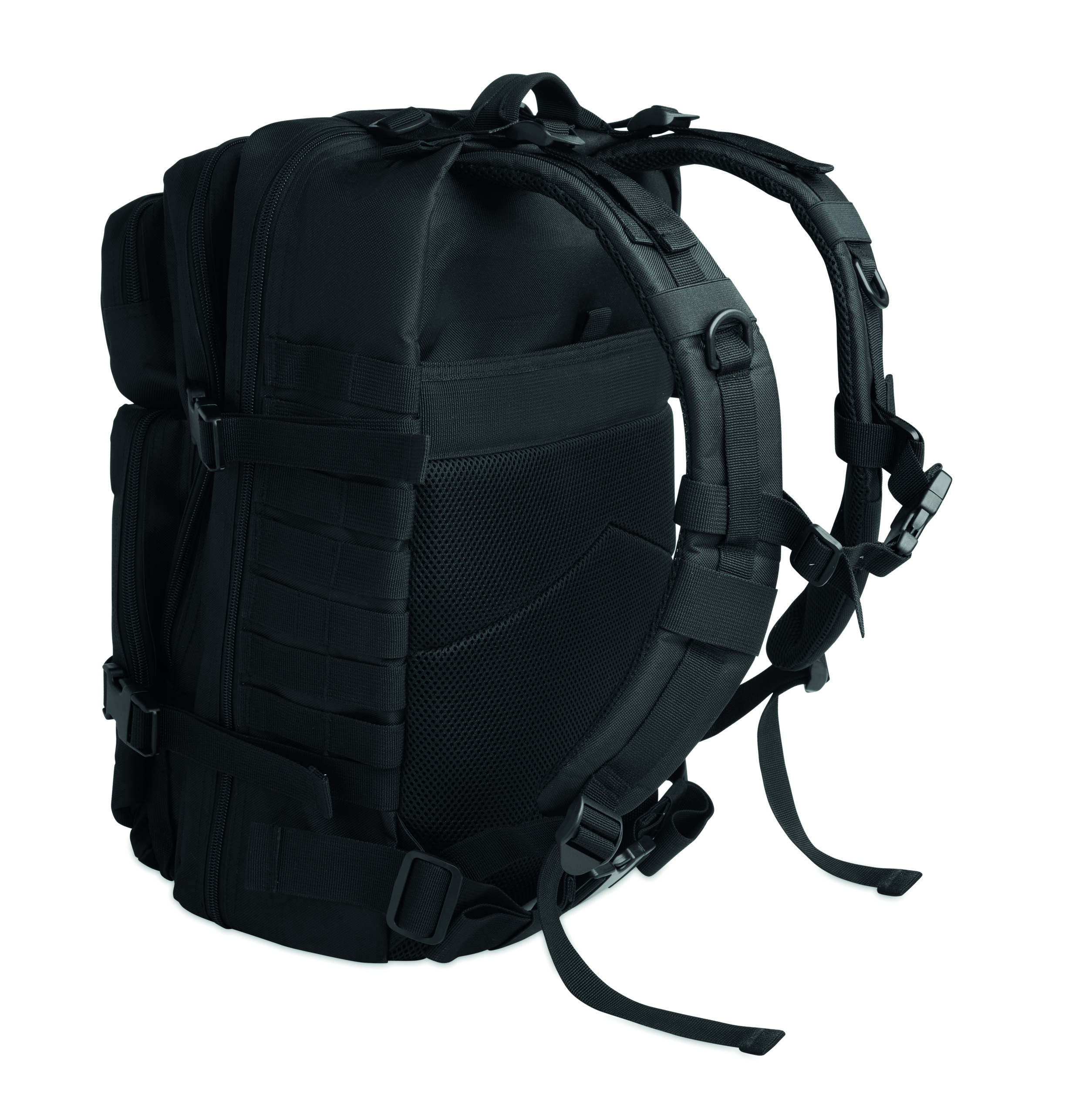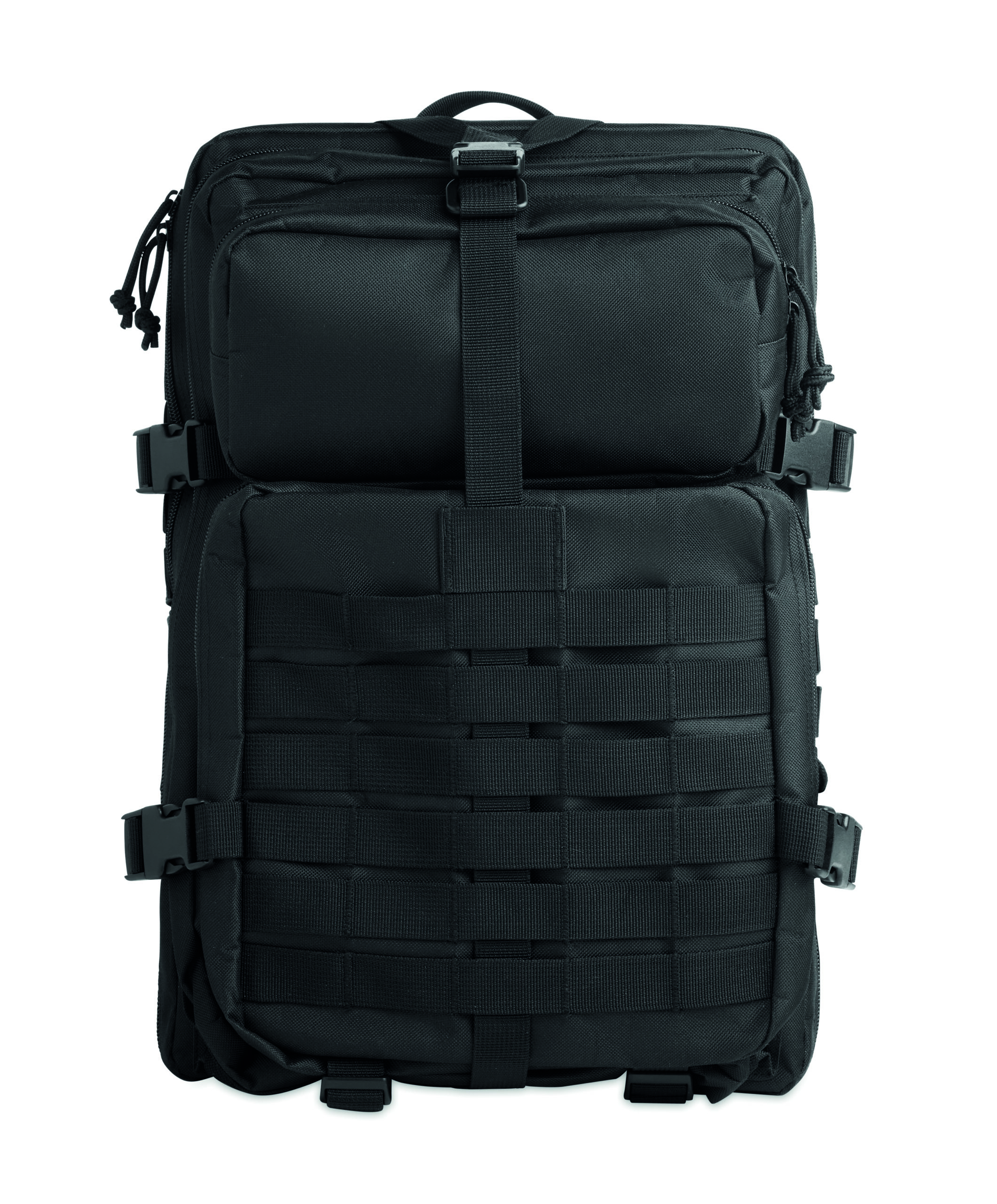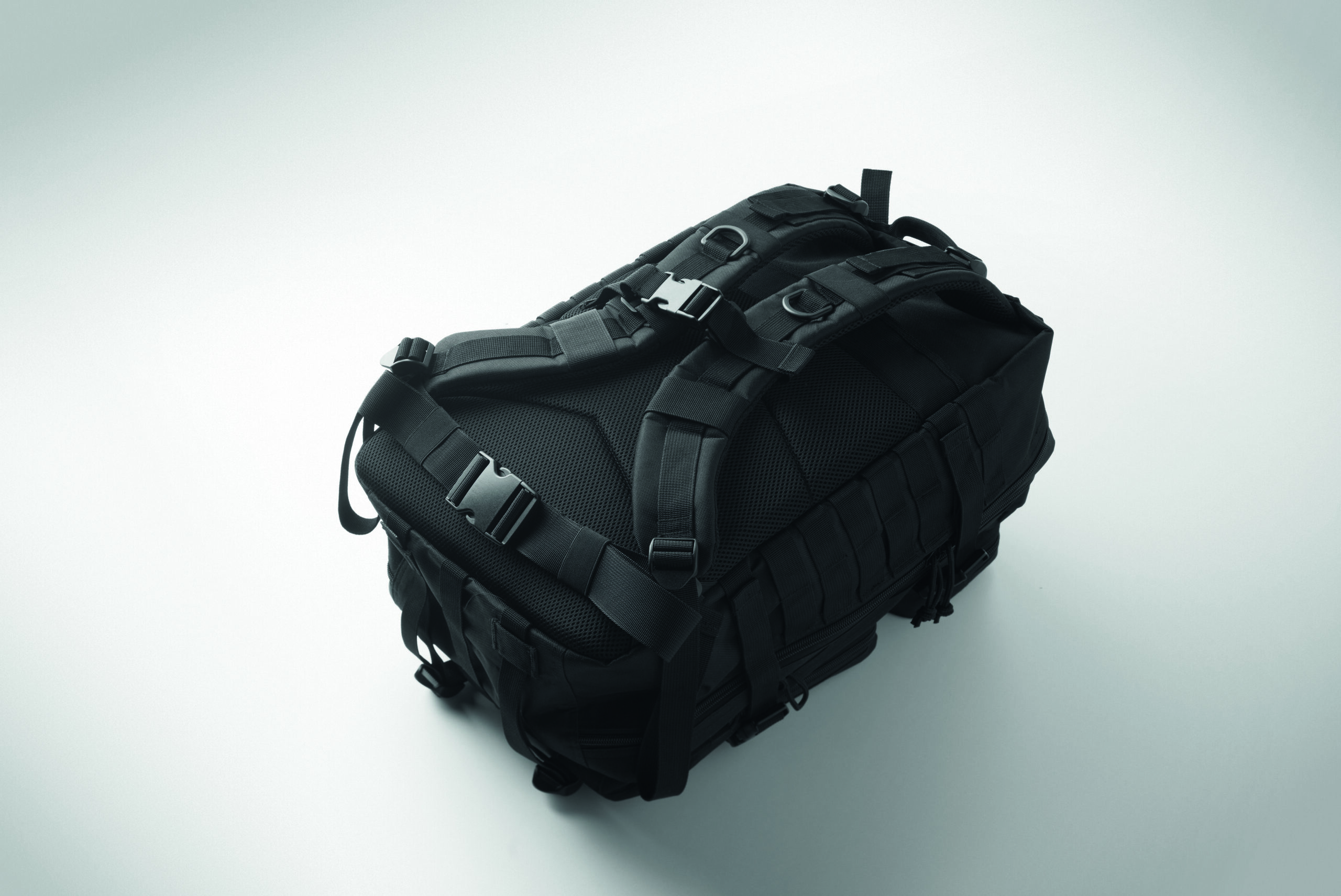 Plecak 50 l z 600D RPET z wyściełaną przegrodą na laptopa i przegrodami wewnętrznymi, przednimi kieszeniami na zamek, wyściełanymi siatką paskami i plecami, pasem biodrowym i elastycznymi wspornikami.