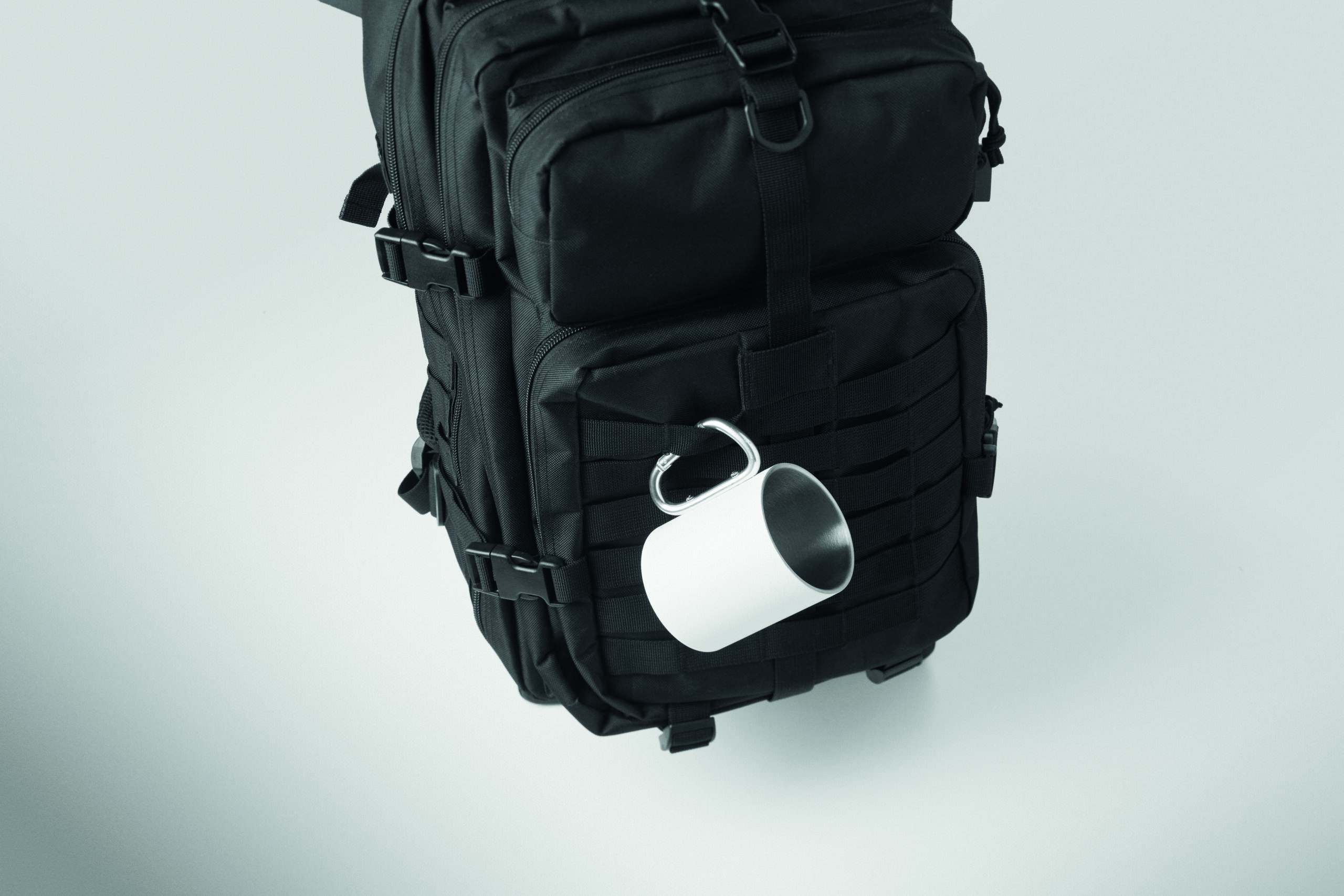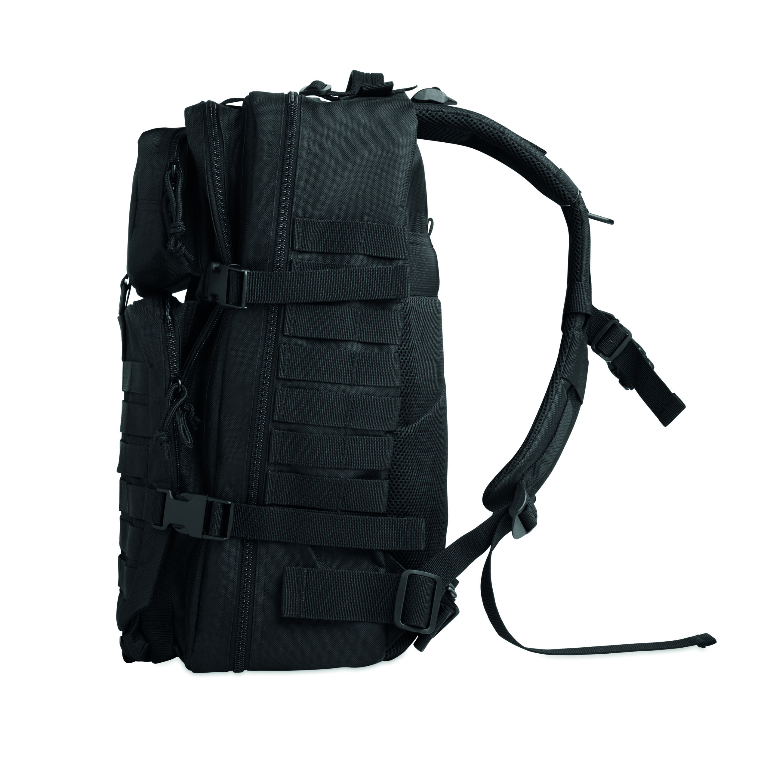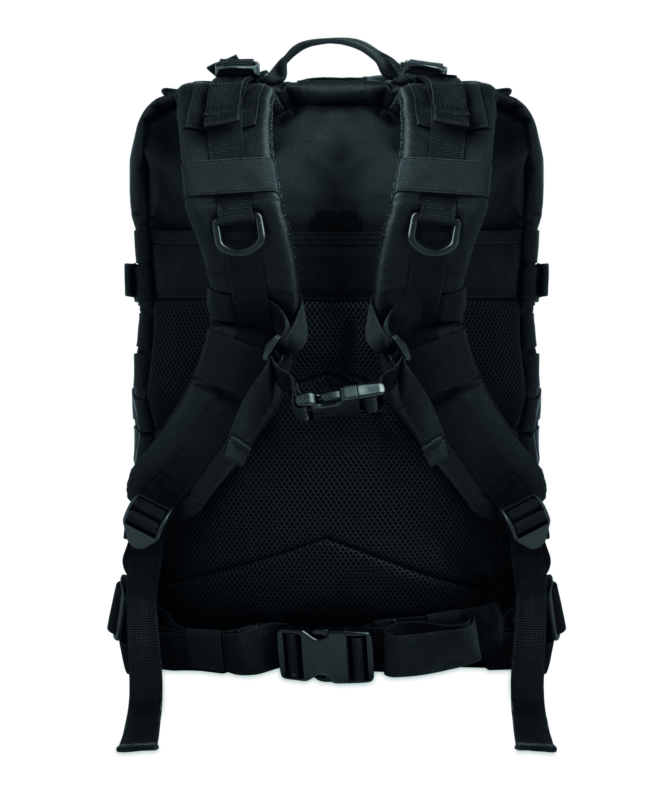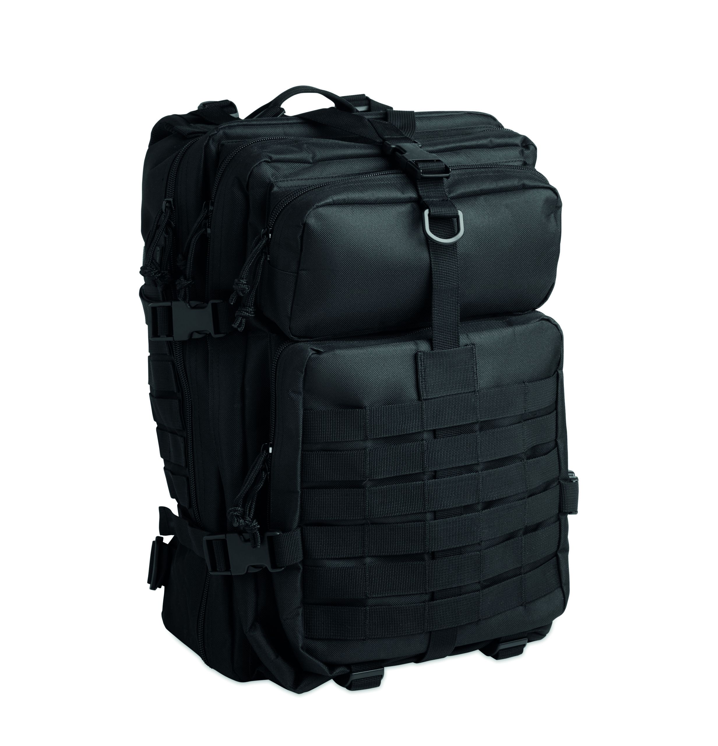 Plecak 50 l z 600D RPET z wyściełaną przegrodą na laptopa i przegrodami wewnętrznymi, przednimi kieszeniami na zamek, wyściełanymi siatką paskami i plecami, pasem biodrowym i elastycznymi wspornikami.