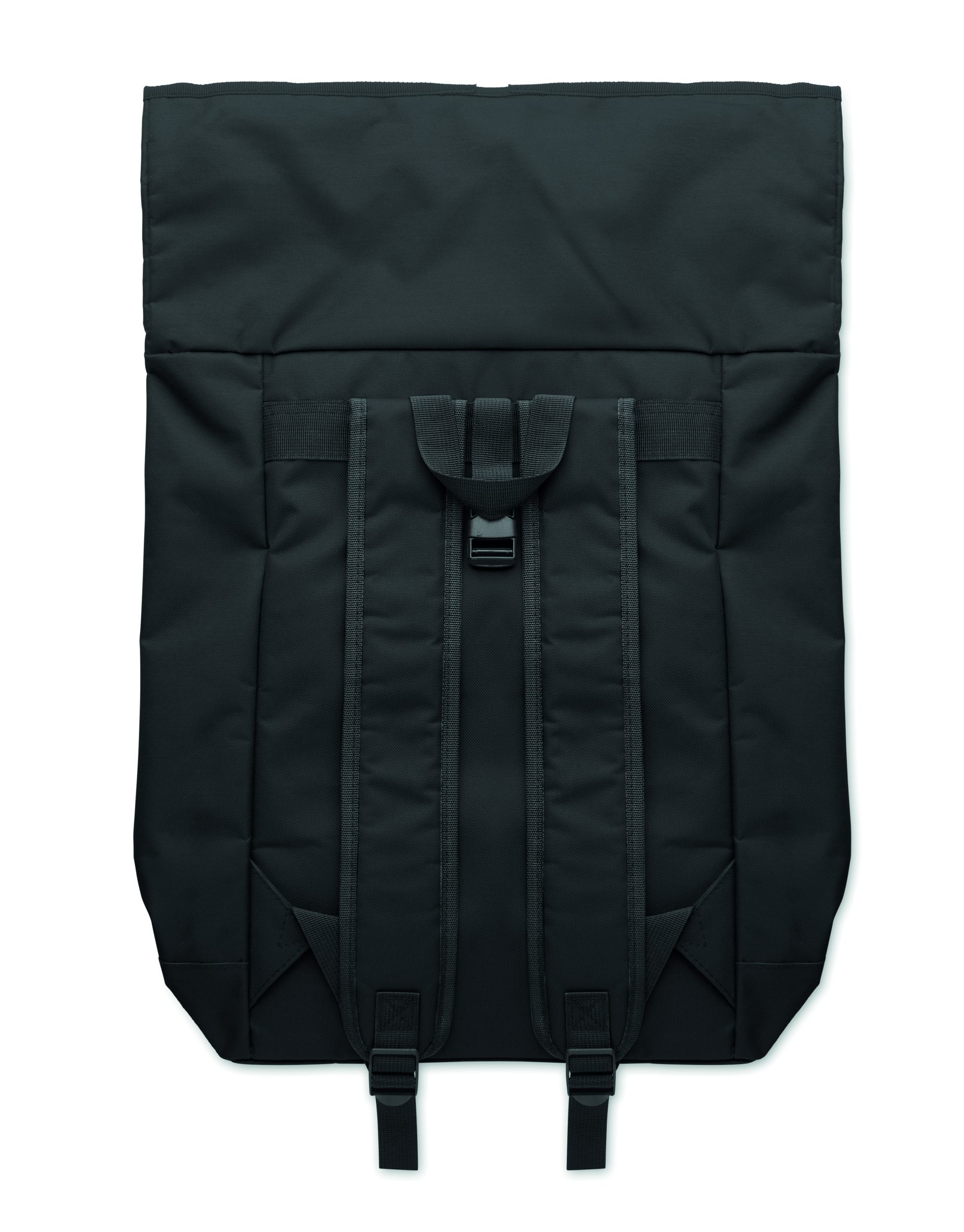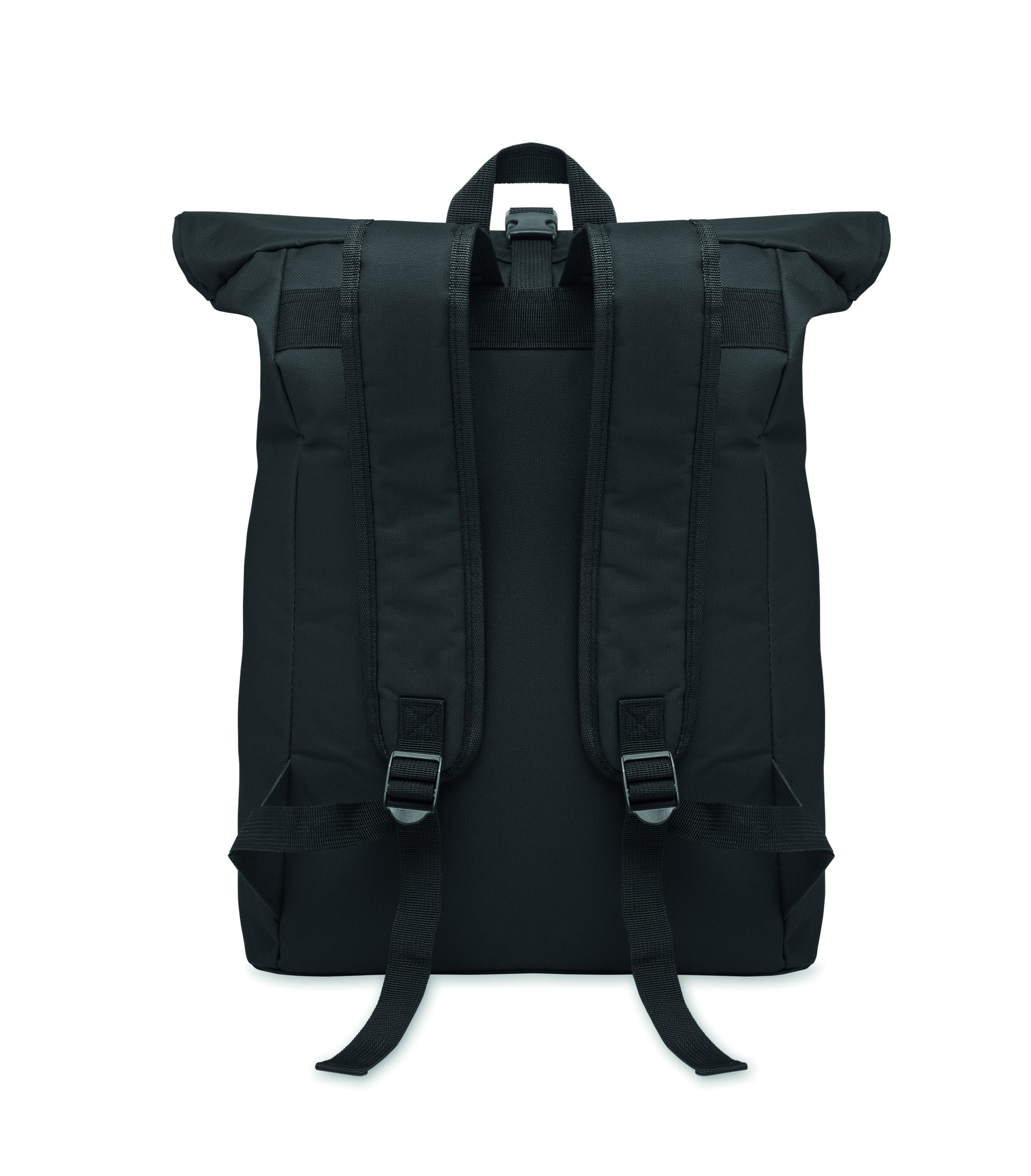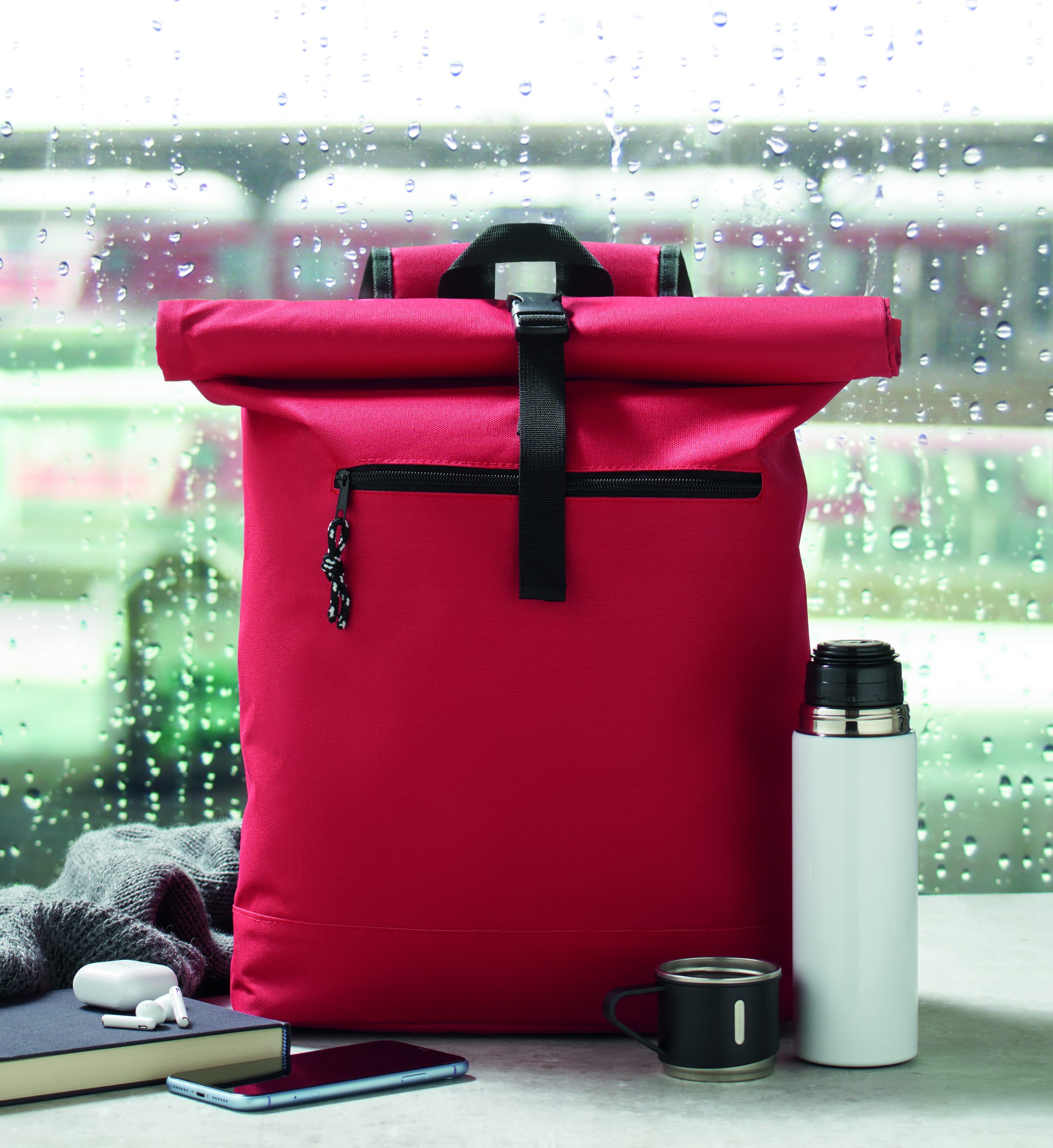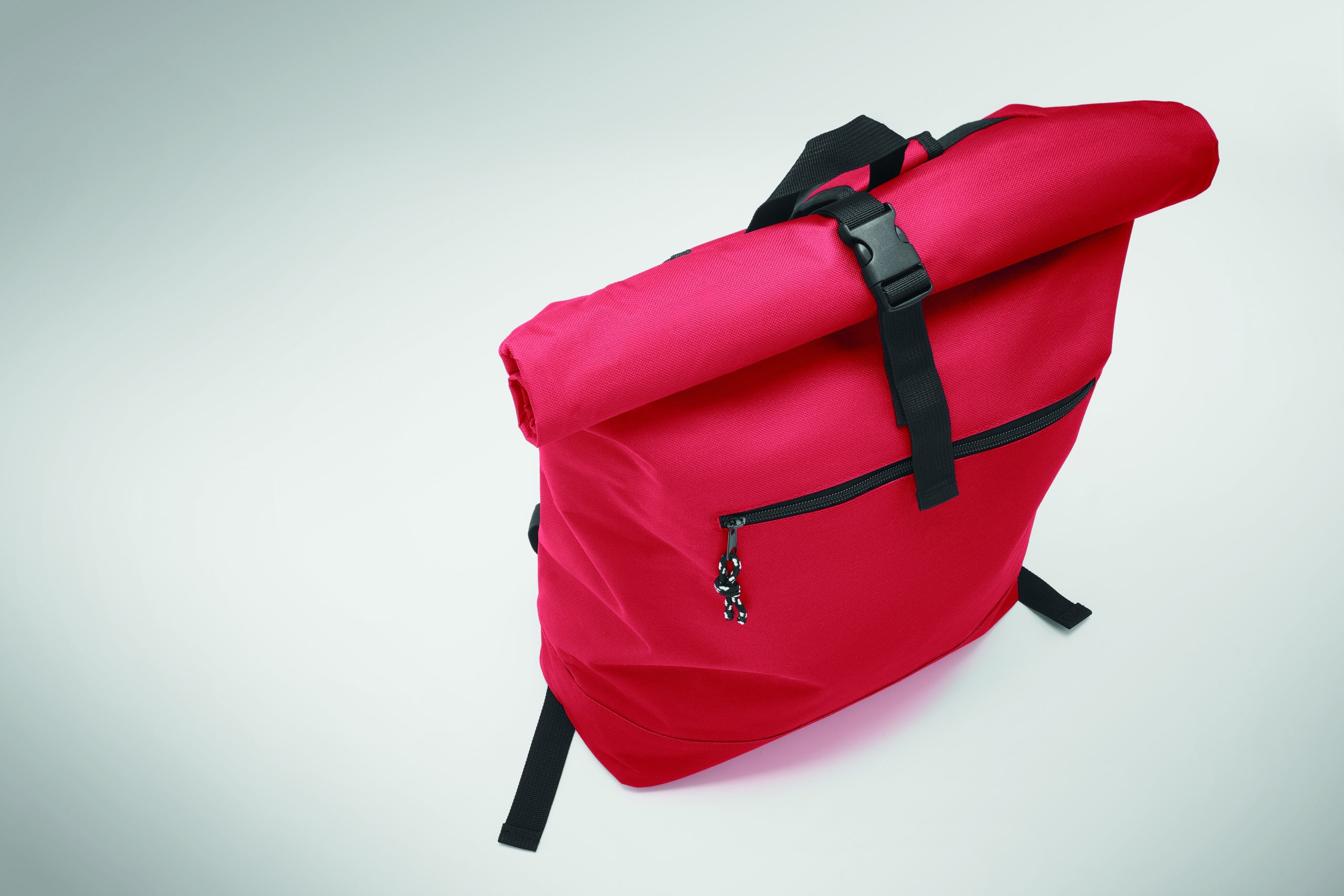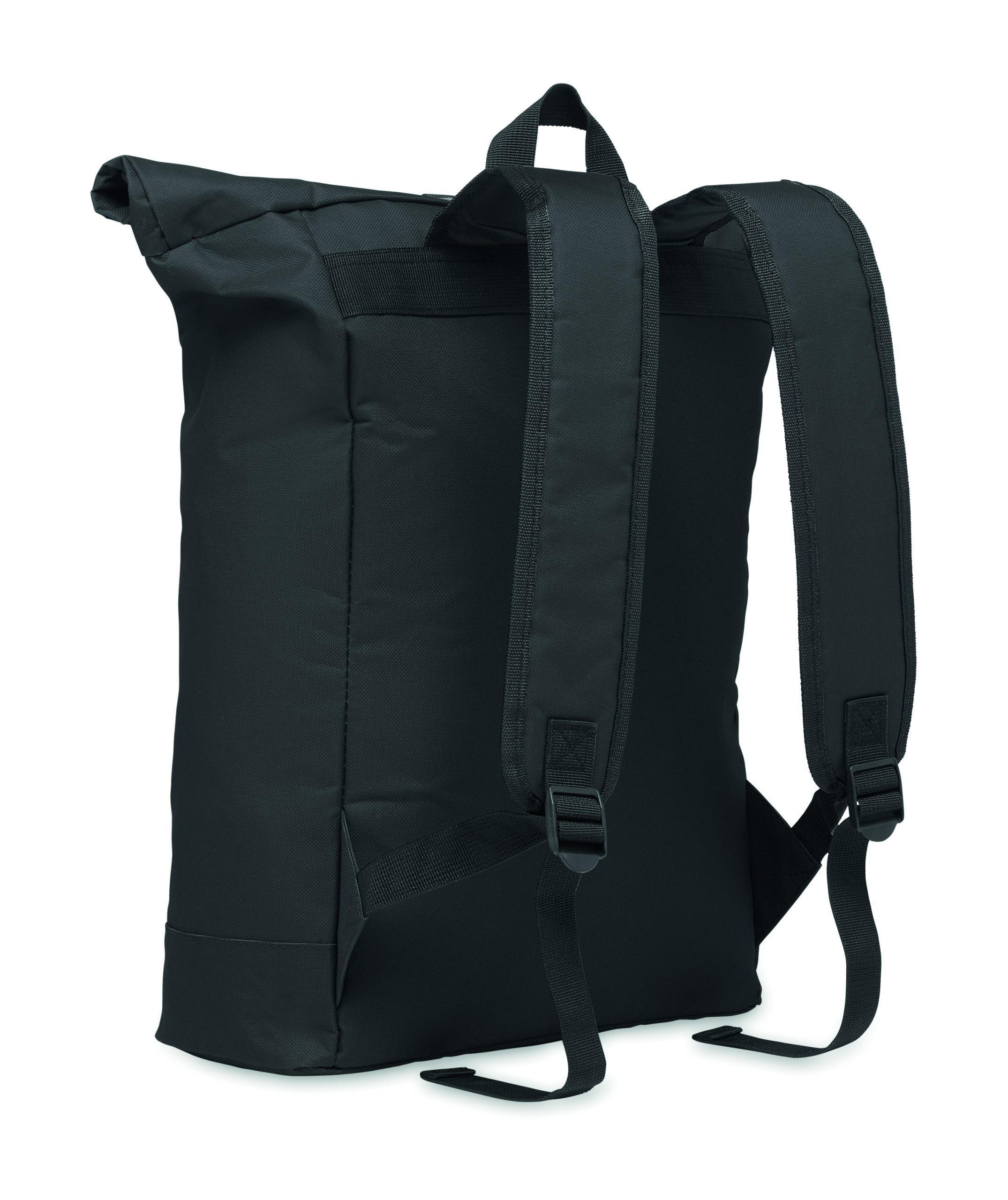 15-calowy zwijany plecak na laptopa typu rolltop z poliestru 600D z wyściełanym tyłem i wzmocnionym spodem. Przednia kieszeń zapinana na zamek. Podszewka 210D.