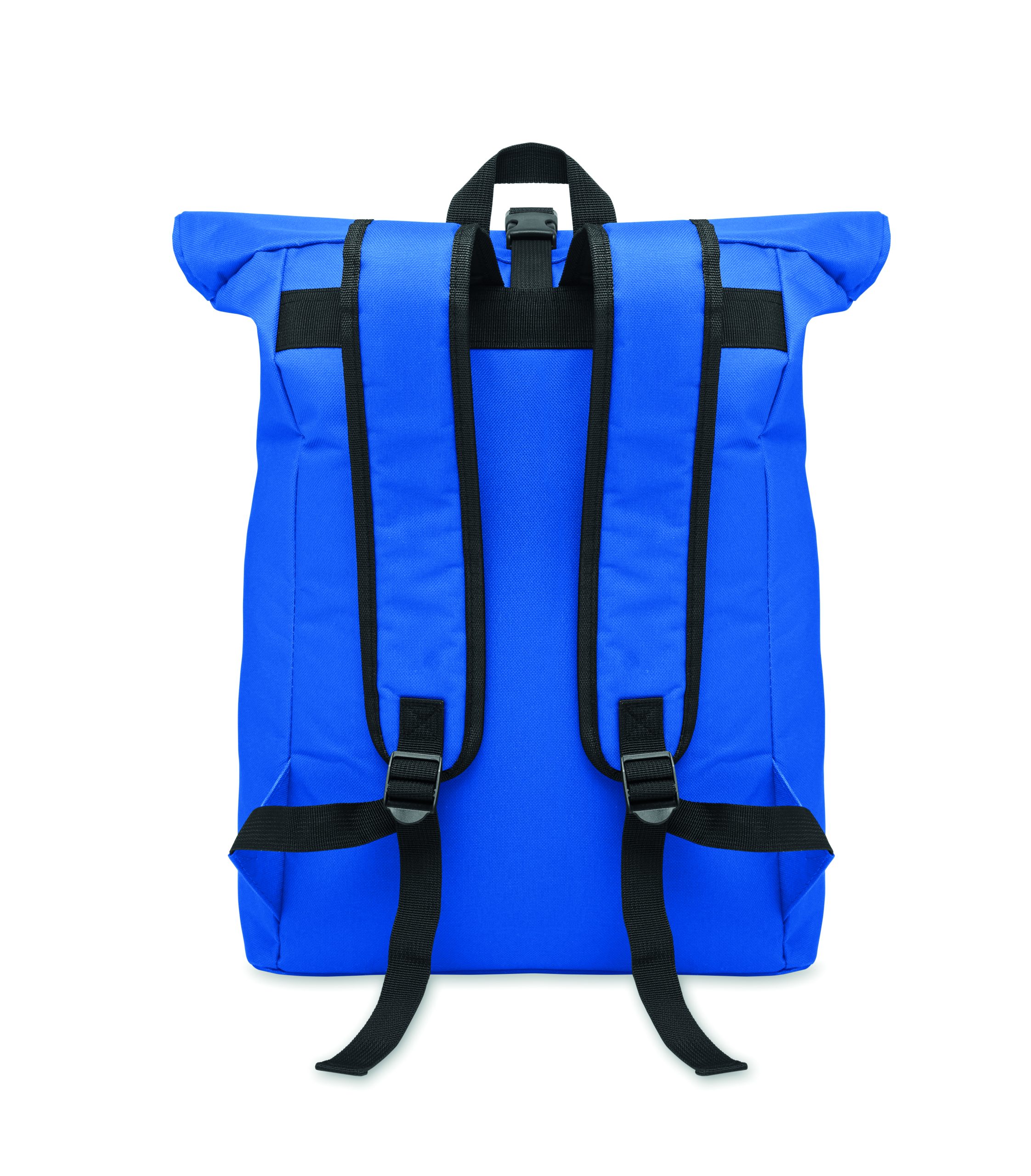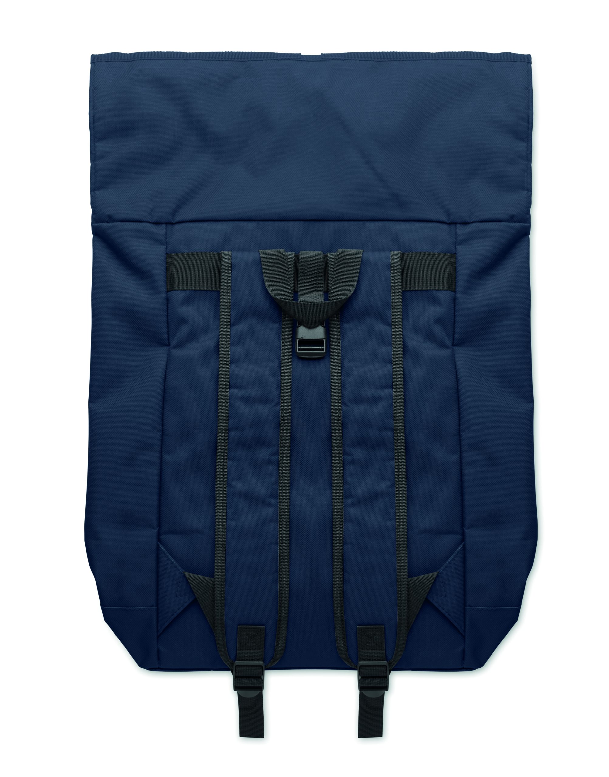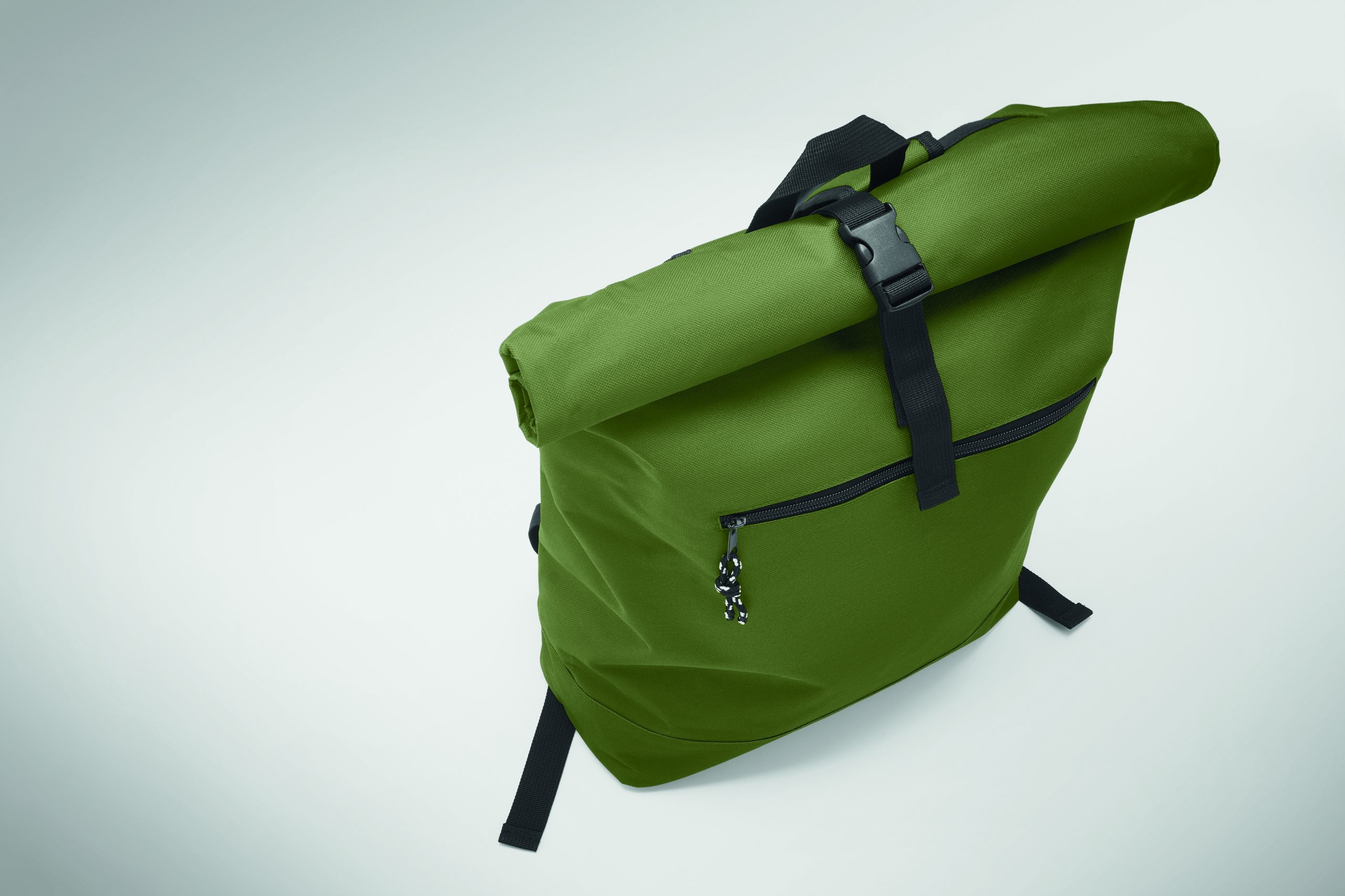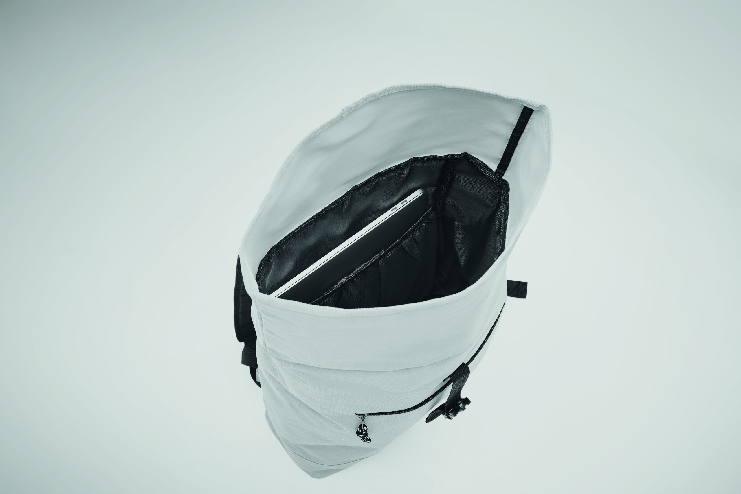 15-calowy zwijany plecak na laptopa typu rolltop z poliestru 600D z wyściełanym tyłem i wzmocnionym spodem. Przednia kieszeń zapinana na zamek. Podszewka 210D.