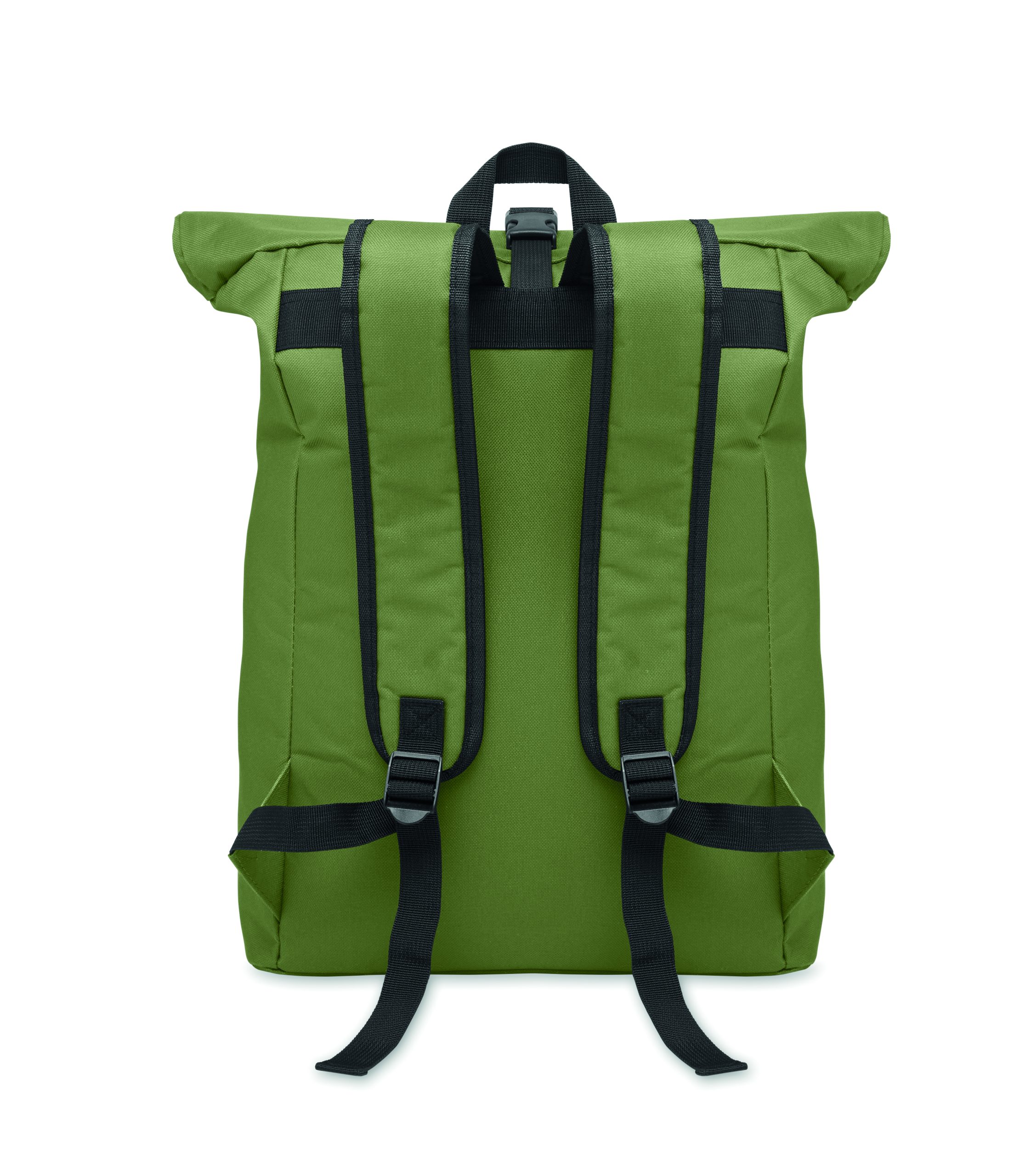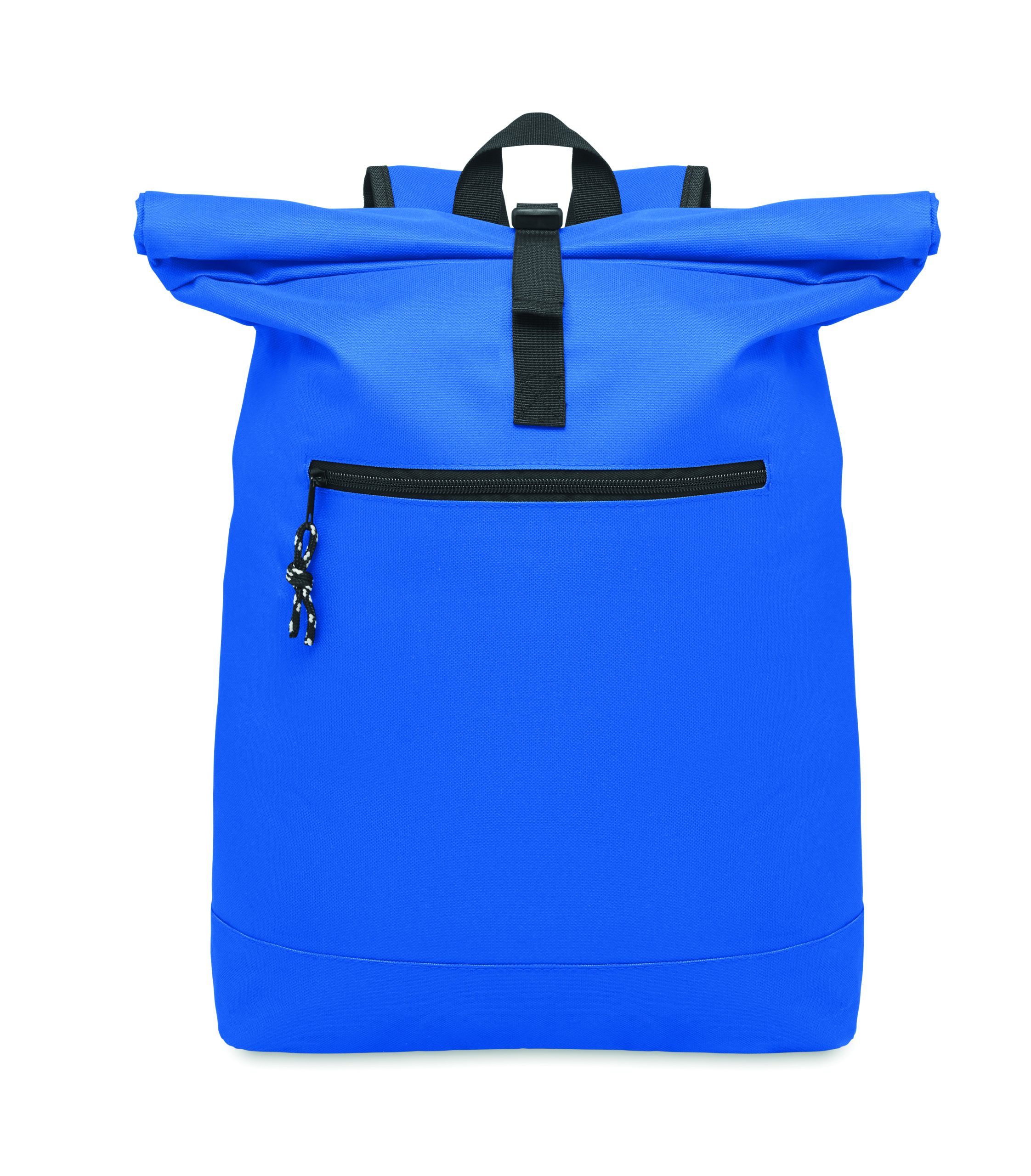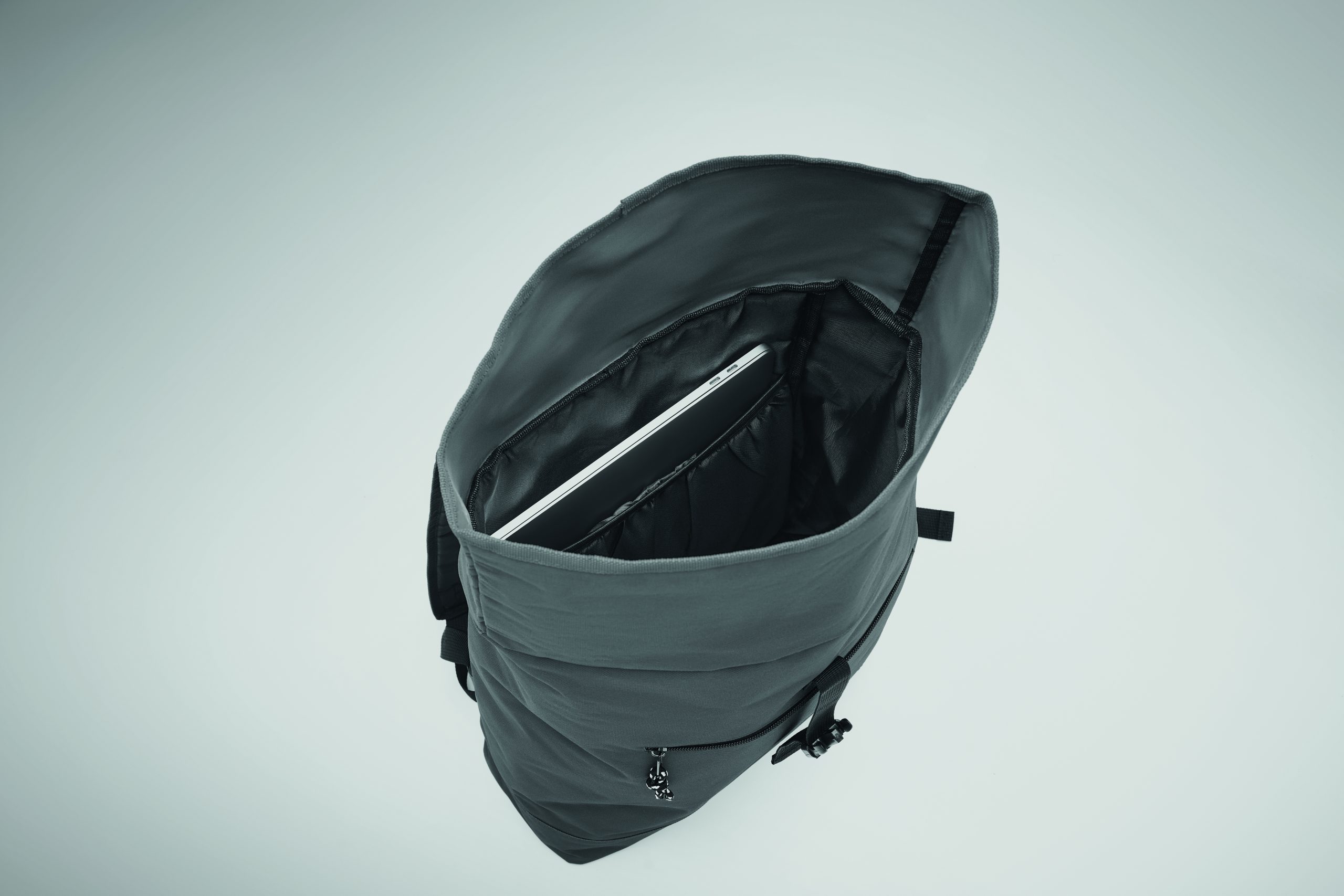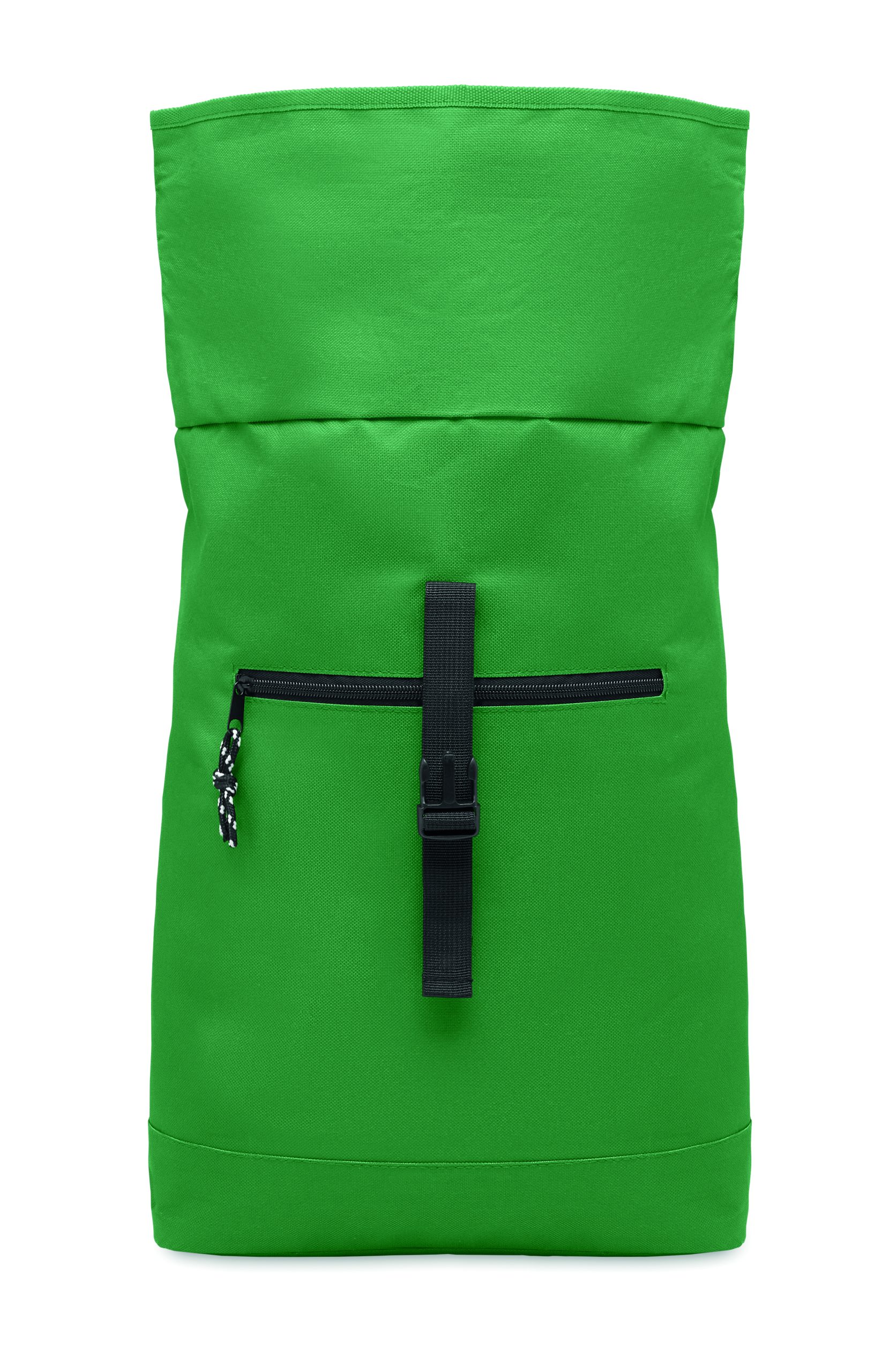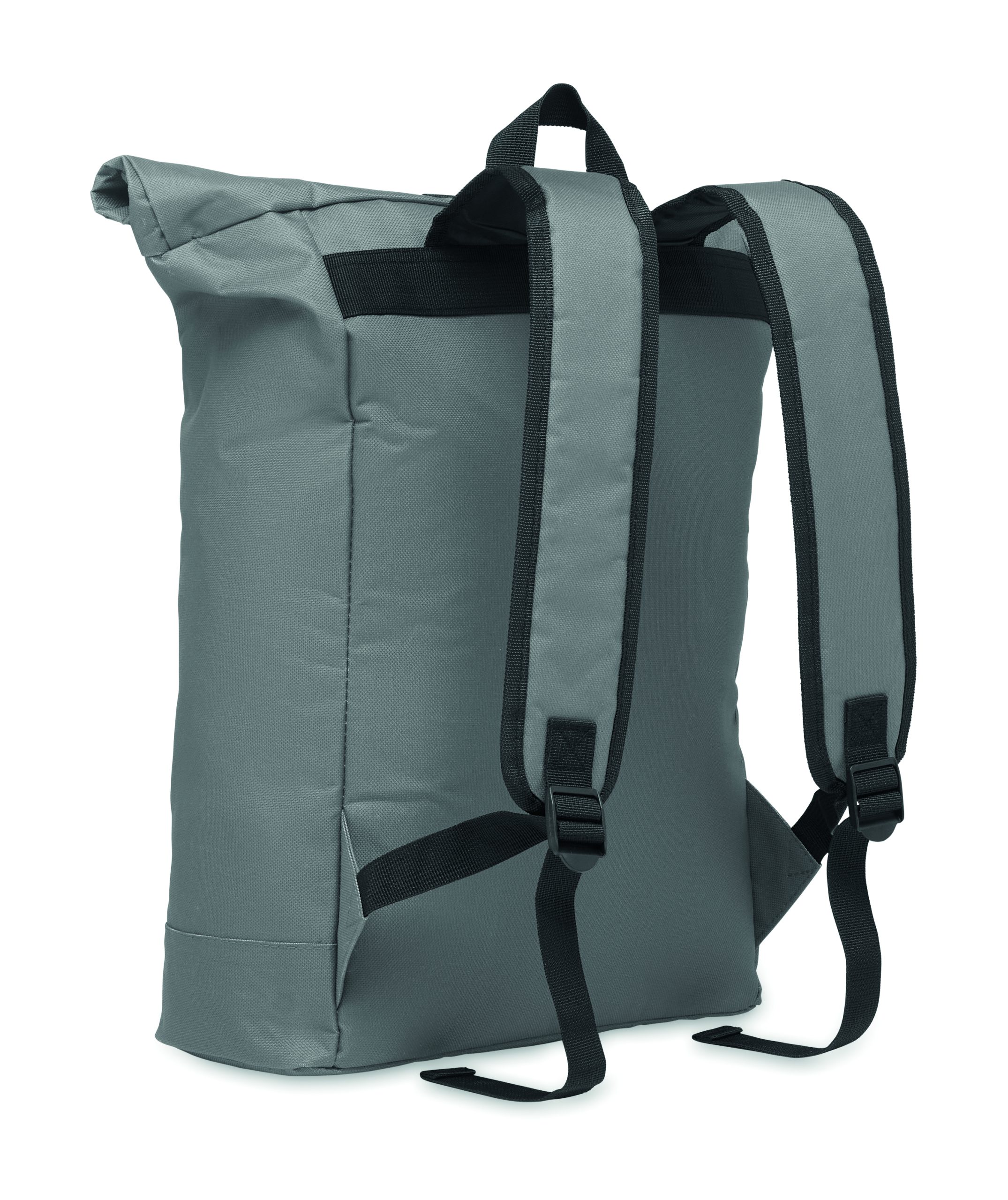 15-calowy zwijany plecak na laptopa typu rolltop z poliestru 600D z wyściełanym tyłem i wzmocnionym spodem. Przednia kieszeń zapinana na zamek. Podszewka 210D.