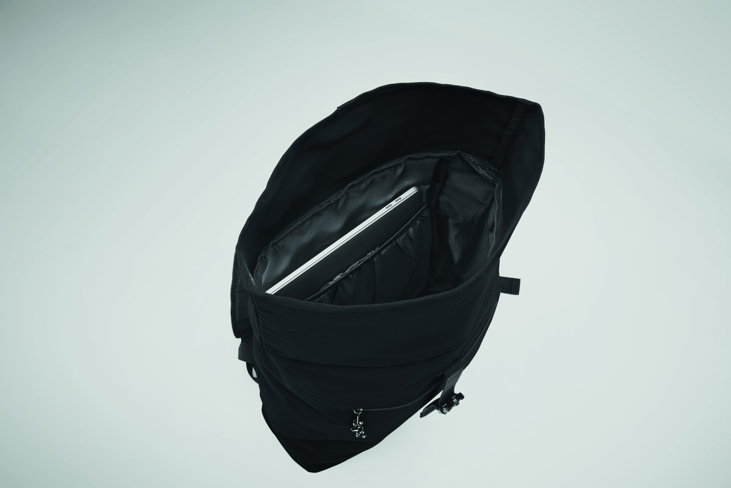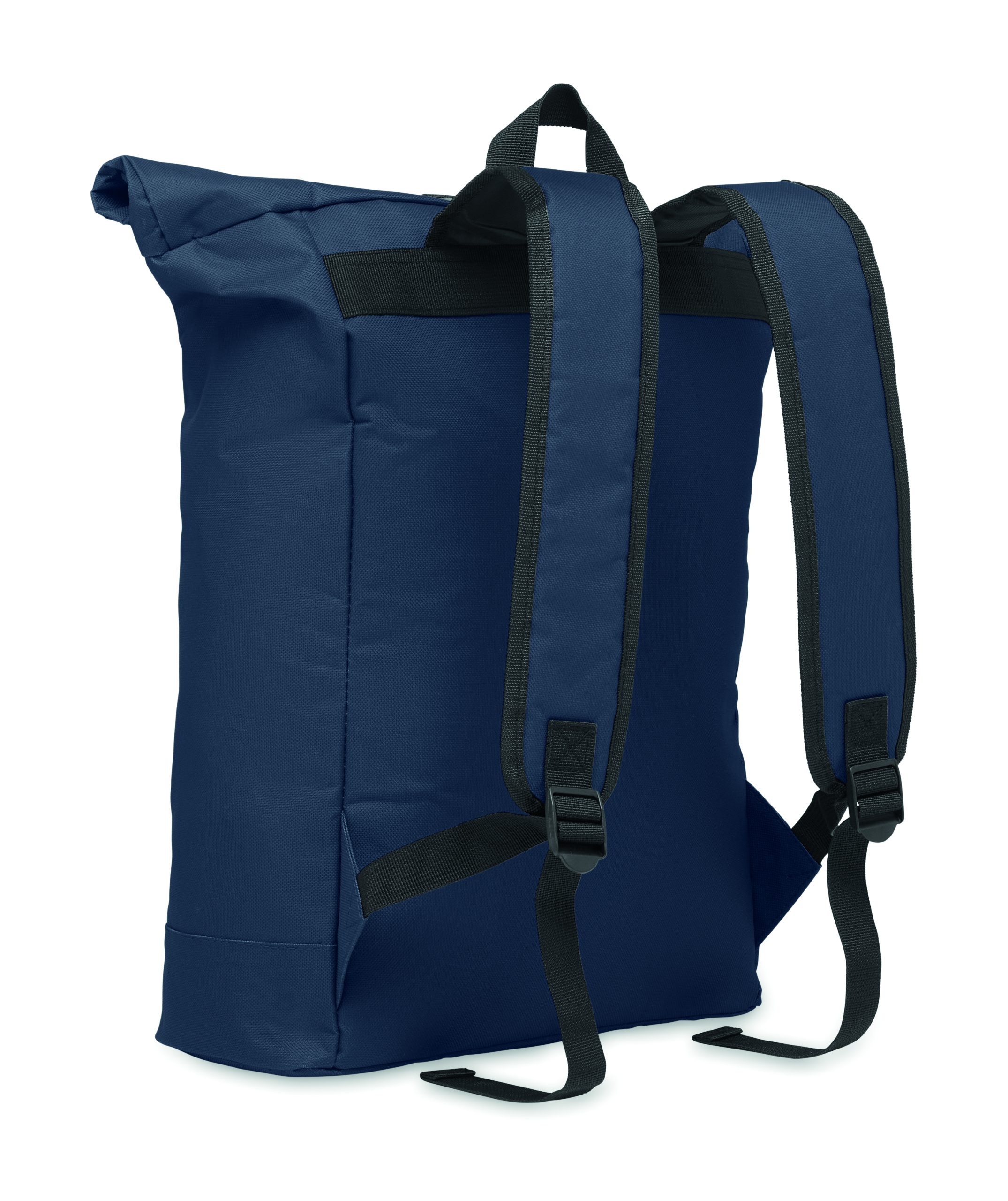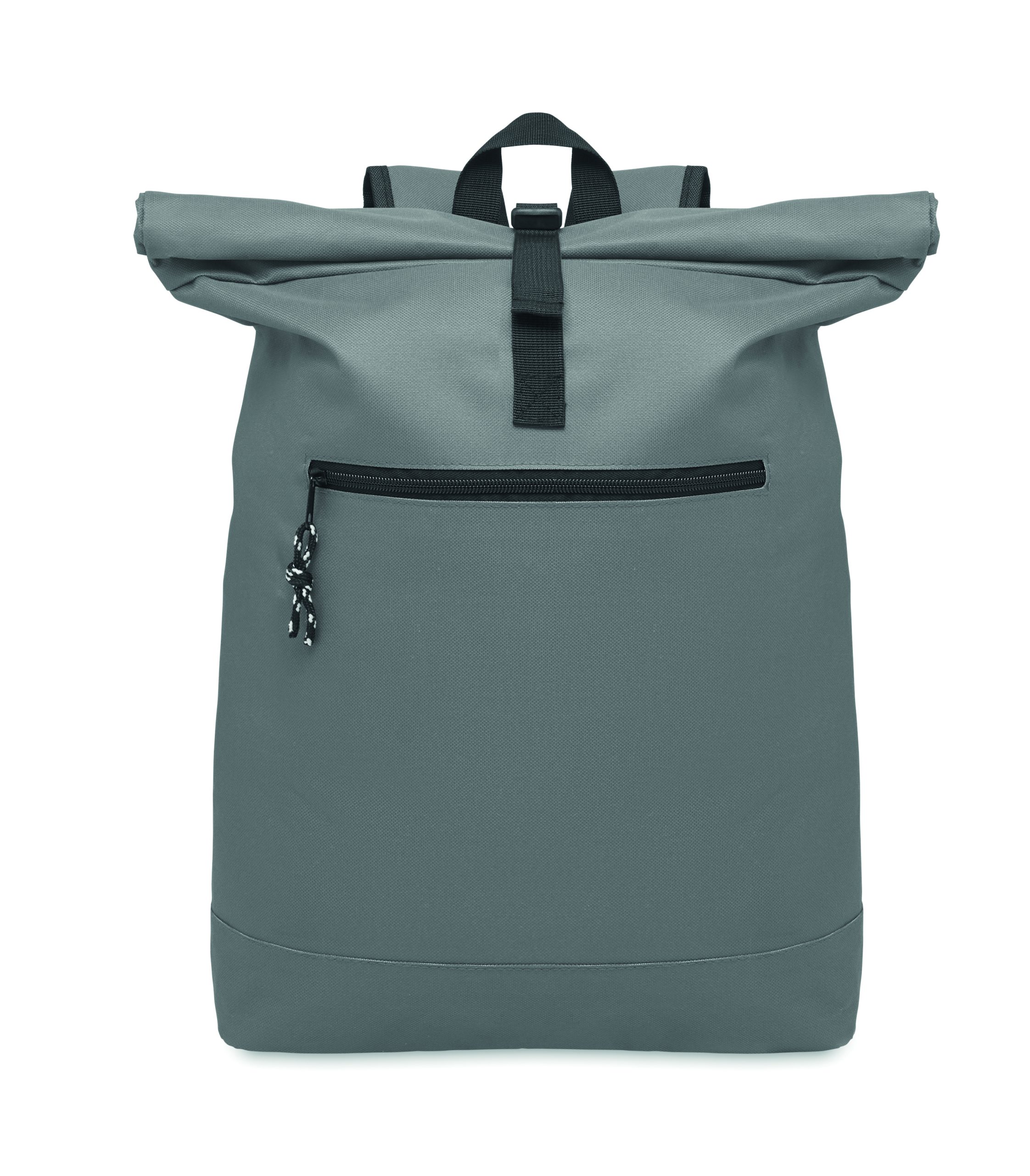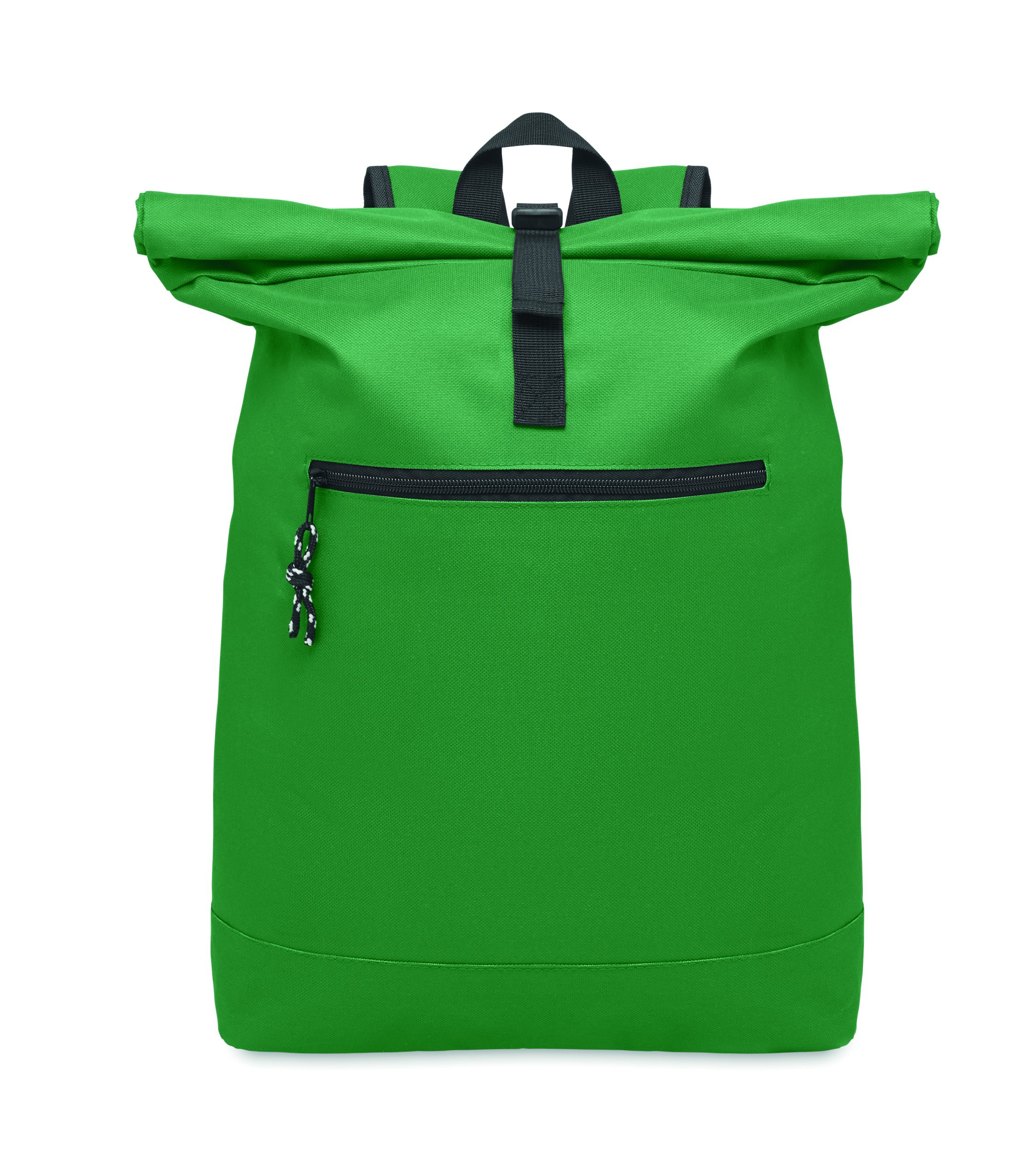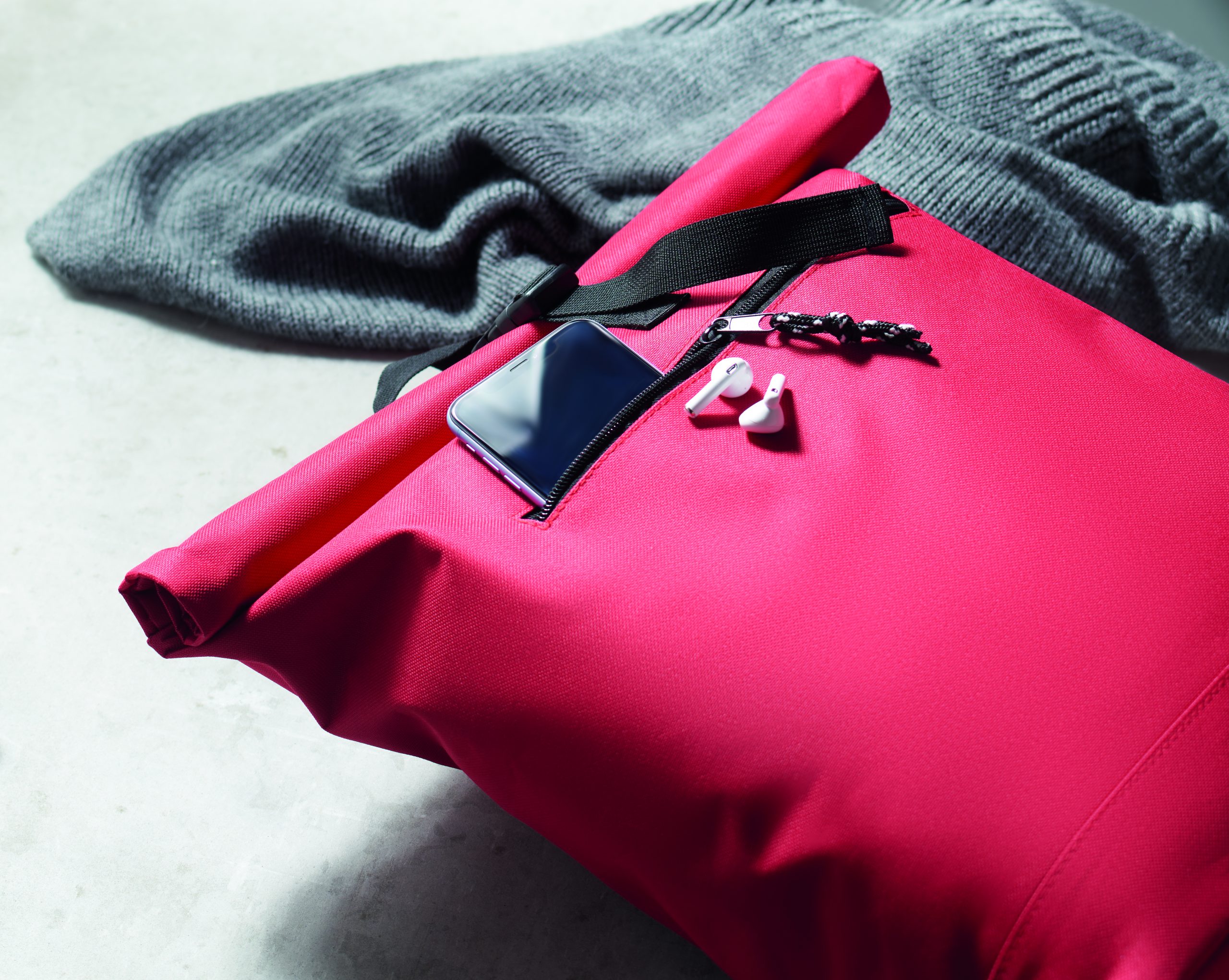 15-calowy zwijany plecak na laptopa typu rolltop z poliestru 600D z wyściełanym tyłem i wzmocnionym spodem. Przednia kieszeń zapinana na zamek. Podszewka 210D.