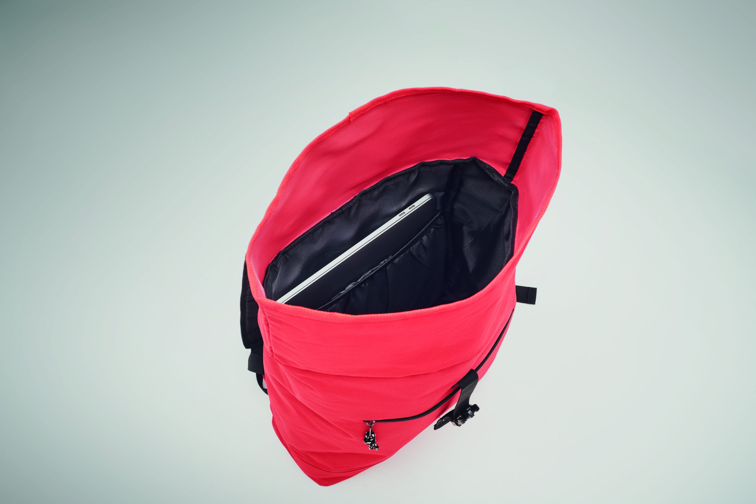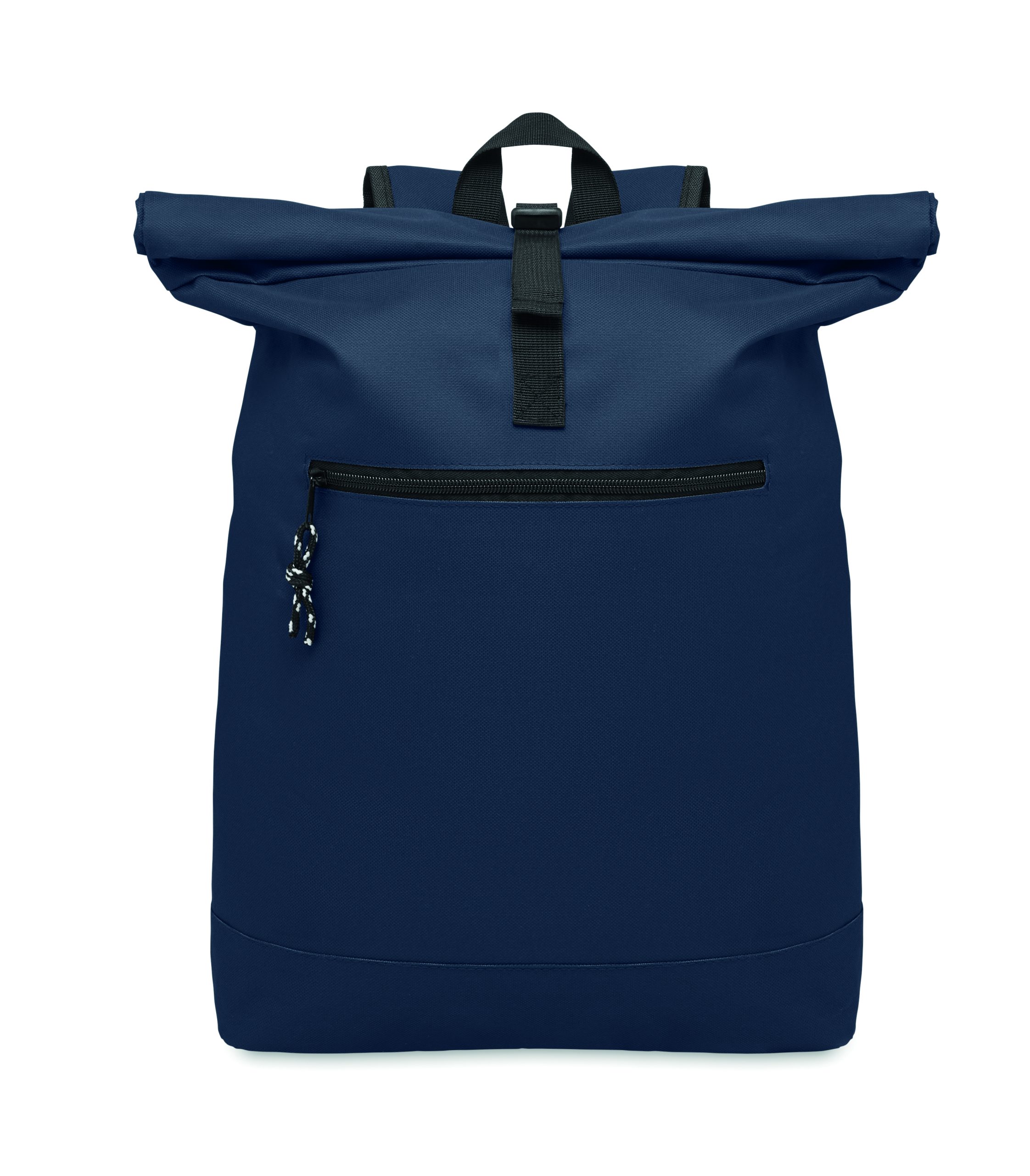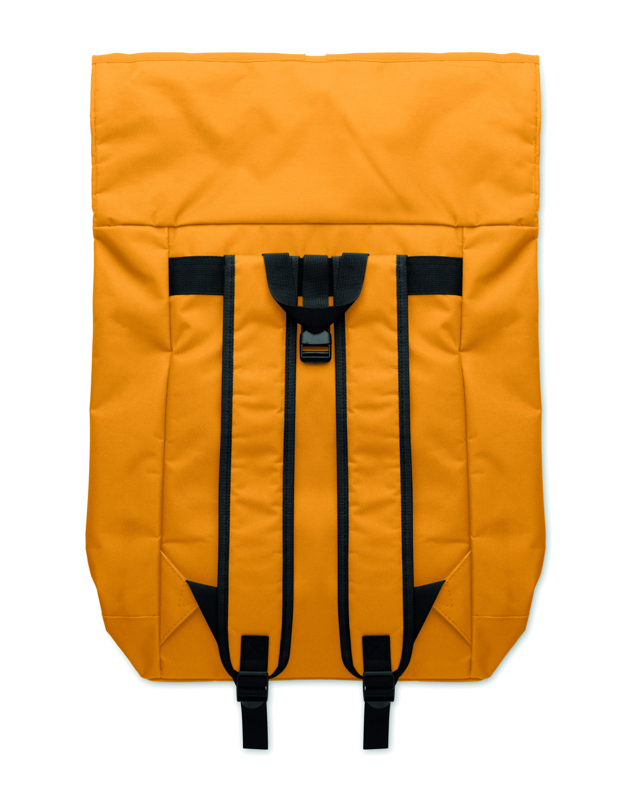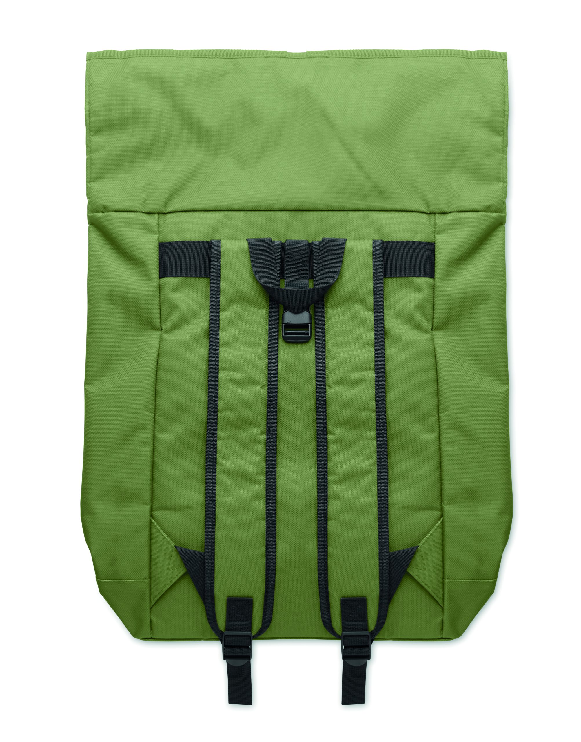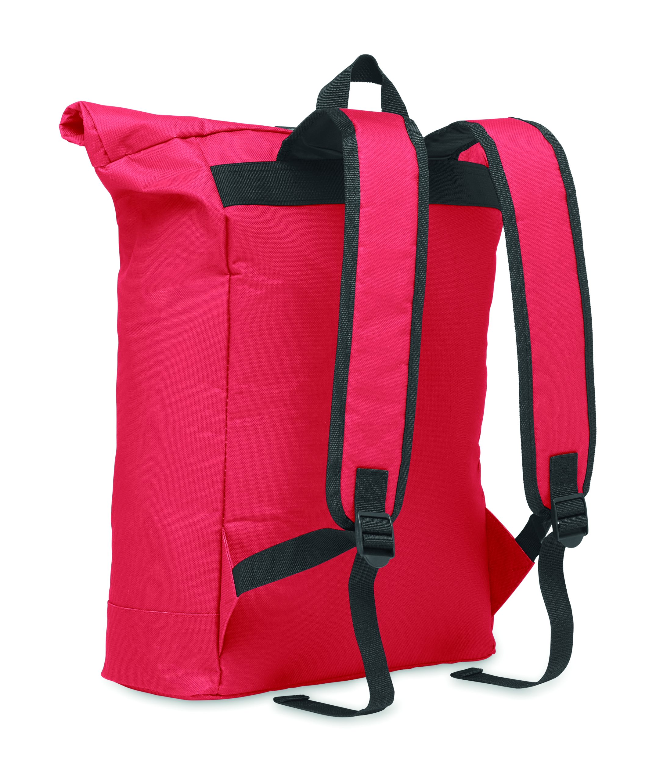15-calowy zwijany plecak na laptopa typu rolltop z poliestru 600D z wyściełanym tyłem i wzmocnionym spodem. Przednia kieszeń zapinana na zamek. Podszewka 210D.