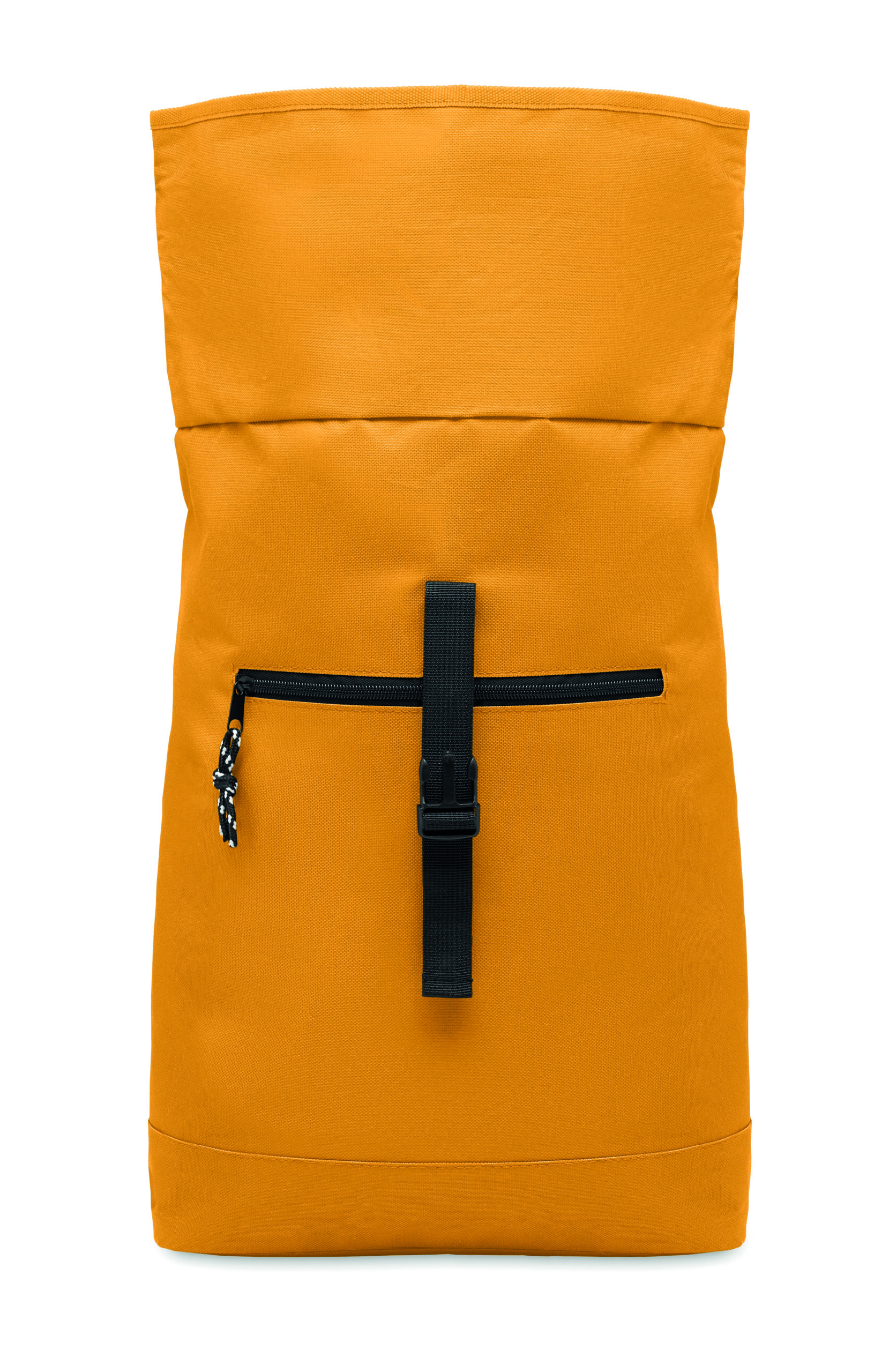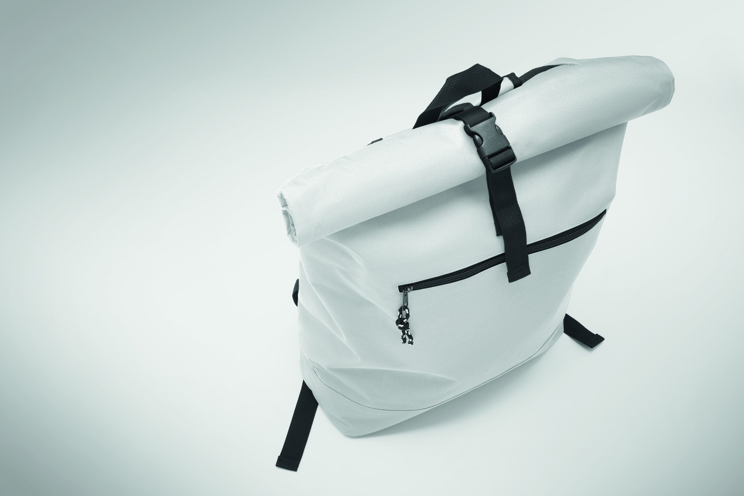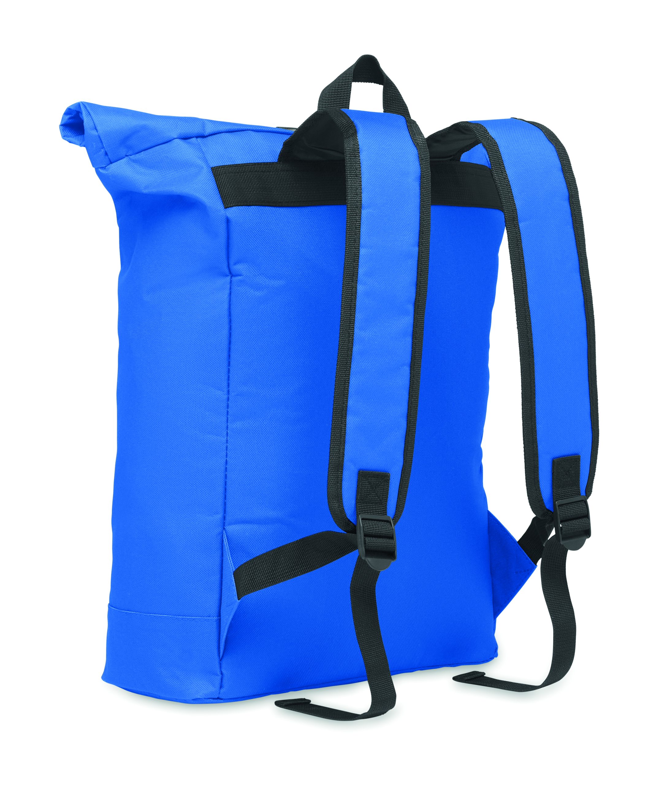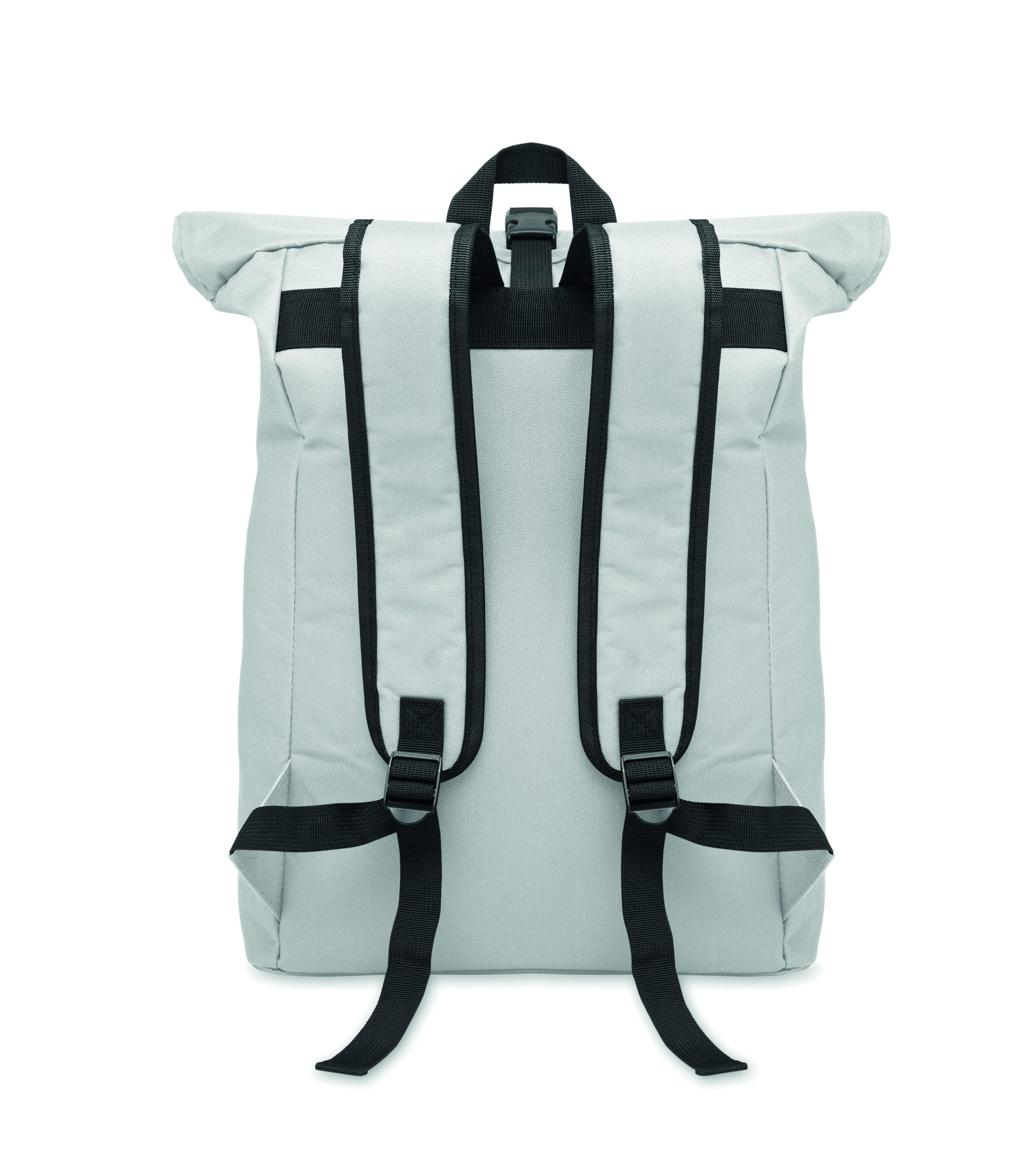 15-calowy zwijany plecak na laptopa typu rolltop z poliestru 600D z wyściełanym tyłem i wzmocnionym spodem. Przednia kieszeń zapinana na zamek. Podszewka 210D.